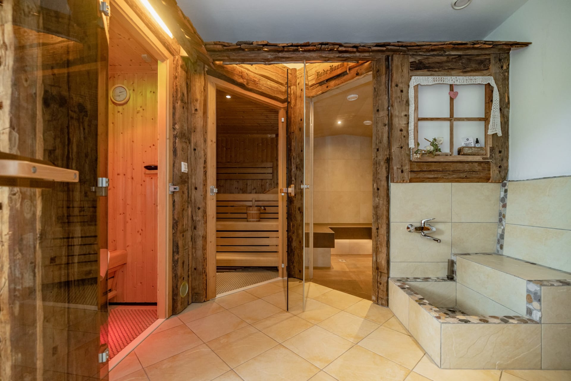 Nach aktiven Stunden in der Natur genießen Sie Wellness pur: unsere Sauna mit Infrarot- & Biofunktion, die Feuerwasser-Wanne auf der Terrasse und Ruhebereiche mit Ausblick sorgen für tiefe Entspannung.