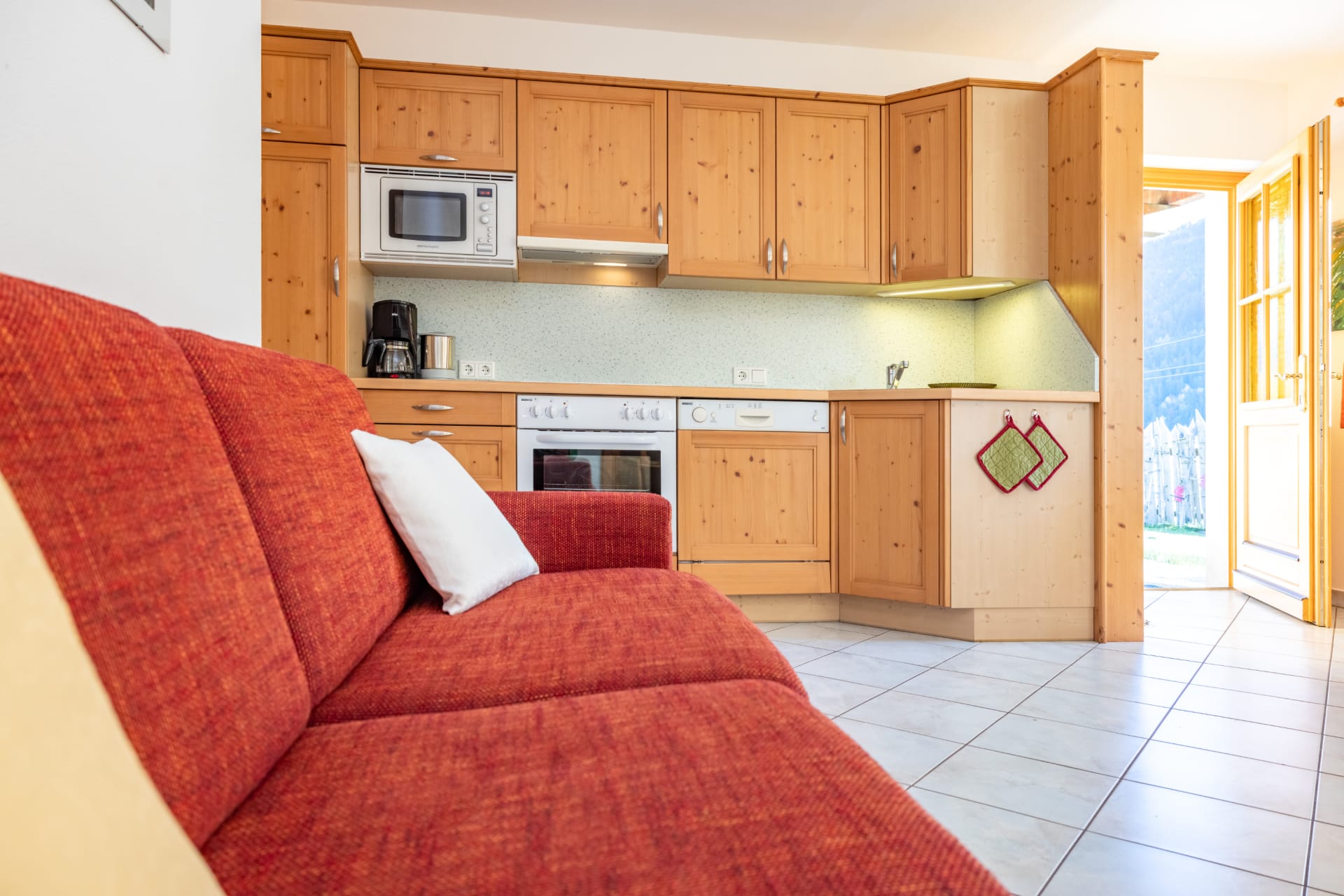 Die 46 m² große Wohnung „Frühling“ bietet komfortablen Raum für 1 bis 5 Personen und eignet sich ideal für Paare, Familien oder Gäste mit besonderen Ansprüchen an Barrierefreiheit. Sie verfügt über ein separates Schlafzimmer, einen Wohn-Schlafraum mit integrierter Küche, ein modernes Badezimmer sowie zwei Terrassen, die zum Entspannen einladen. Besonders hervorzuheben ist der private Gartenbereich direkt vor der Wohnung, der ausschließlich den Gästen dieser Einheit zur Verfügung steht. Die Wohnung ist barrierefrei und somit auch für Menschen mit eingeschränkter Mobilität bestens geeignet.