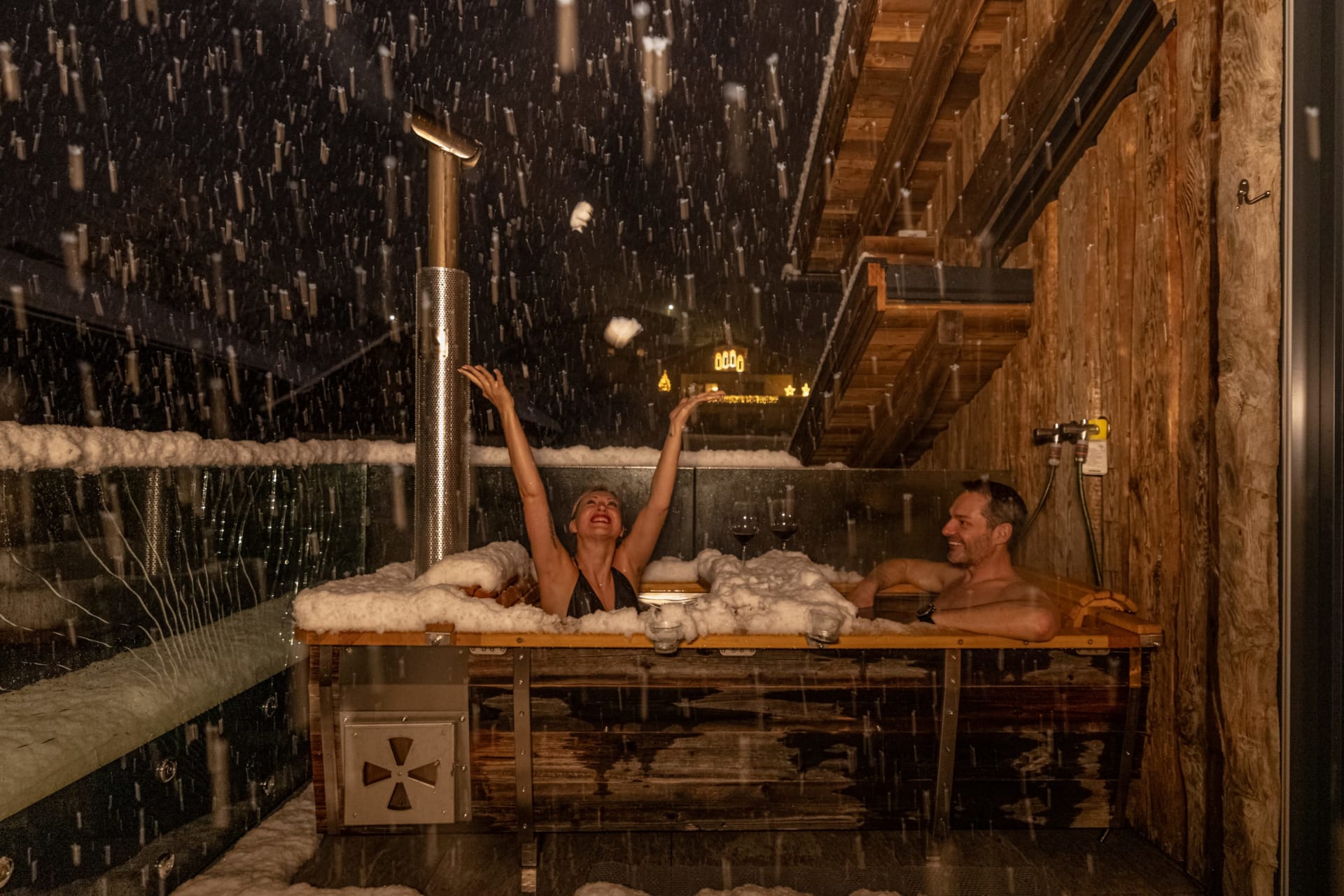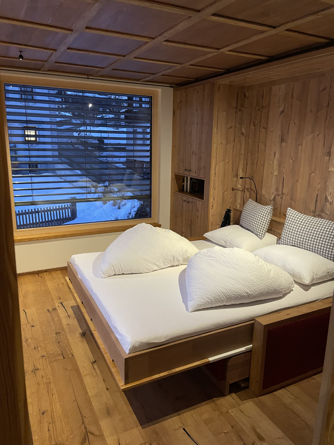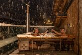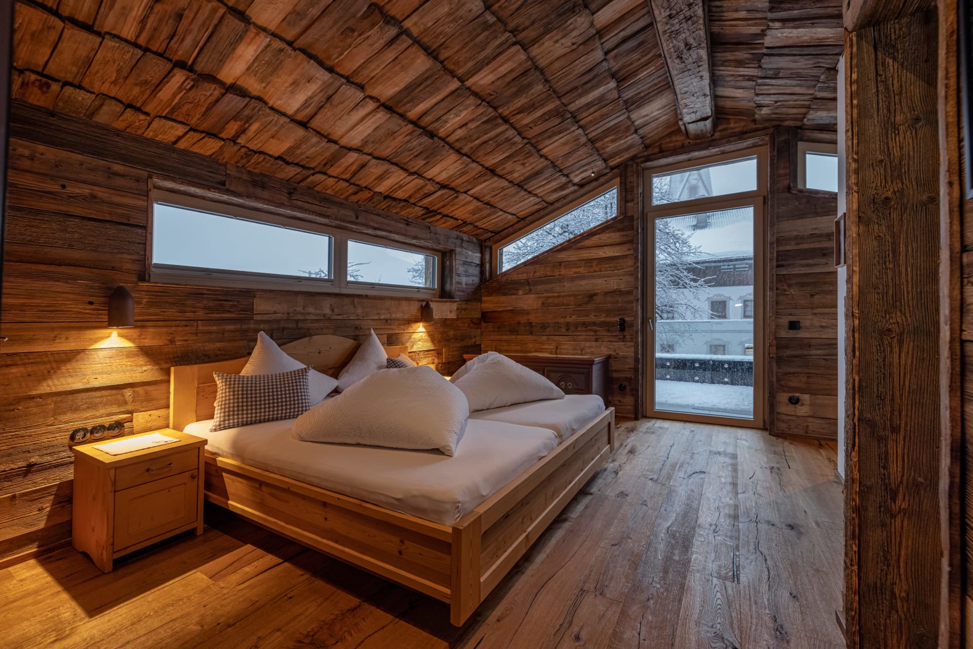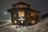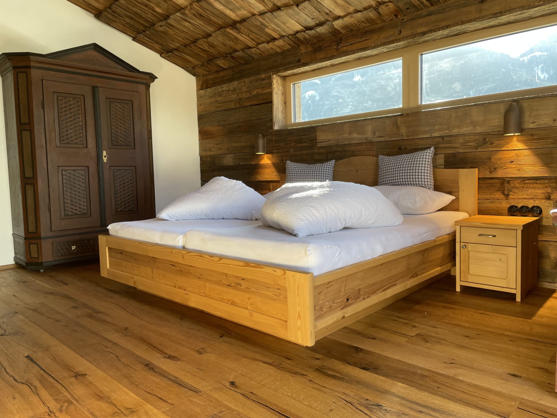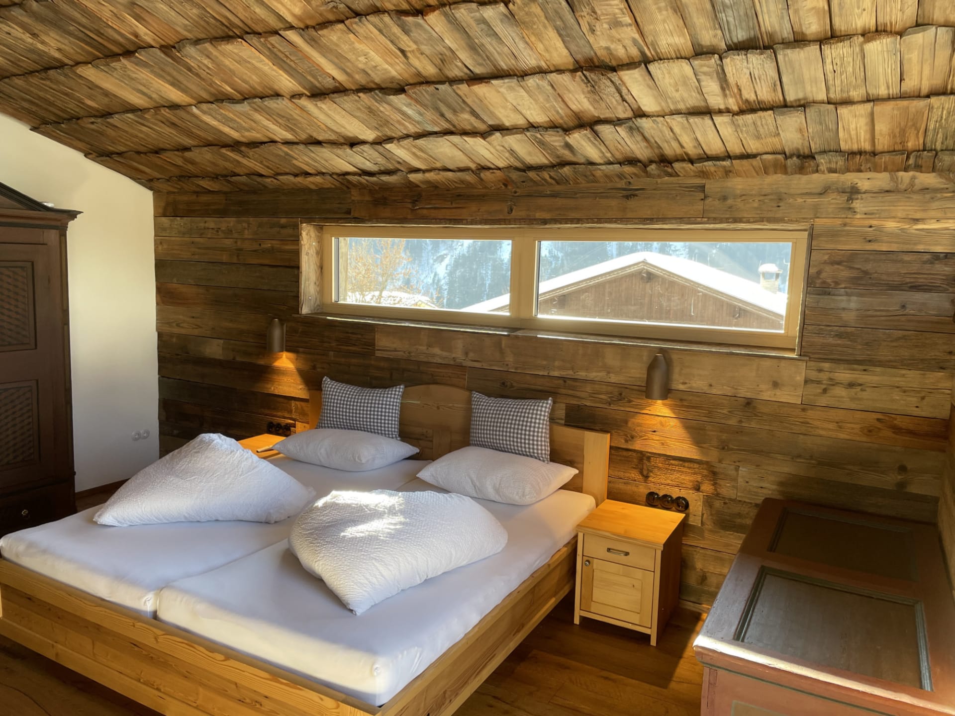 Uriges Chalet auf zwei Ebenen mit Master Bedroom mit großem Doppelbett und Blick auf die Berge, Dachterrasse vom Schlafzimmer mit Feuer-Wasser-Wanne und Liegen. Im Untergeschoß befindet sich eine große Terrasse mit Außensauna, komplett ausgestattete Küche, Wohnraum im Quader, Badezimmer mit Dusche, Doppelwaschbecken und separaten WC.