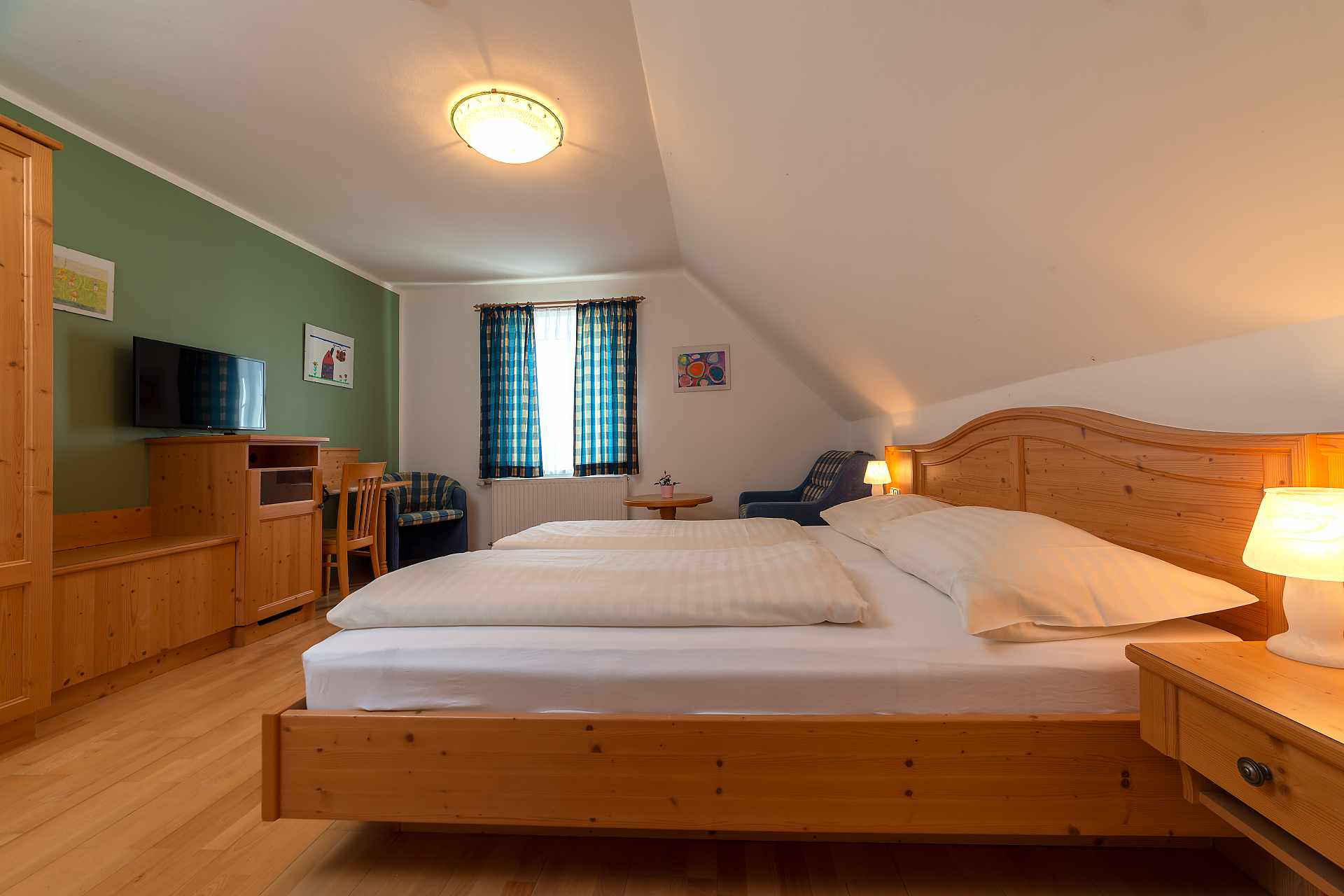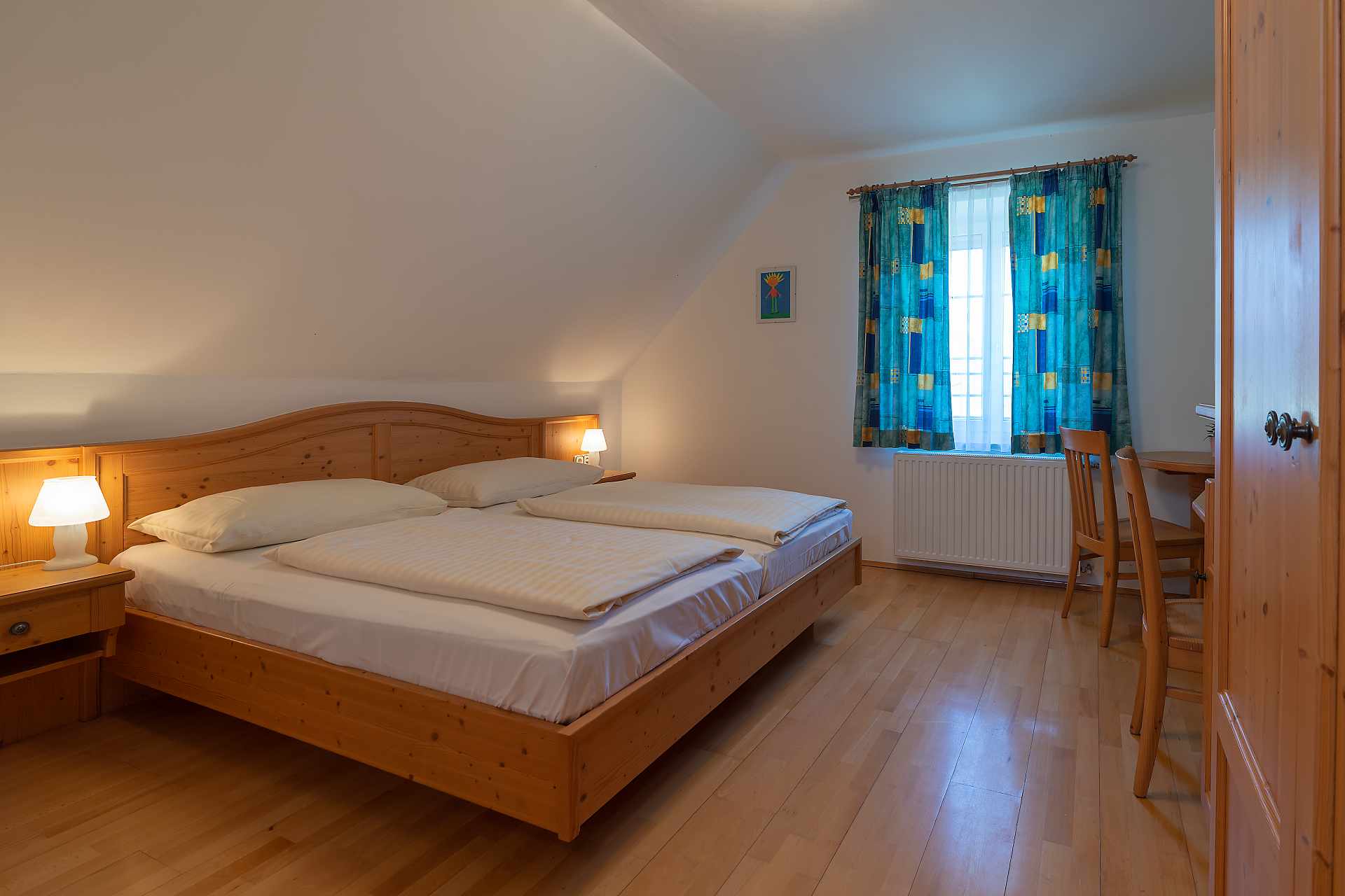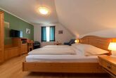 Einige Zimmer befinden sich im zweiten Stock des Haupthauses mit Blick Richtung See oder auf die Weide. Die anderen Zimmer befinden sich im Nebengebäude und haben einen Zugang über den Balkon (1 Stock), mit Blick auf den Hof. Sie erwartet: ein komfortables Mansardenzimmer mit einem Doppelbett und einem ausziehbaren Fauteuil, WLAN, Bad/WC, Sat-TV.