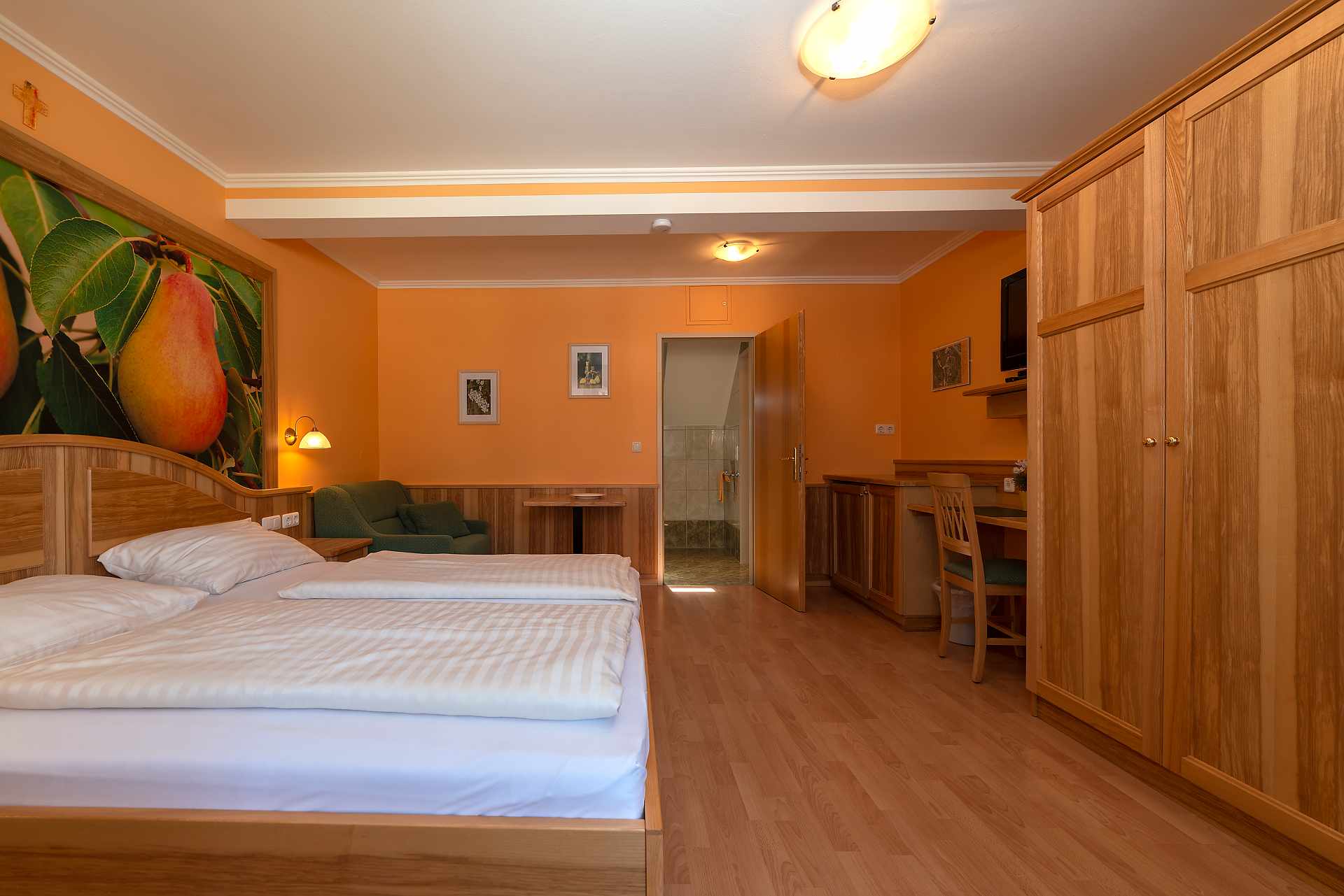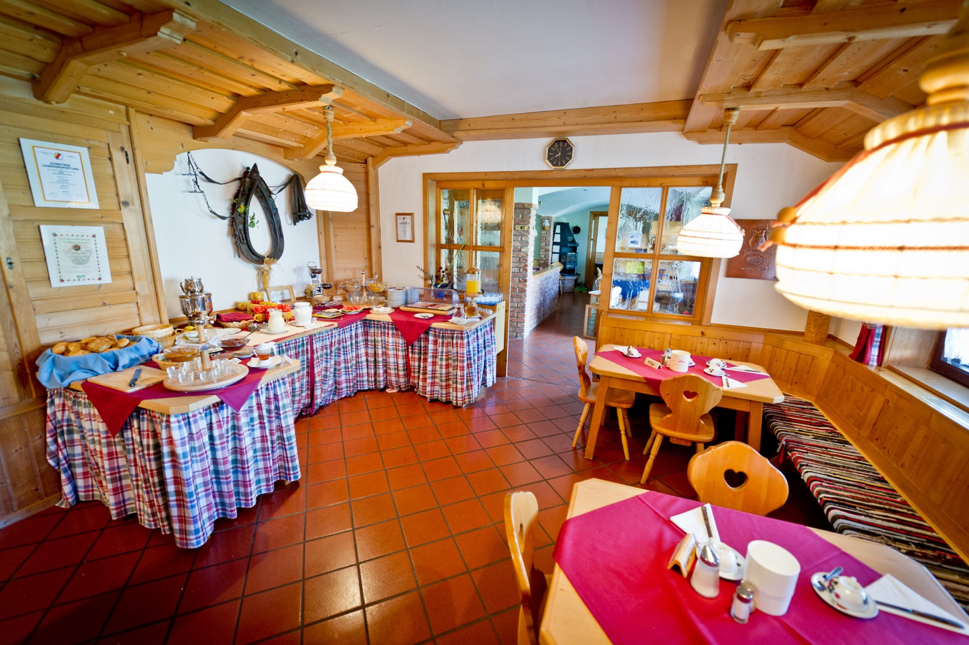Frühstücksbuffet mit unseren hausgemachten Produkten wie Schinken, Salami, Aufstriche, Joghurt verschiedenen Säften, ... Einmal in der Woche (donnerstags - von Mitte Juni bis Anfang September) findet der Grillabend für unsere Gäste statt.