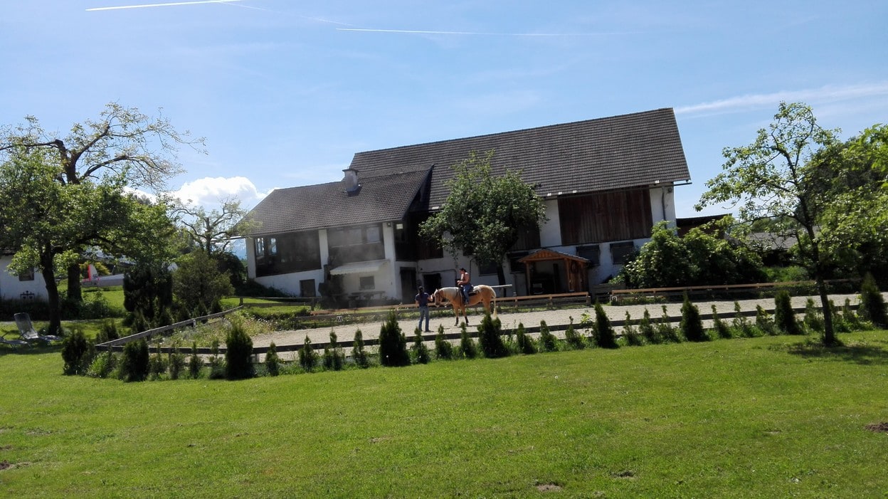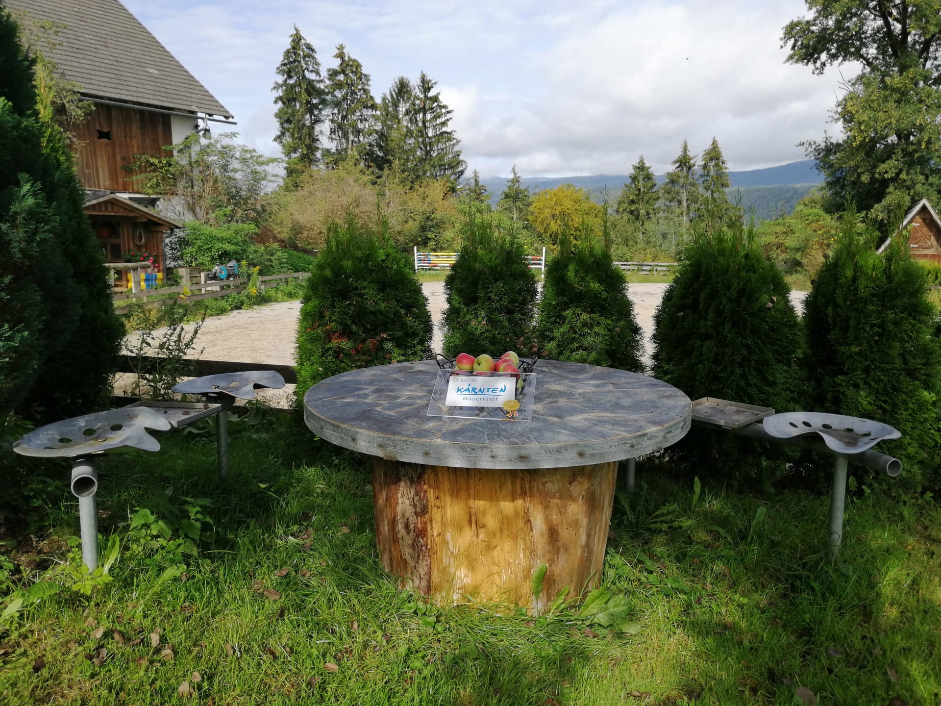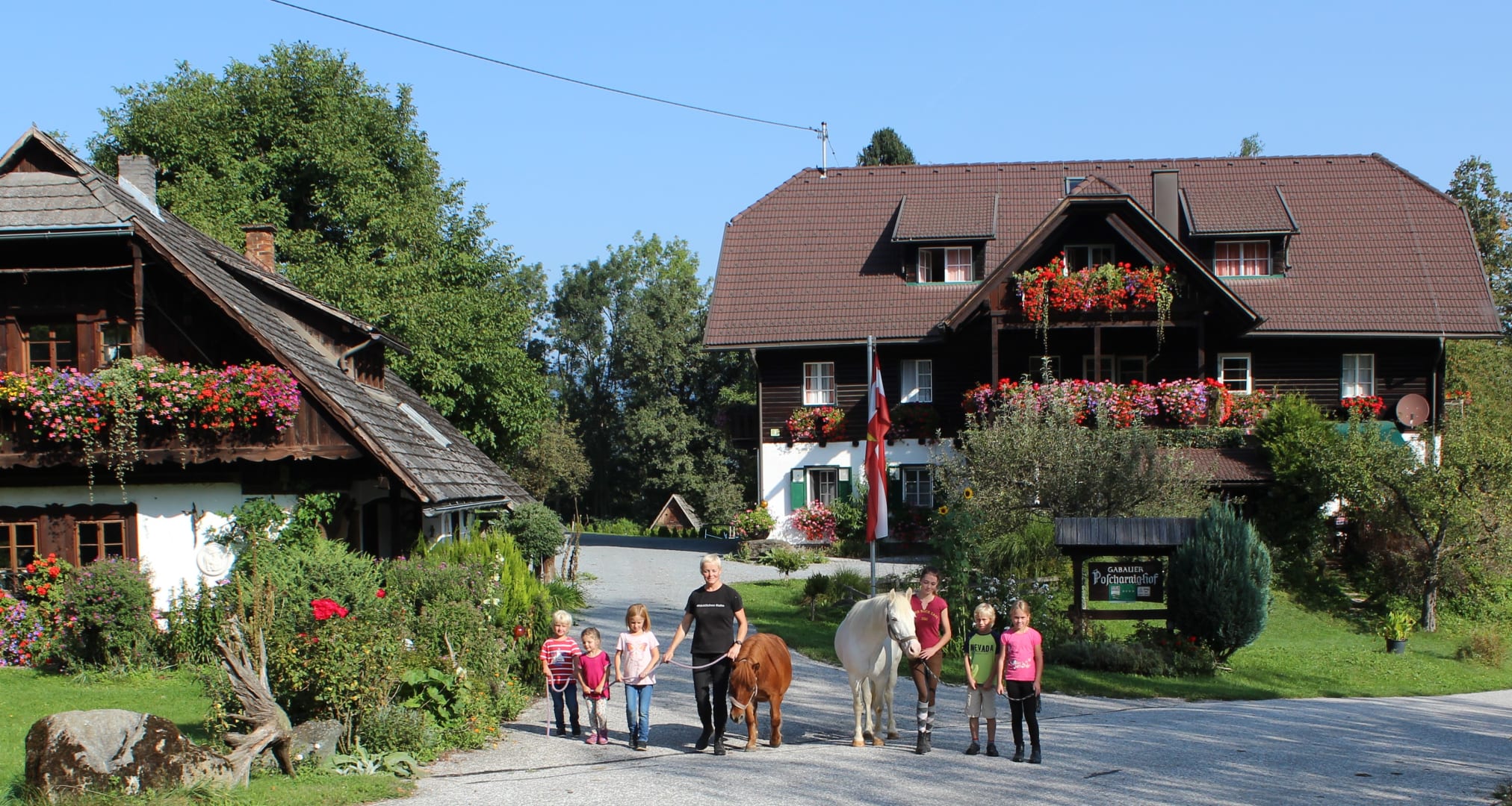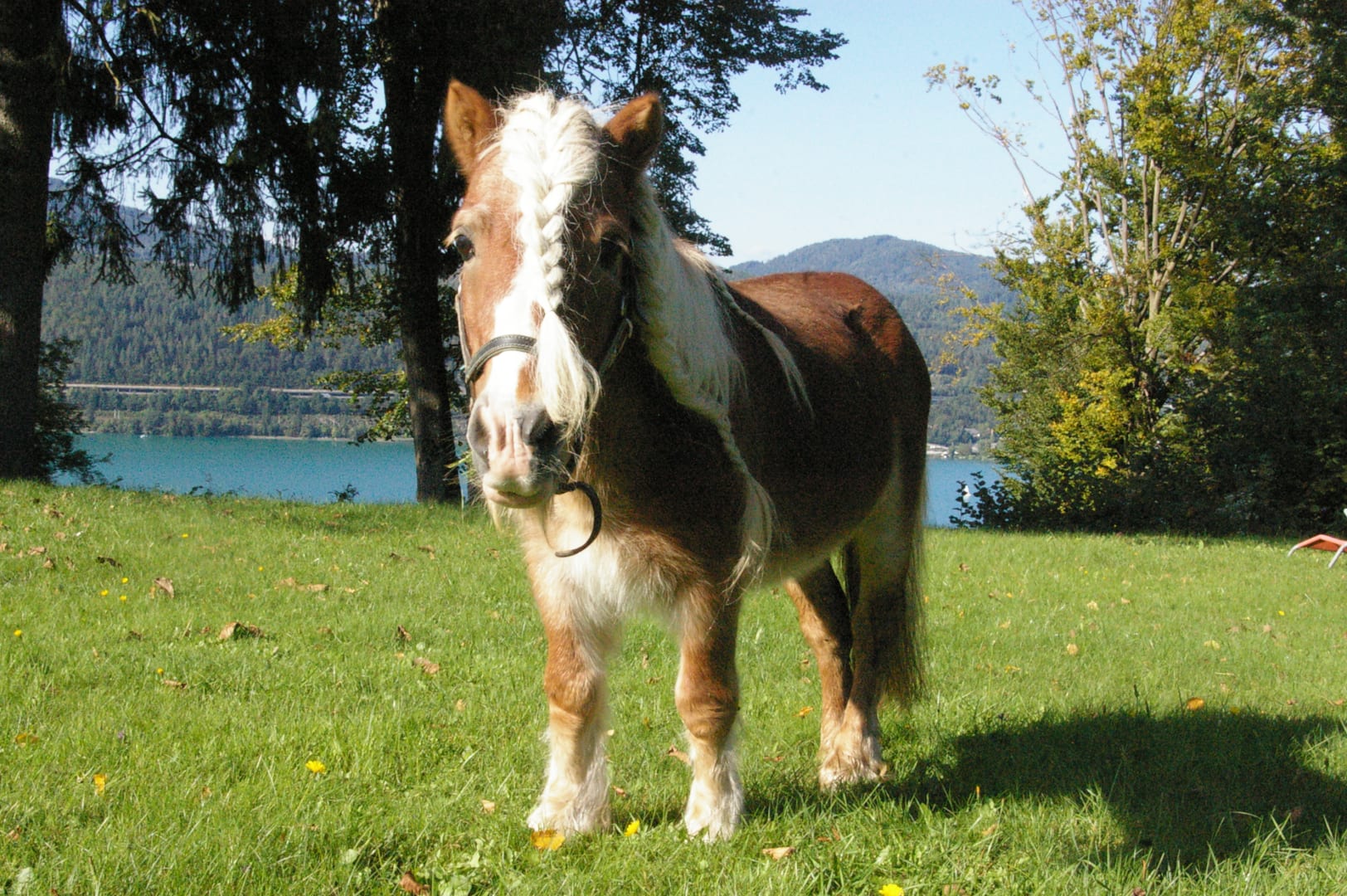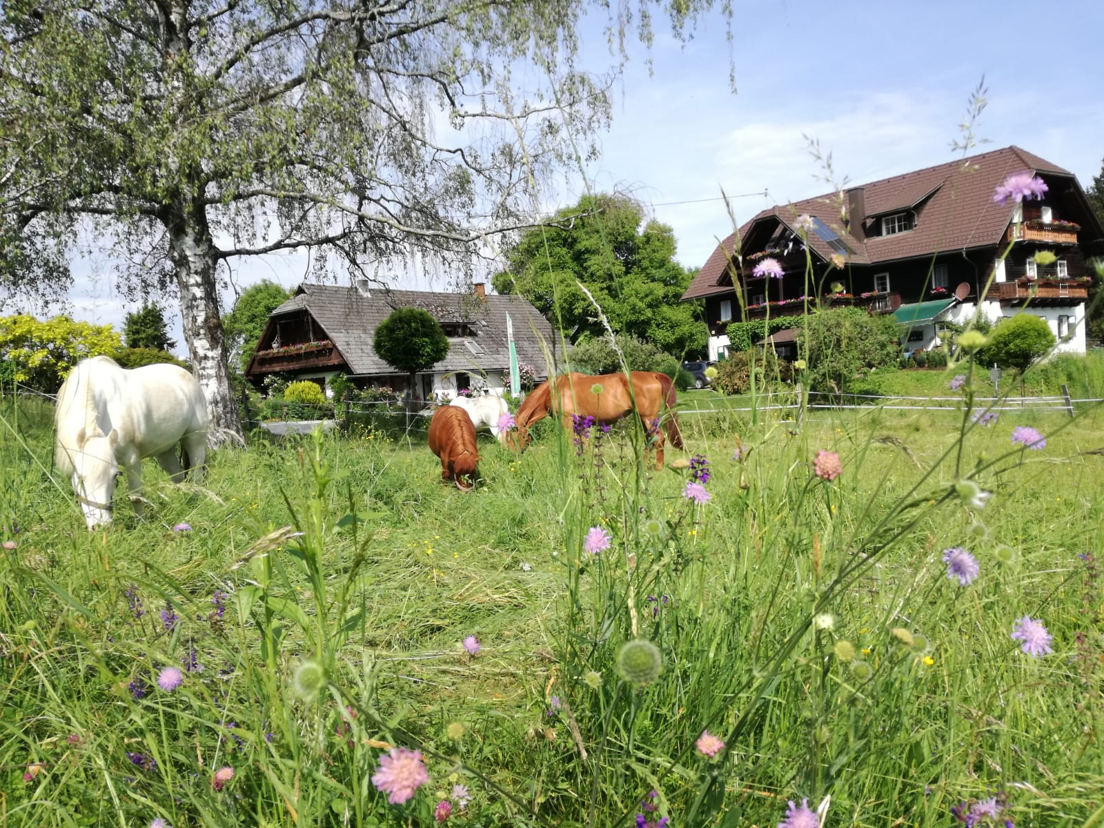 Abendsonnewohnung im 2. Stock mit großem Balkon nach Westen - wo man das Hofleben wunderbar miterleben kann. Man sieht den hofeigenen schönen Nussbaumplatz, die Hofkapelle und das Stallgebäude mit dem Reitplatz wo gleich dahinter der Wörthersee herausblitzt. Zusätzlich hat die Abendsonnewohnung eine mit Glaseinbau überdachte Dachterrasse nach Süden ausgerichtet mit Tisch und Stühlen und zwei bequeme Liegestühle zugehörig zum Zweibettzimmer Mittagssonne mit SAT-TV, Dusche und kleiner Küche. Von dieser Dachterrasse aus sieht man auf das hauseigene Biotop, Pferdewiese und den Nachbarhof, der Blick schweift weiter zum hofeigenen blumengeschmückten Bauernhaus - die Residenz der Großeltern. Die Abendsonnewohnung hat eine gemütliche Wohn-/Essküche, eine Pantryküche , zwei SAT-TV, drei separate Schlafräumen für bis zu 6 Personen, zwei Duschen und ein separates WC.