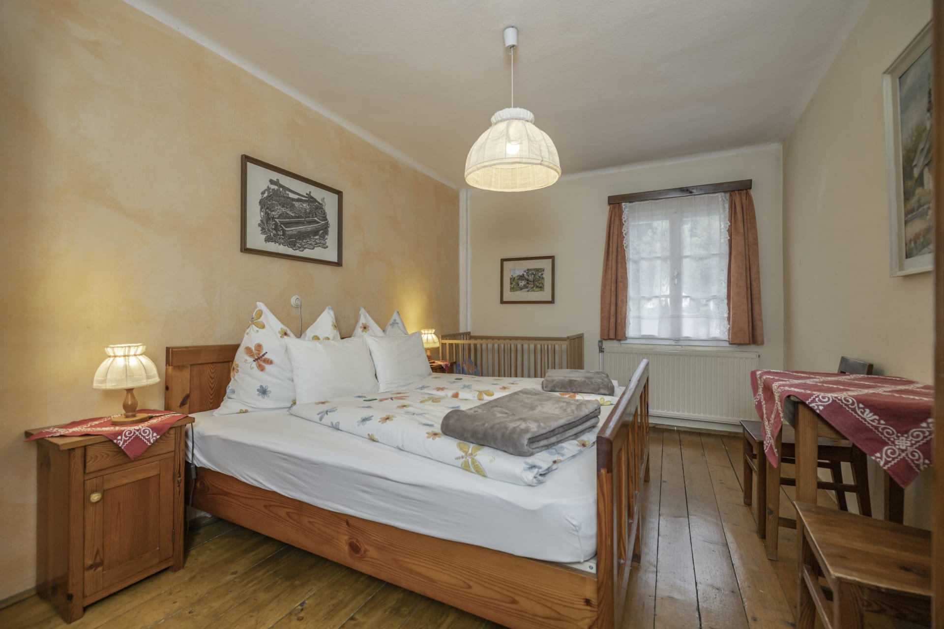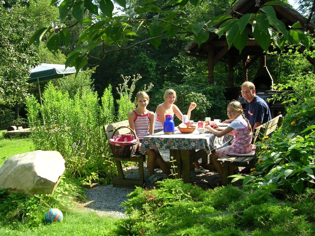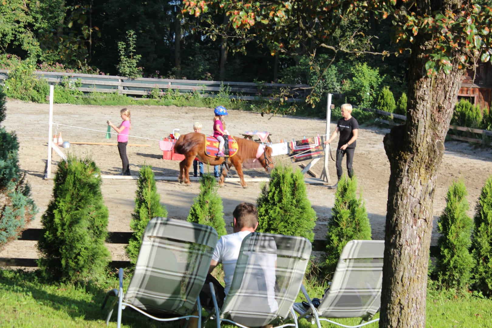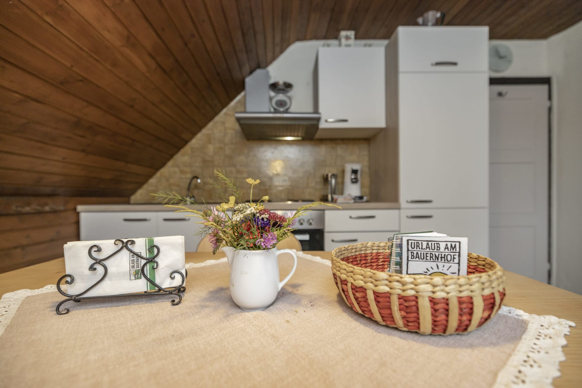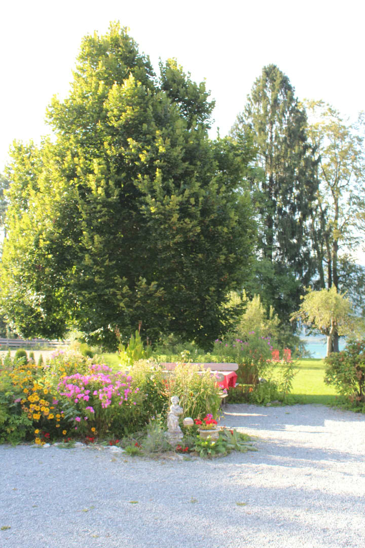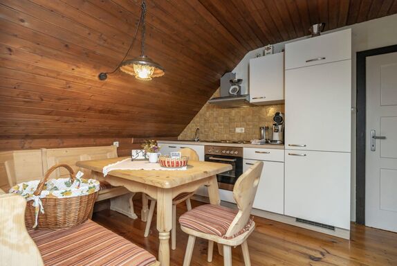 Abendsonnewohnung im 2. Stock mit großem Balkon nach Westen - wo man das Hofleben wunderbar miterleben kann. Man sieht den hofeigenen schönen Nussbaumplatz, die Hofkapelle und das Stallgebäude mit dem Reitplatz wo gleich dahinter der Wörthersee herausblitzt. Zusätzlich hat die Abendsonnewohnung eine mit Glaseinbau überdachte Dachterrasse nach Süden ausgerichtet mit Tisch und Stühlen und zwei bequeme Liegestühle zugehörig zum Zweibettzimmer Mittagssonne mit SAT-TV, Dusche und kleiner Küche. Von dieser Dachterrasse aus sieht man auf das hauseigene Biotop, Pferdewiese und den Nachbarhof, der Blick schweift weiter zum hofeigenen blumengeschmückten Bauernhaus - die Residenz der Großeltern. Die Abendsonnewohnung hat eine gemütliche Wohn-/Essküche, eine Pantryküche , zwei SAT-TV, drei separate Schlafräumen für bis zu 6 Personen, zwei Duschen und ein separates WC.