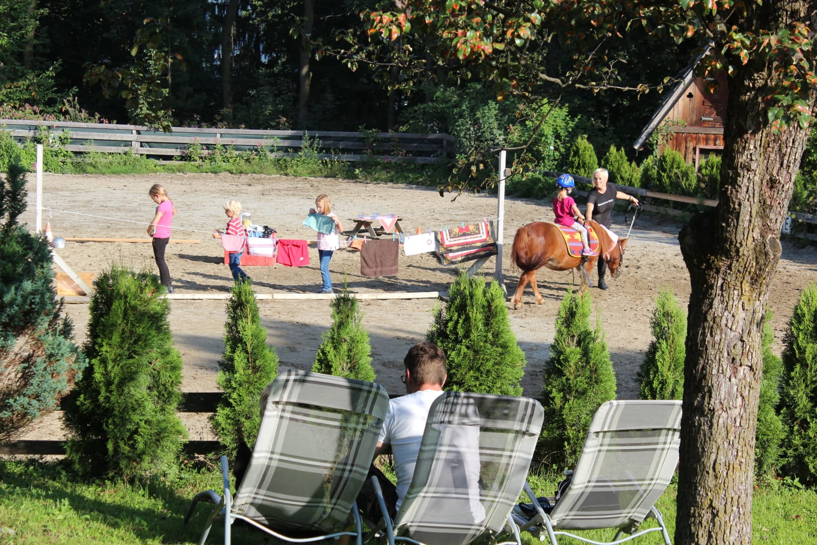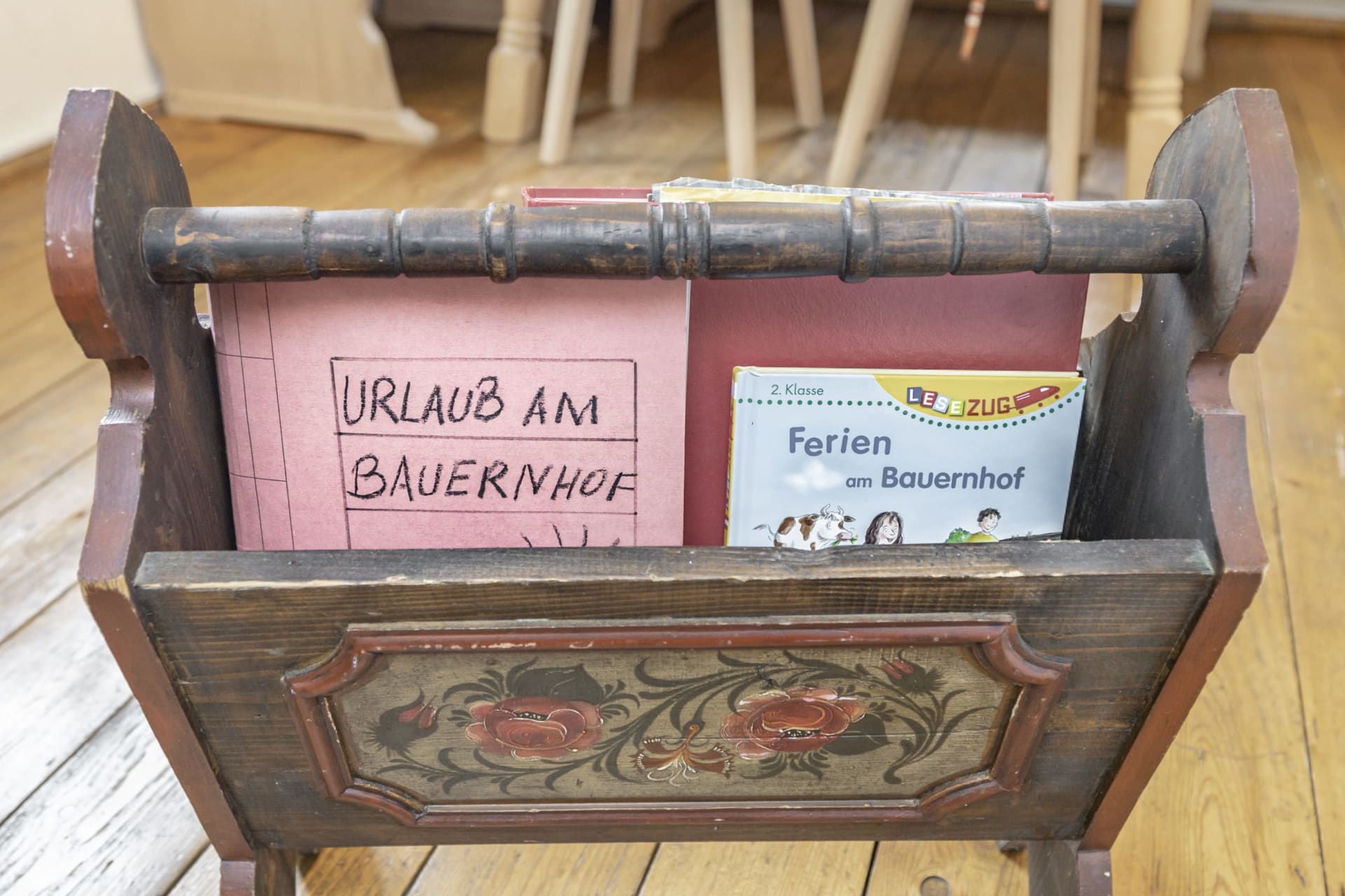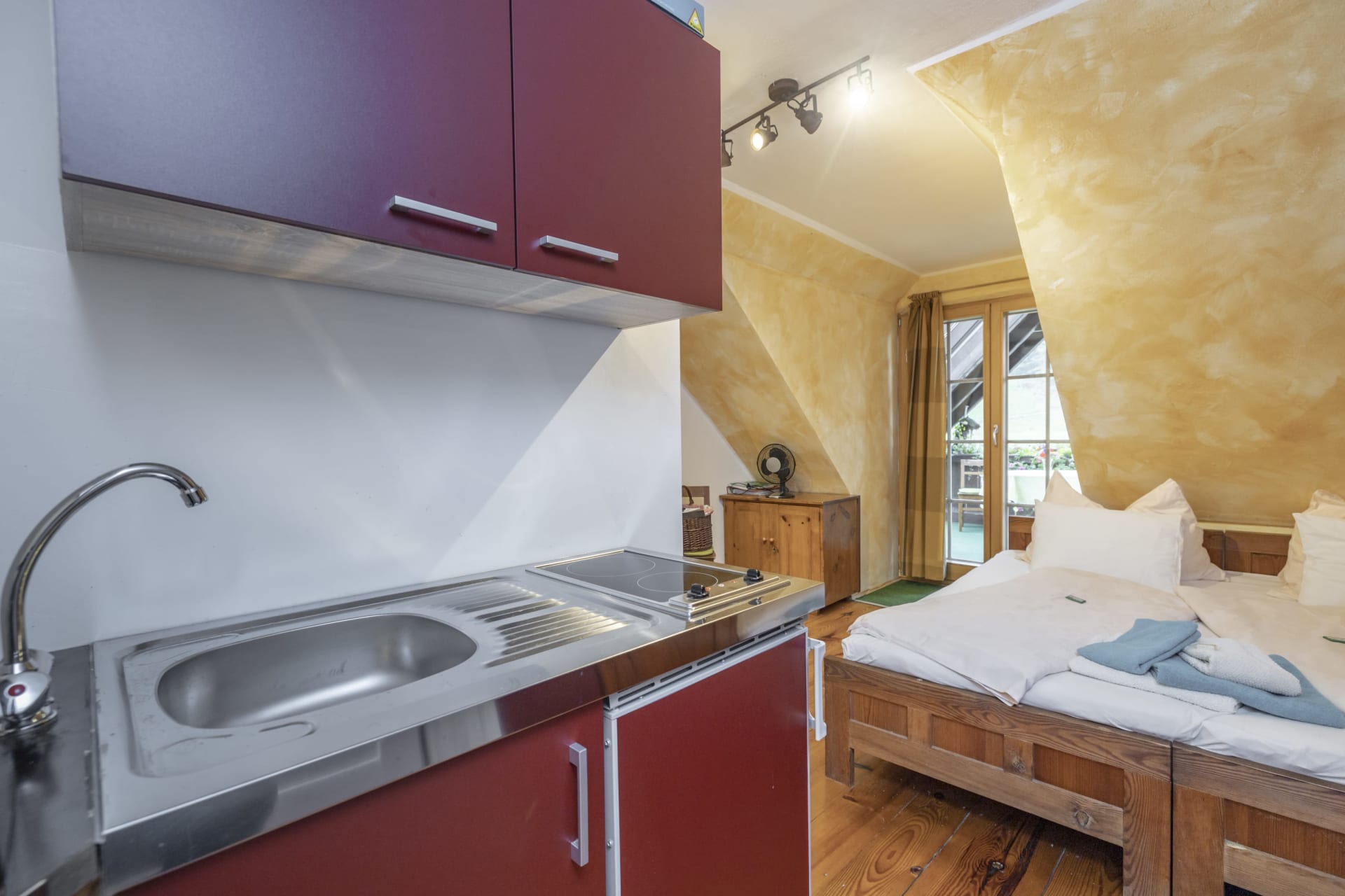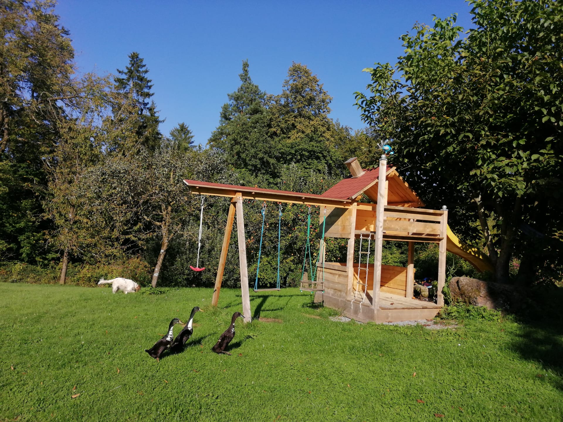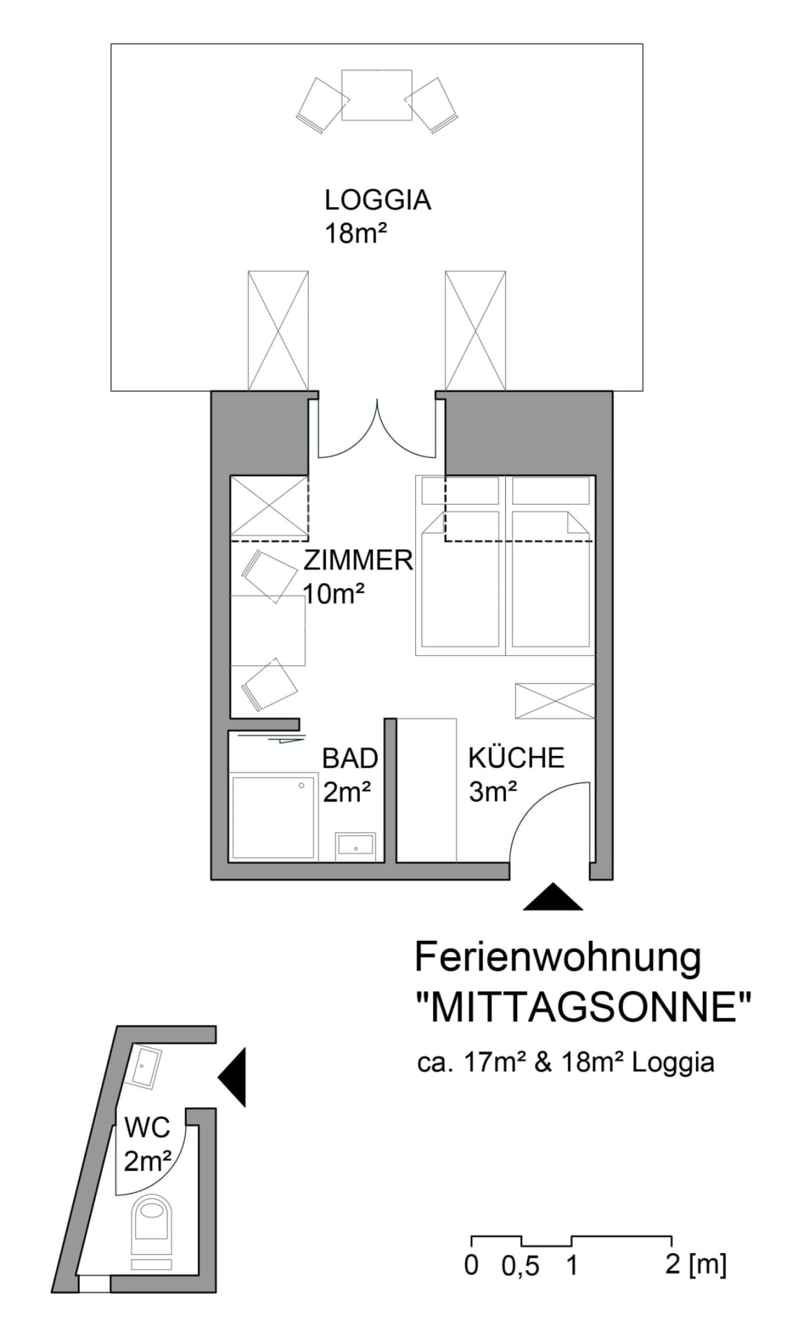Mittagsonnewohnung im 2. Stock ist sehr effizient und praktisch für 1 bis 2 Personen ausgestattet mit Wohn-/Schlafzimmer gut ventiliert und abgeteiltem Sanitärbereich, wobei sich das WC außerhalb am Gang befindet. Es gibt eine Pantryküche mit 2 Kochplatten, Spüle, ***Kühlschrank, Mikrowelle mit Backfunktion, Wasserkocher, Mixer, Stabmixer und ausreichend Geschirr, SAT-TV und einen großzügig teilweise mit Glaseinbau überdachten Balkon nach Süden ausgerichtet mit einem runden Tisch und 2 Sessel. Vom Balkon aus sieht man auf das hauseigene Biotop, Pferdewiese und den Nachbarhof, der Blick schweift weiter zum hofeigenen blumengeschmückten Bauernhaus - die Residenz der Großeltern.