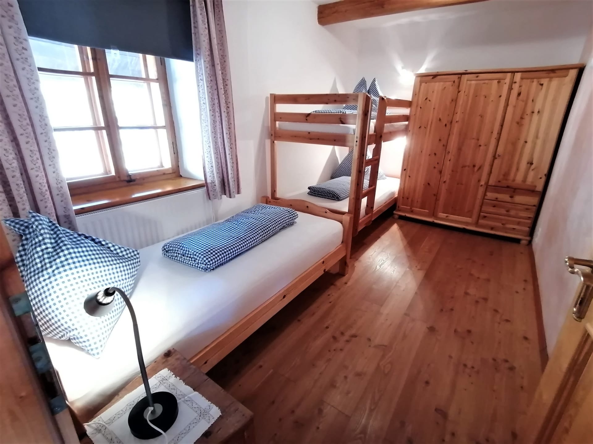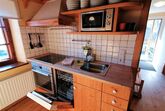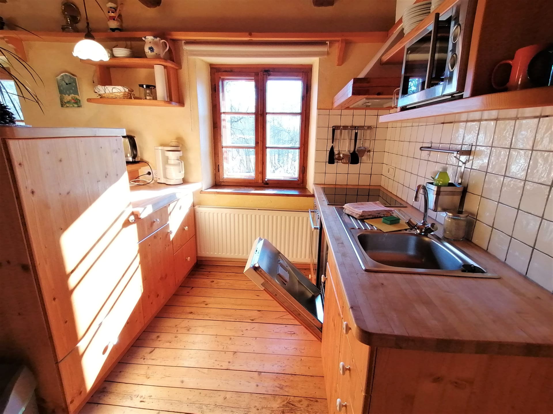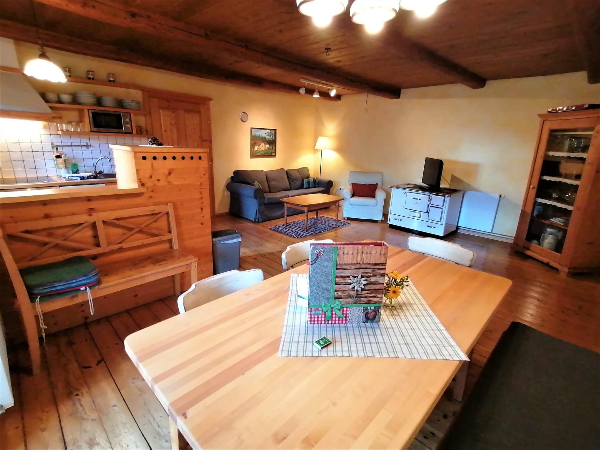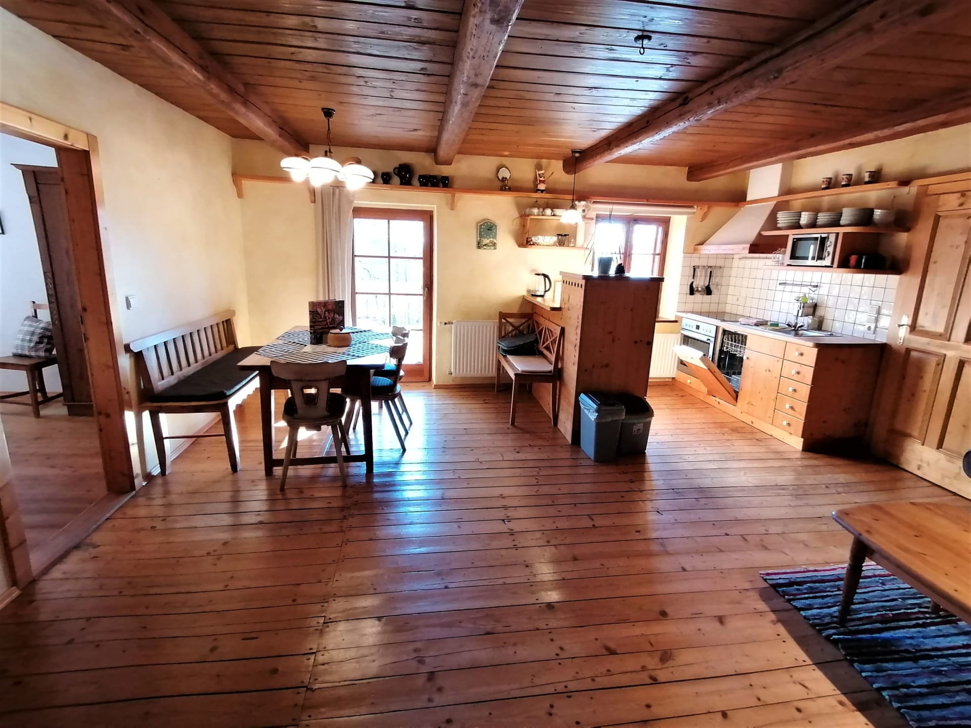 In dieser Ferienwohnung erwartet dich eine gemütliche, große Wohnstube mit einem Esstisch, einer bequemen Sitzecke mit Fernseher, Kinderzimmer mit einem Stockbett und einem Einzelbett, Schlafzimmer mit Doppelbett und ein kleines Schlafzimmer mit französischem Doppelbett (180cm breit). Außerdem einem komfortablen und gut ausgestatteten Kochbereich in Massivholz mit Geschirrspüler, Mikrowelle, E-Herd, Filter-Kaffeemaschine und Wasserkocher. Die liebevoll hergerichteten alten Holzböden und Holzdecken machen eine besonders gemütliche Atmosphäre.