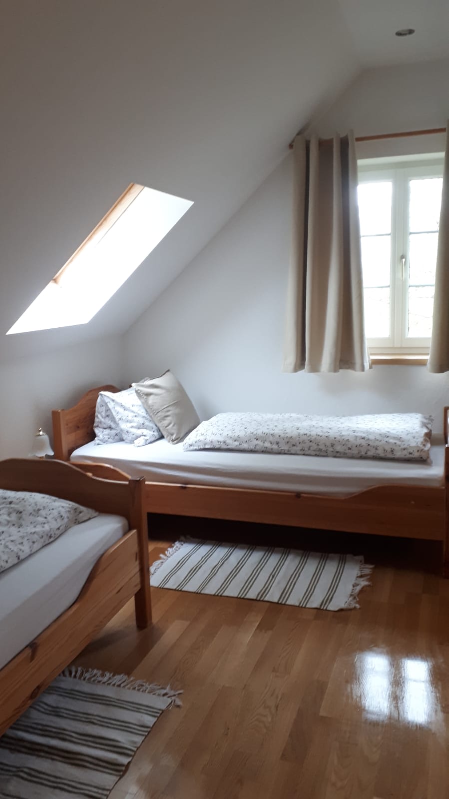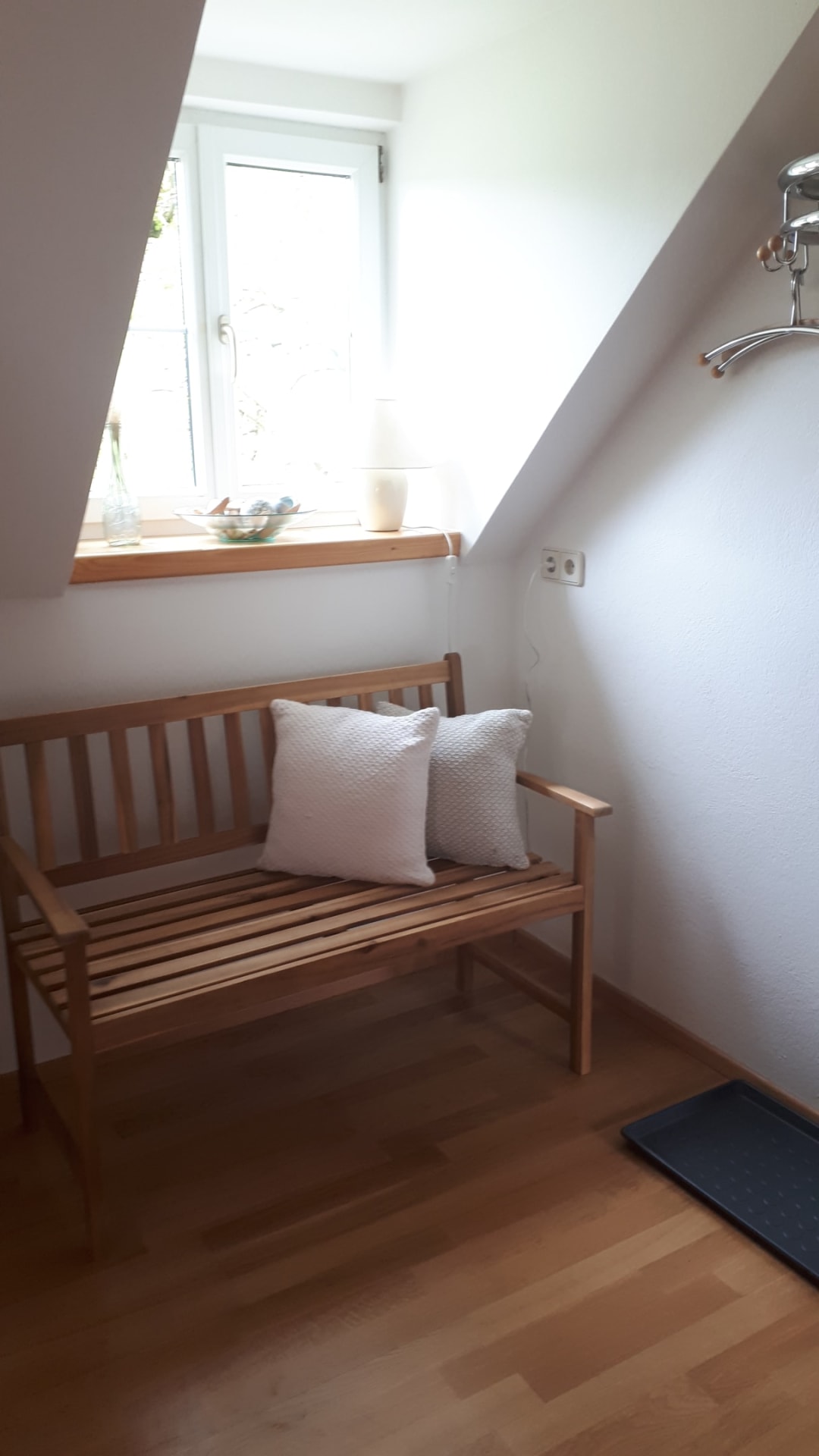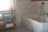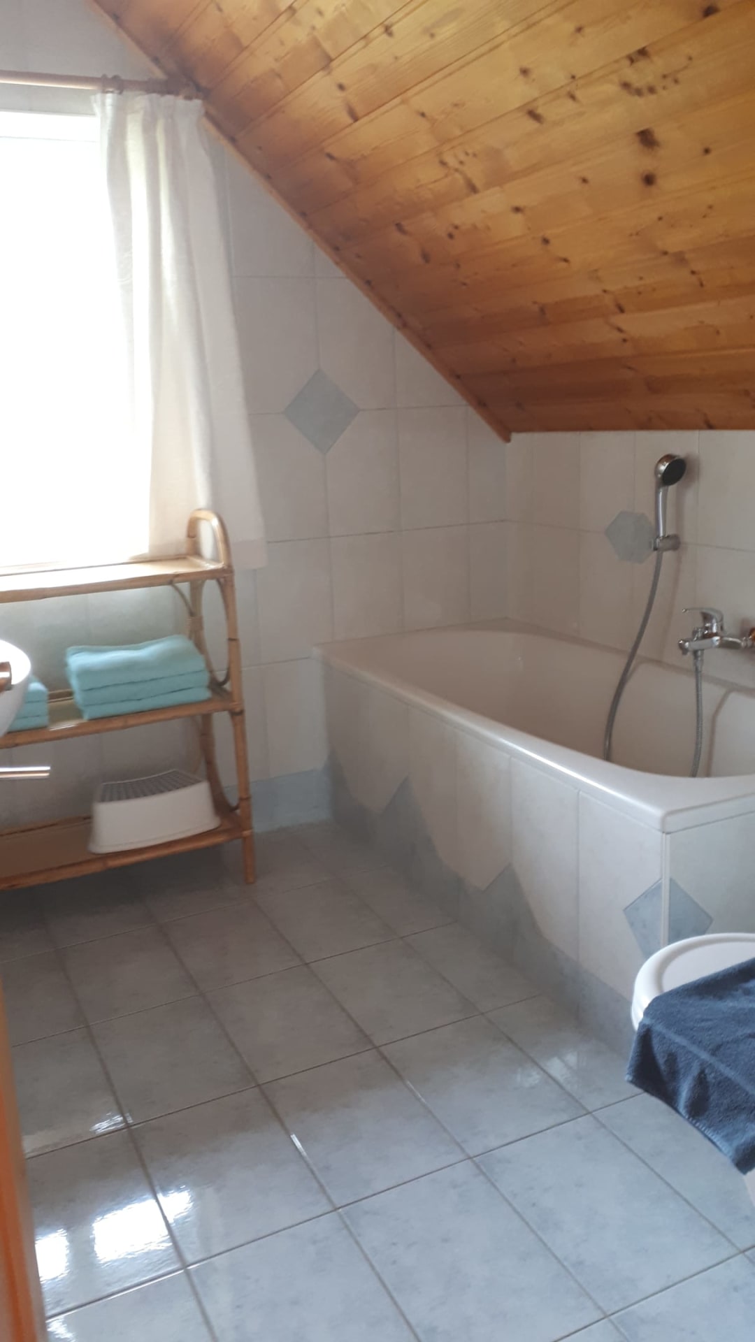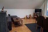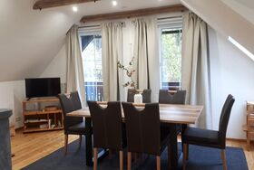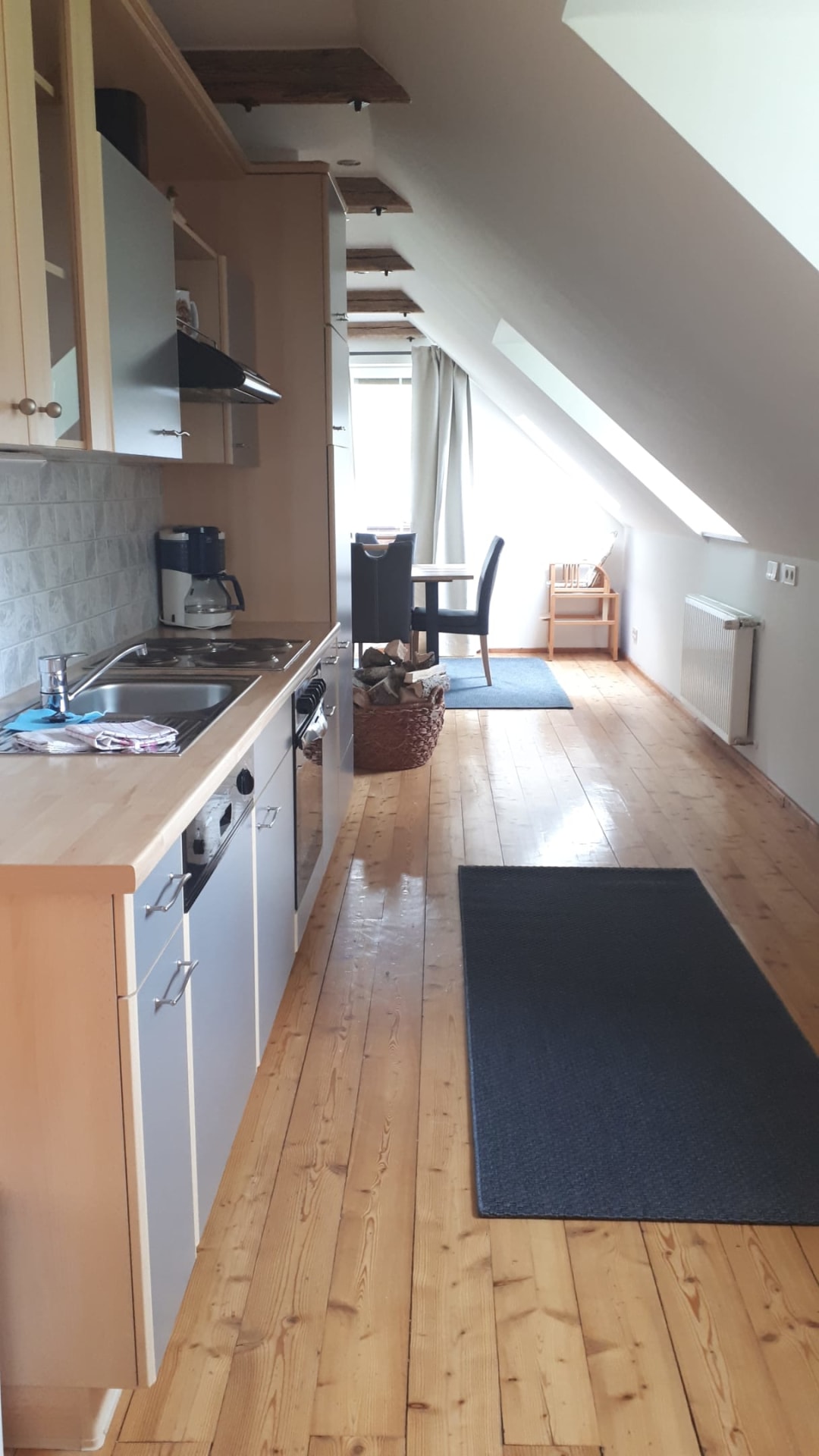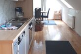 Apartment über gesamtes Obergeschoss mit Balkon; Küche(E-Herd mit Backofen, Mikrowelle, Toaster, Kaffeemaschine, Radio, 2 Schlafzimmer, ein großer Wohn-,Esszimmer mit Balkon, SAT-TV, WC, Badezimmer(Dusche, Badewanne, Waschmaschine, Fußbodenheizung.