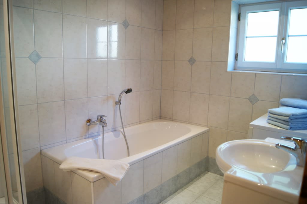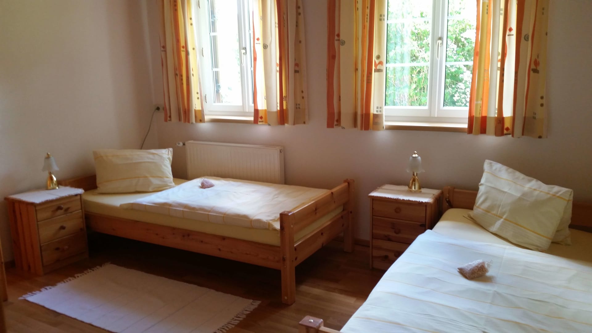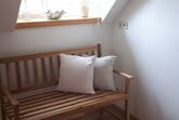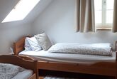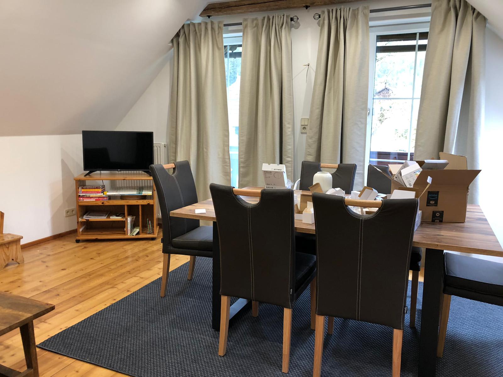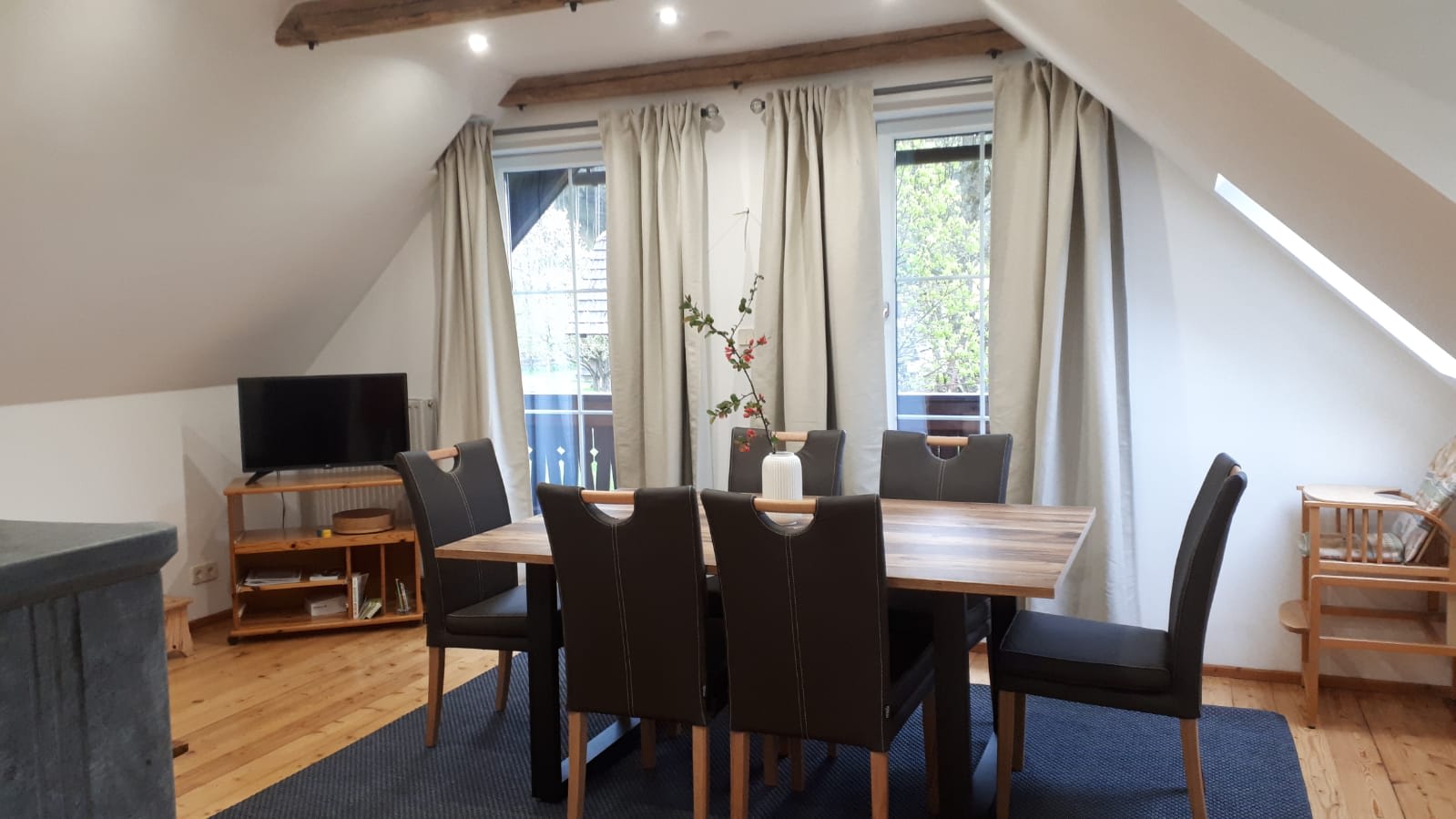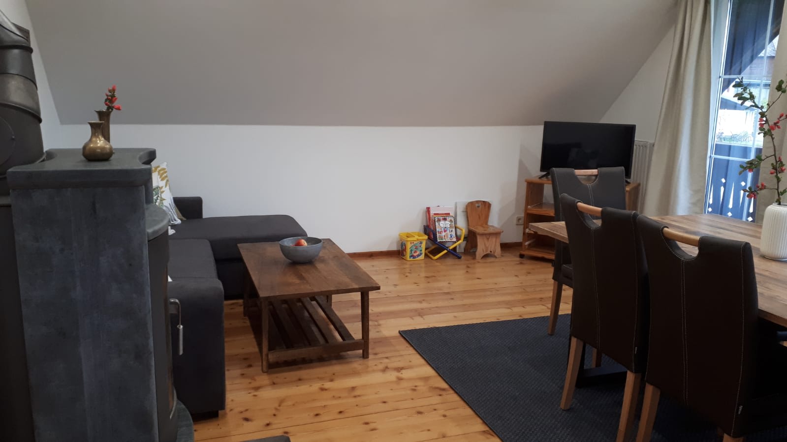 Apartment über gesamtes Obergeschoss mit Balkon; Küche(E-Herd mit Backofen, Mikrowelle, Toaster, Kaffeemaschine, Radio, 2 Schlafzimmer, ein großer Wohn-,Esszimmer mit Balkon, SAT-TV, WC, Badezimmer(Dusche, Badewanne, Waschmaschine, Fußbodenheizung.