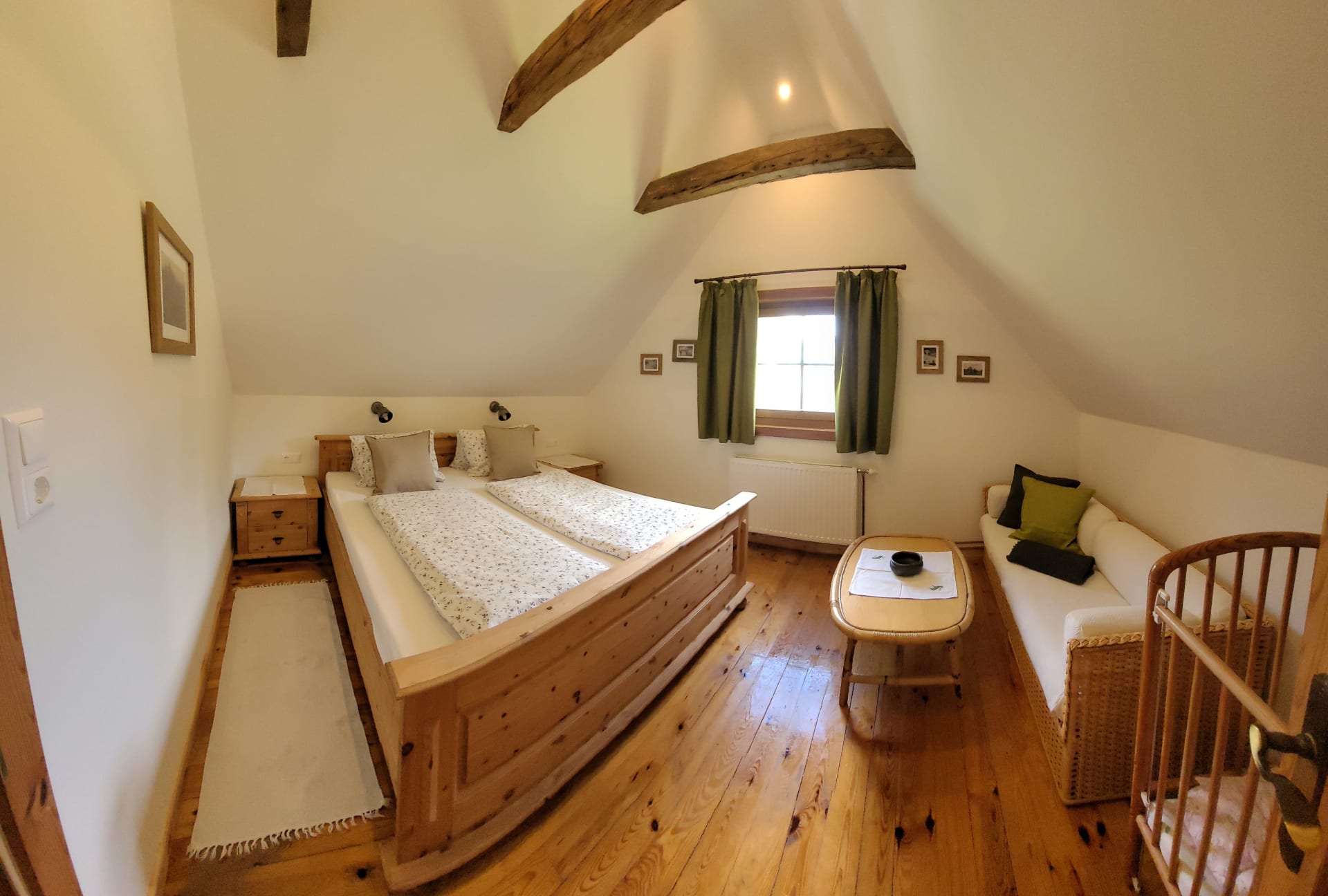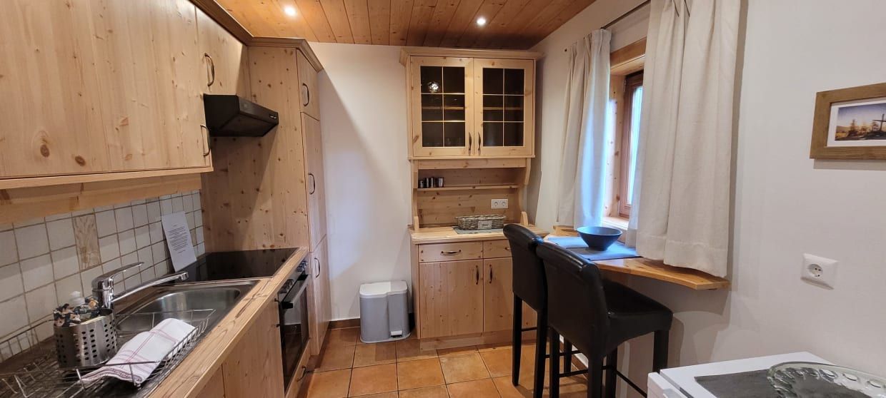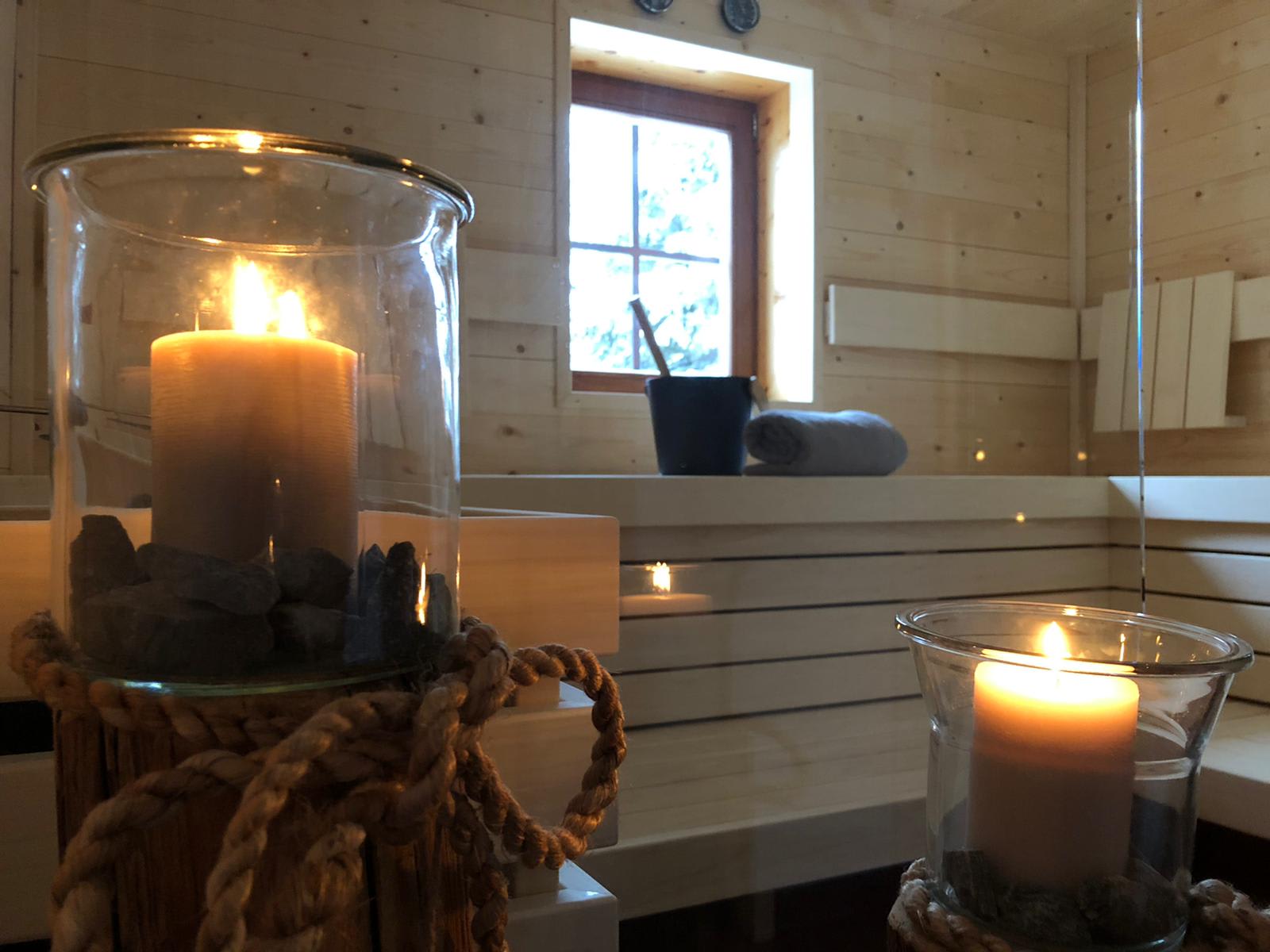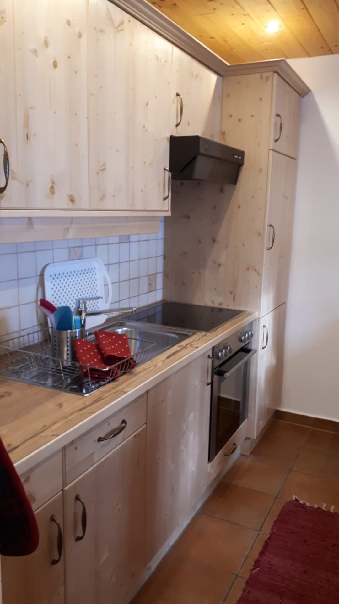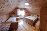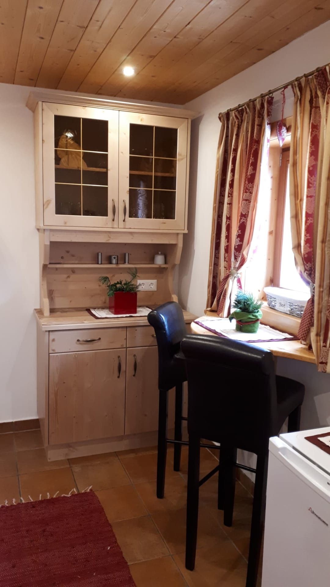 Es erwartet Sie eine Almhütte mit großem Komfort: Küche mit E-Herd, Kaffeemaschine, Toaster, Wohn-Esszimmer mit Pelletsofen und Fernseher, drei Schlafzimmer (Gitterbett vorhanden), WC, Badezimmer mit Dusche und WC, Leseecke in der oberen Etage, Sauna für 6 Personen