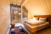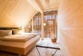 Ein großzügiges Schlafzimmer mit Platz für zwei bis vier Personen mit eigenem Bad und kleiner Holzterrasse.