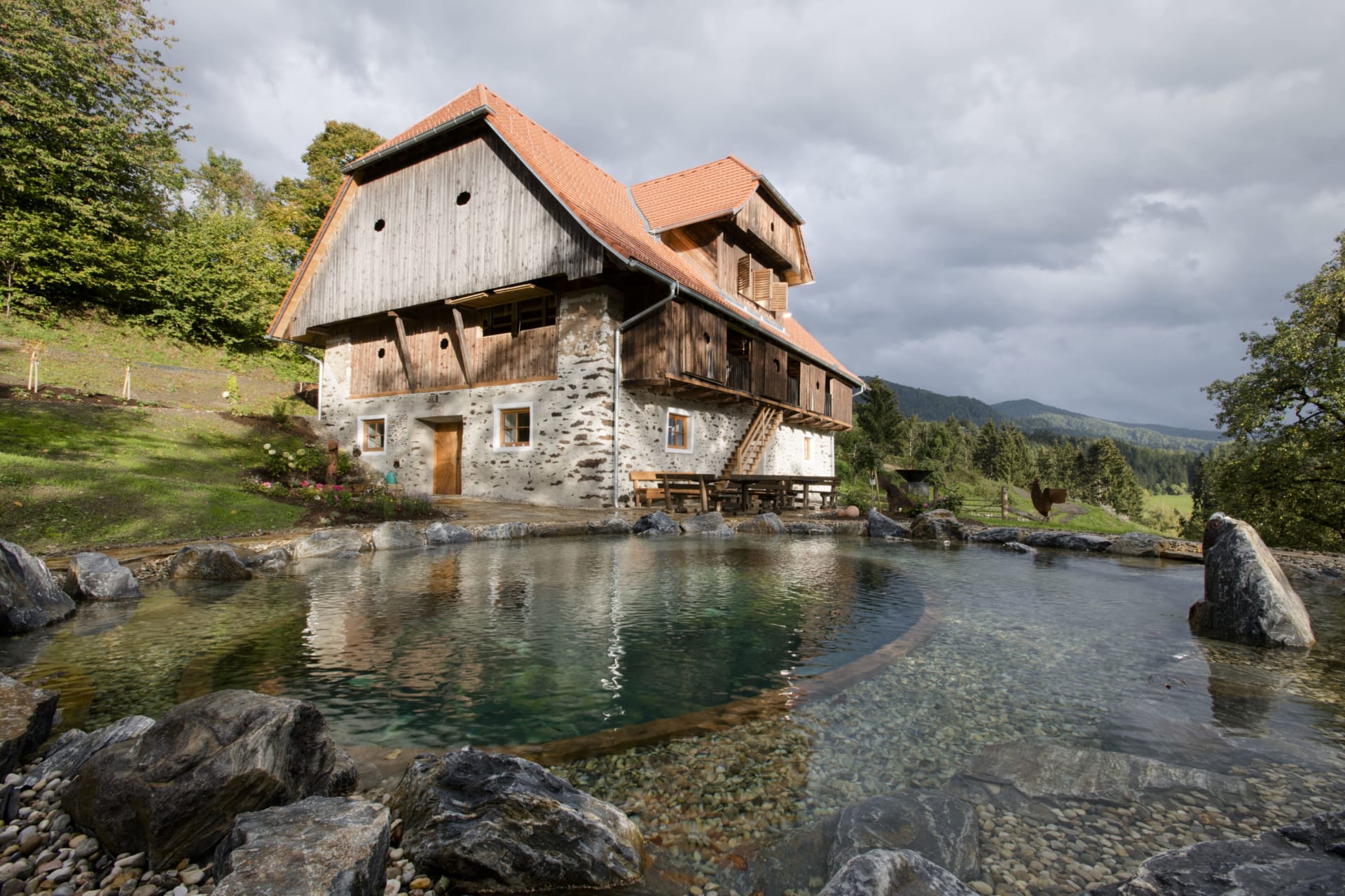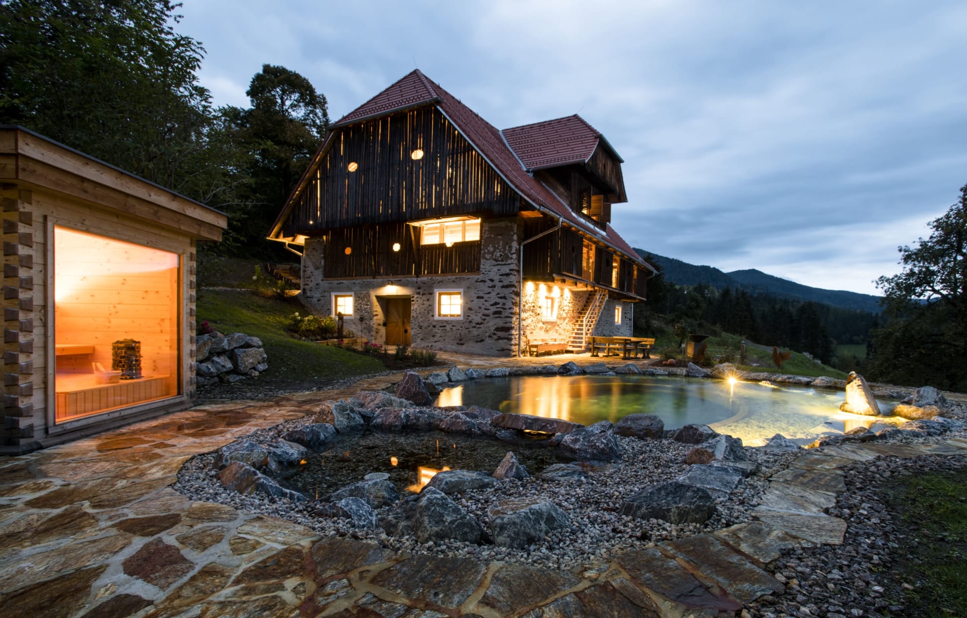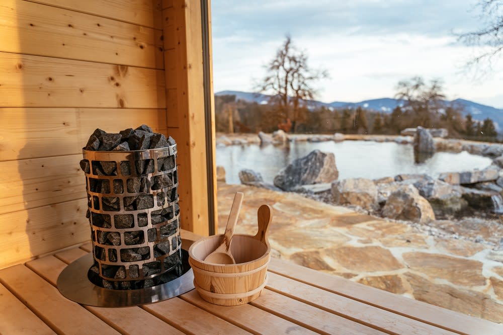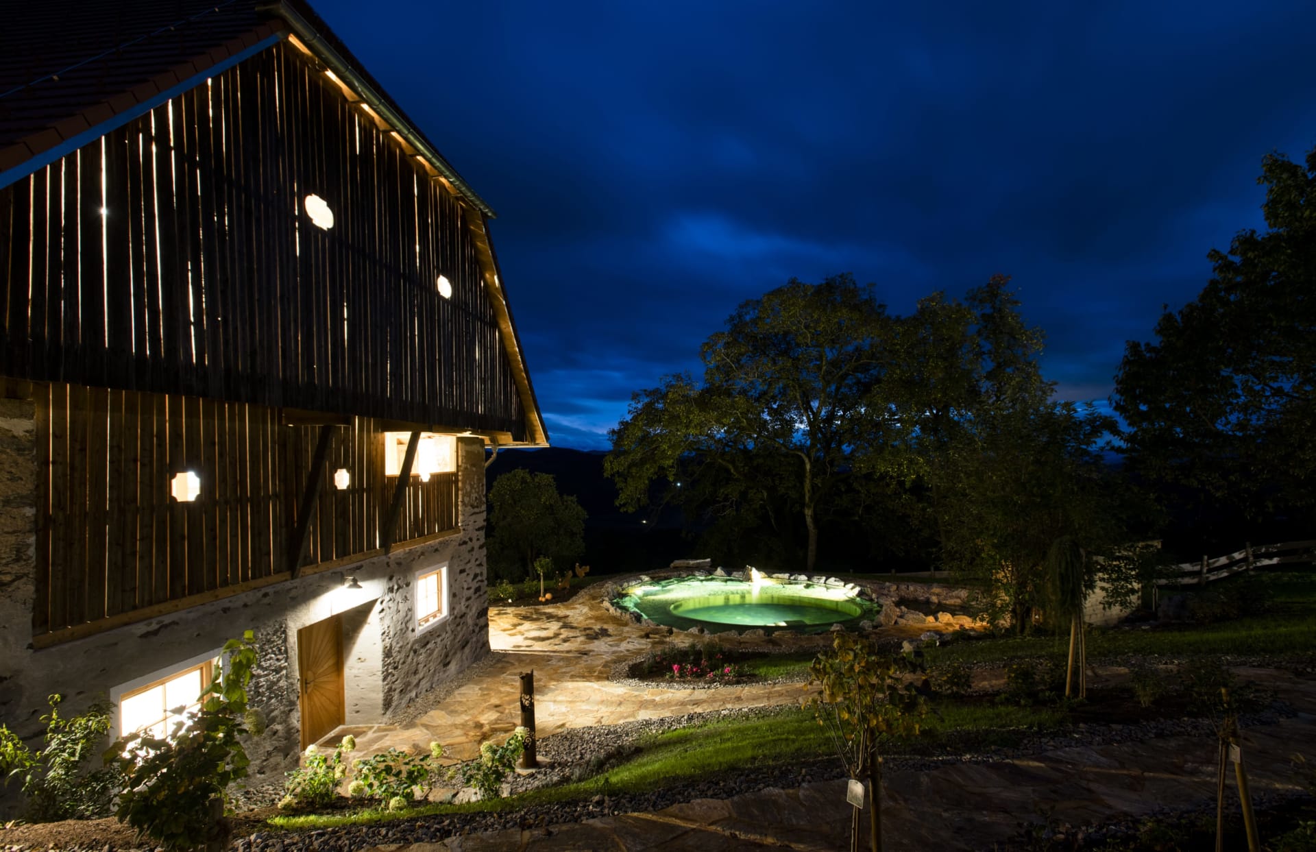 Der Naturbadeteich mit integriertem Holzpool lädt vor allem im Sommer zur Abkühlung bzw. im Winter, nach der Sauna, zu einem Sprung ins kühle Nass ein.