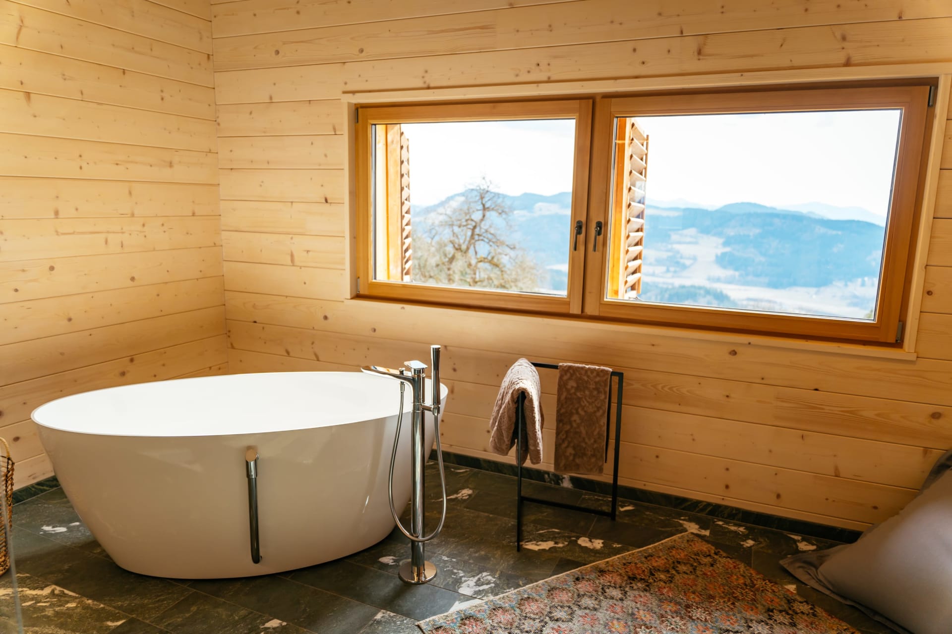 Weiteres großes Bad mit Badewanne/Dusche und Bergpanorama mit Blick bis zu den Karawanken.