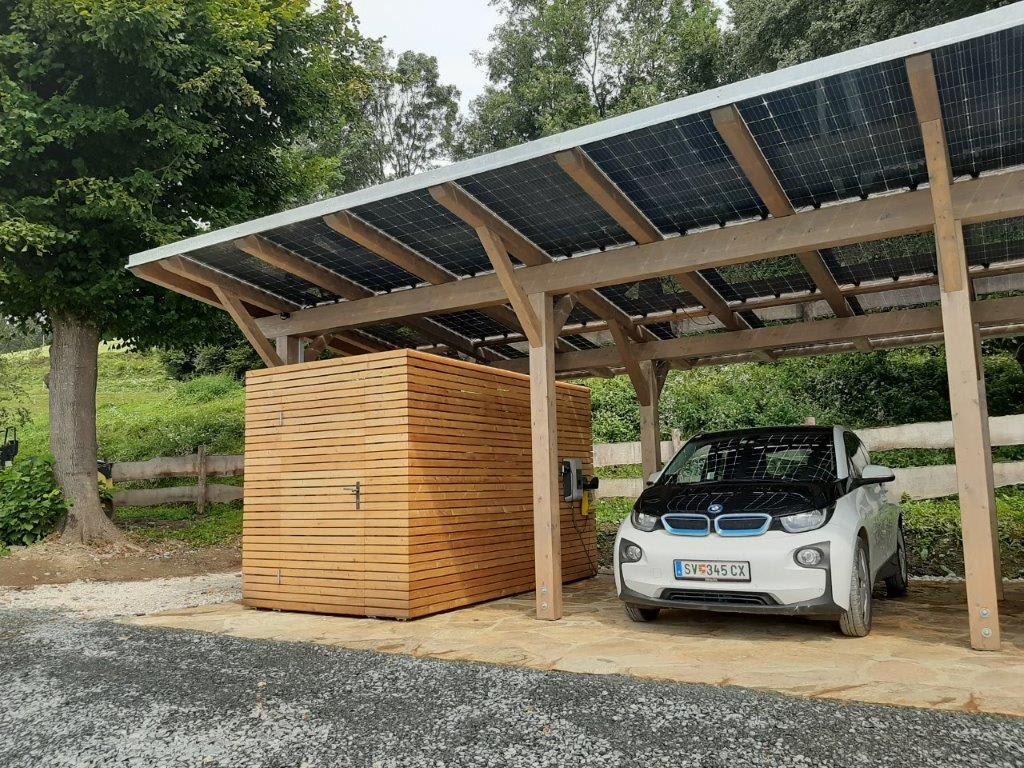 Das mit Photovoltaik-Modulen überdachte Carport liefert Energie für alle Elektroautos.