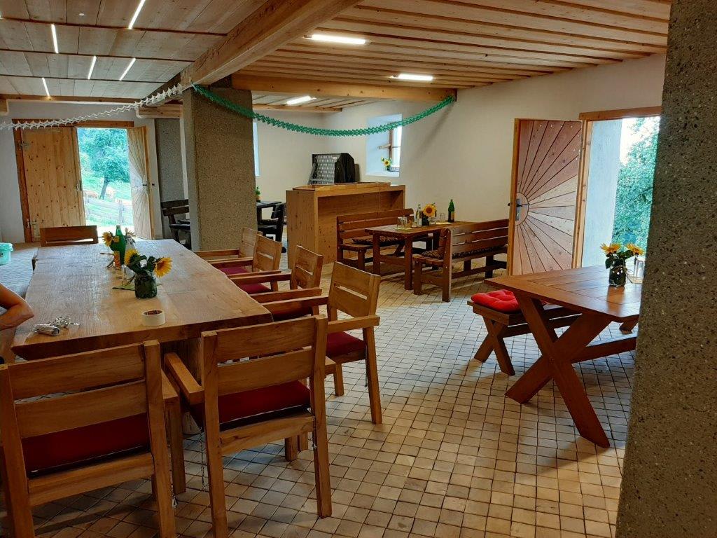 Im Erdgeschoss bietet der ehemalige Kuhstall Platz zum Feiern, Tischtennis spielen und gemütlichen Zusammensitzen.