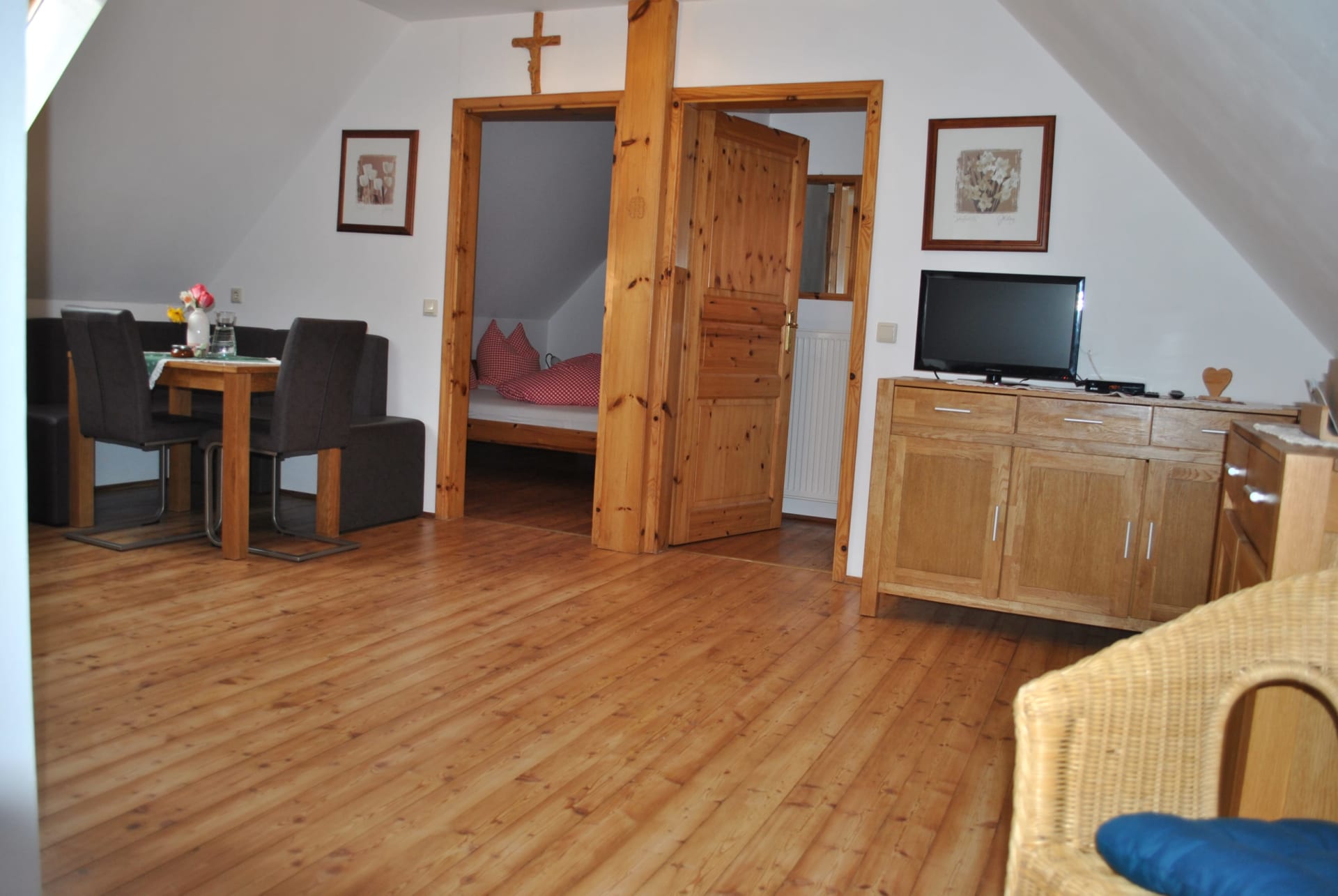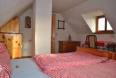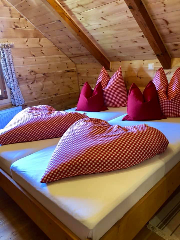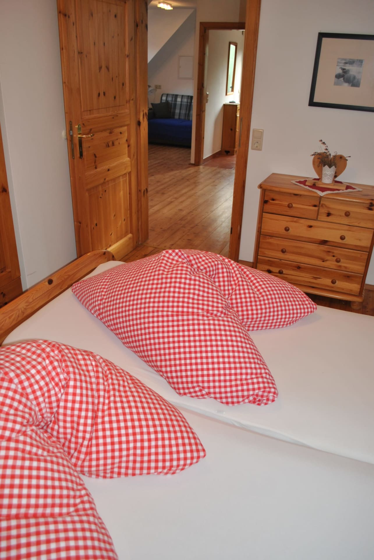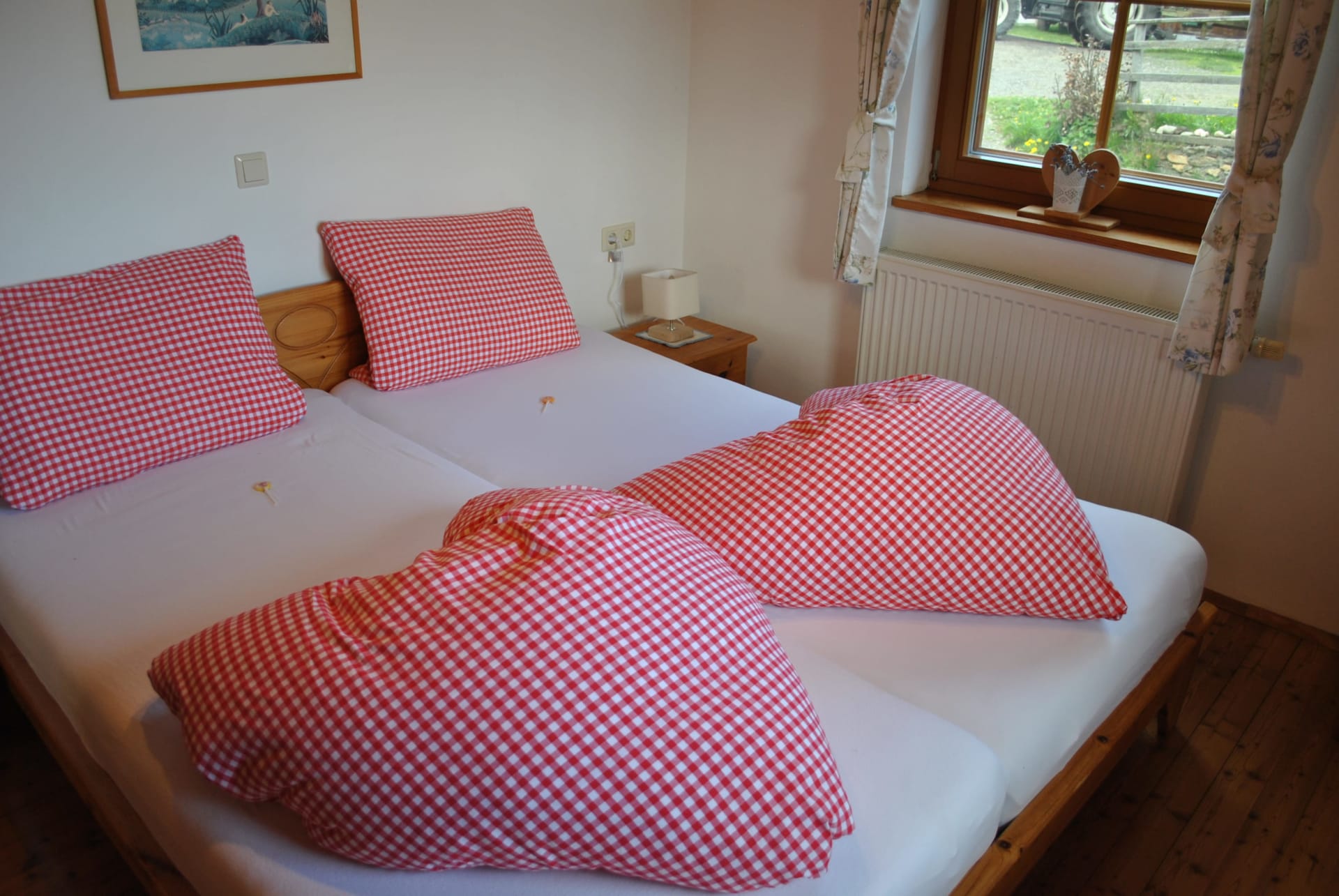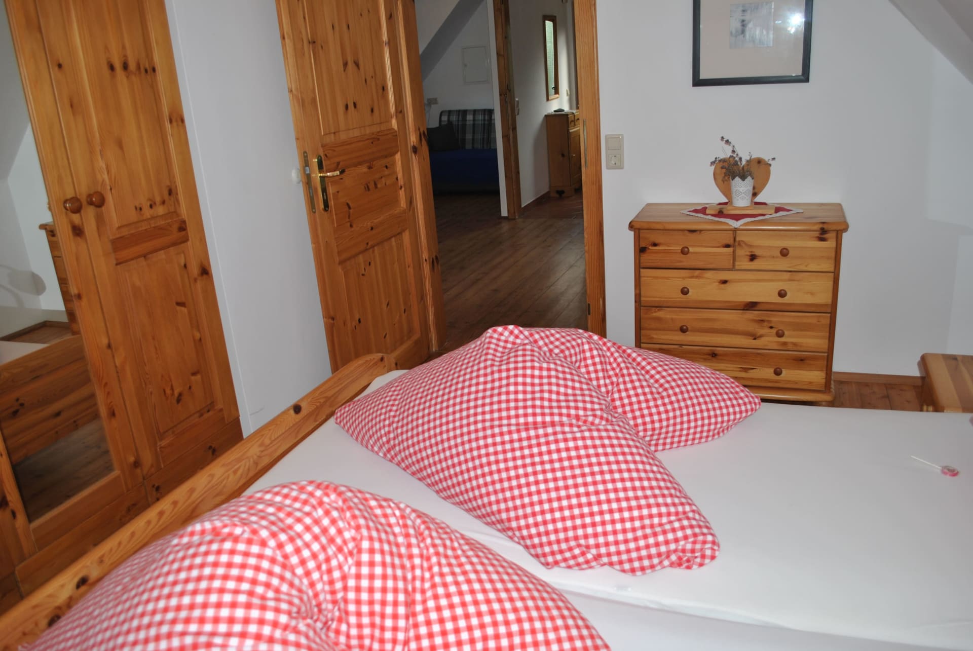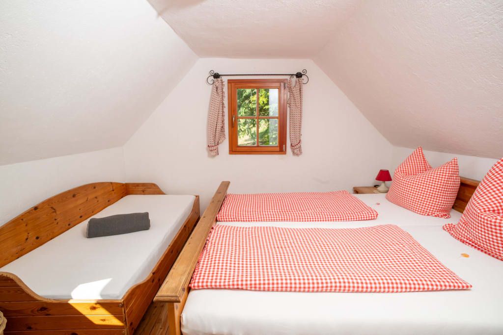 Im 1. Stock, der von außen erreichbar ist, befinden sich ein Doppelbett und ein Einzelbett.