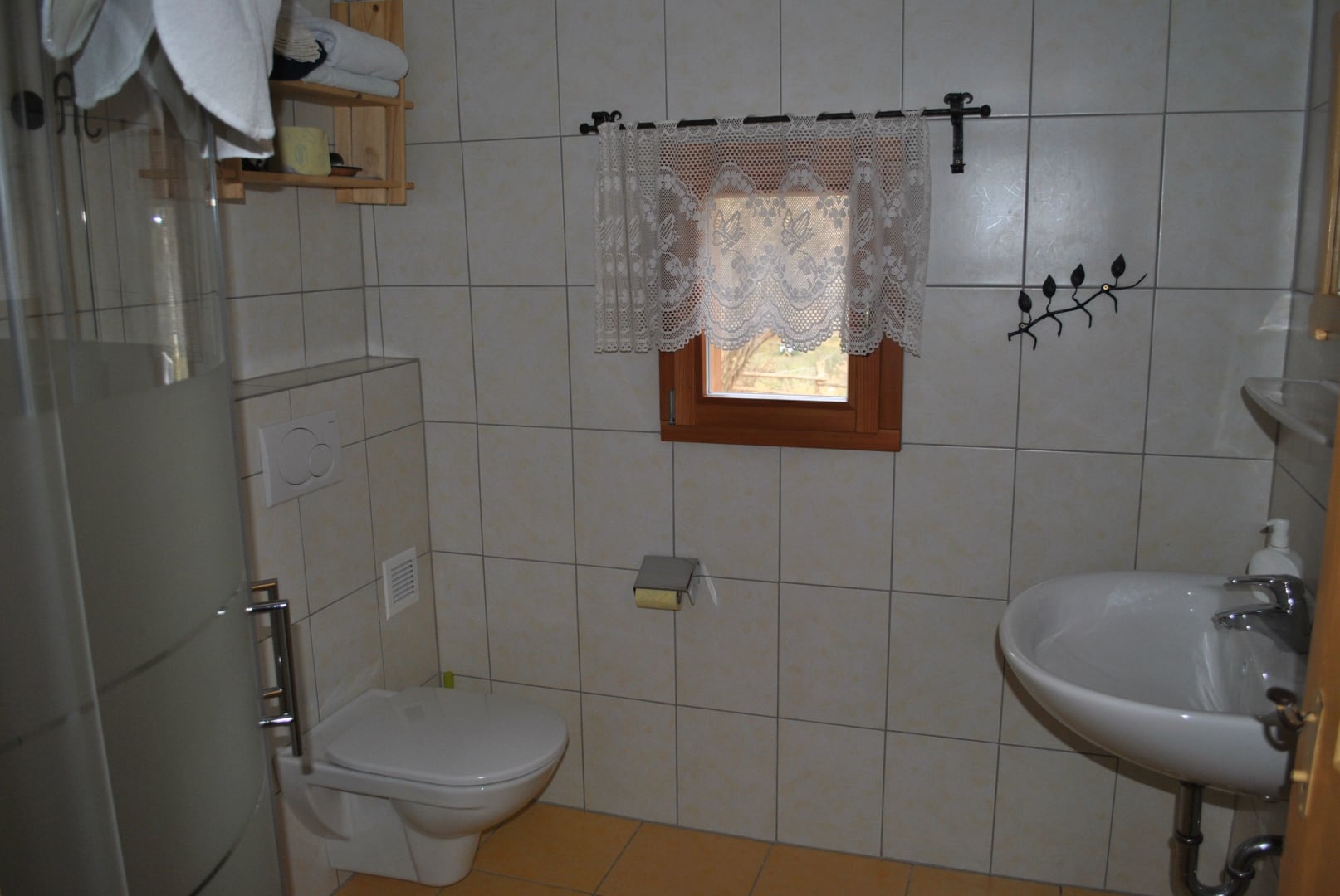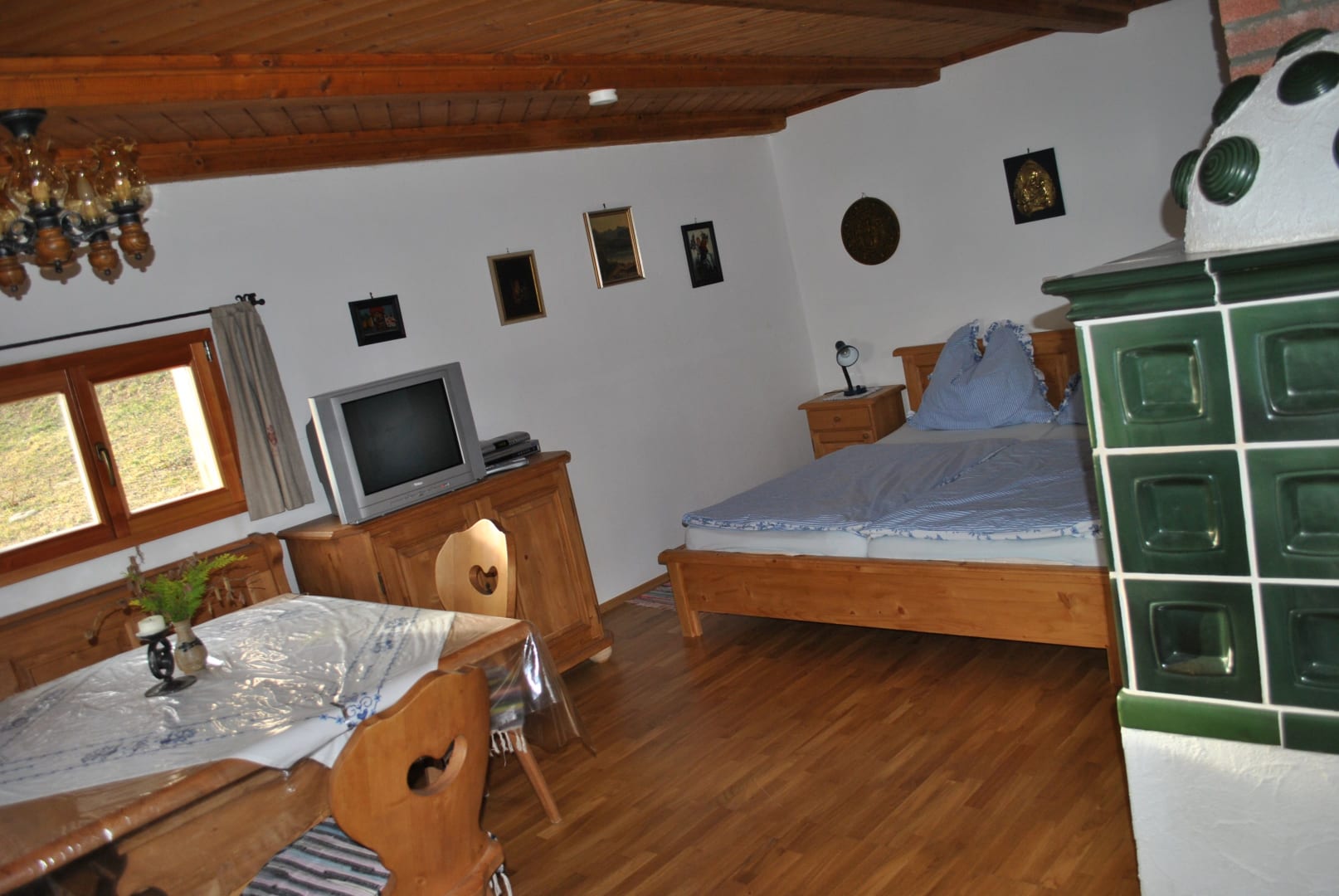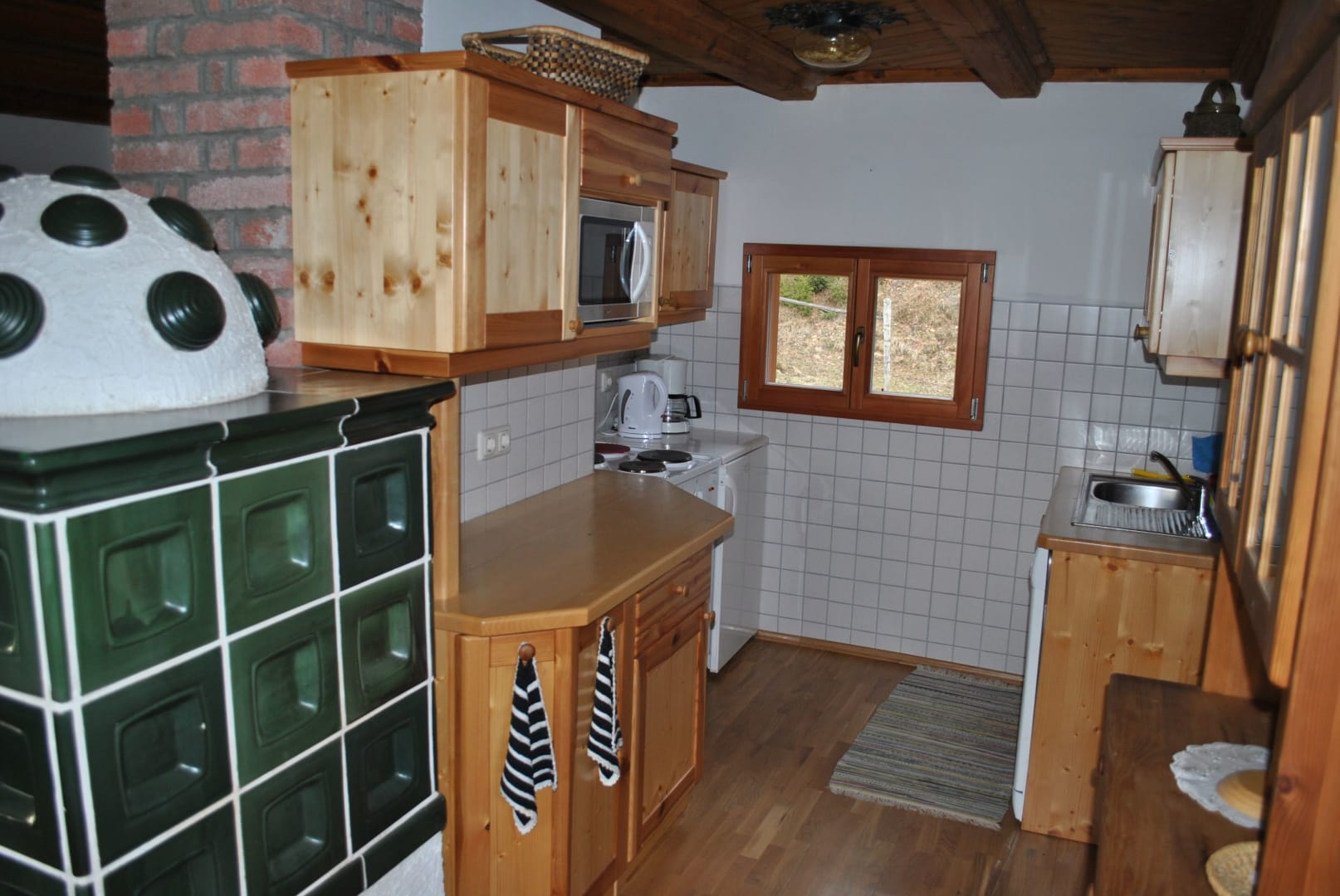Im Erdgeschoss befindet sich ein großer Raum mit einem Kachelofen, Essbereich, voll ausgestatteter Küche, Doppelbett und einem Bad mit WC und Dusche.