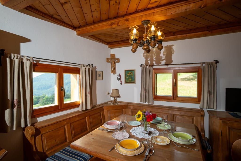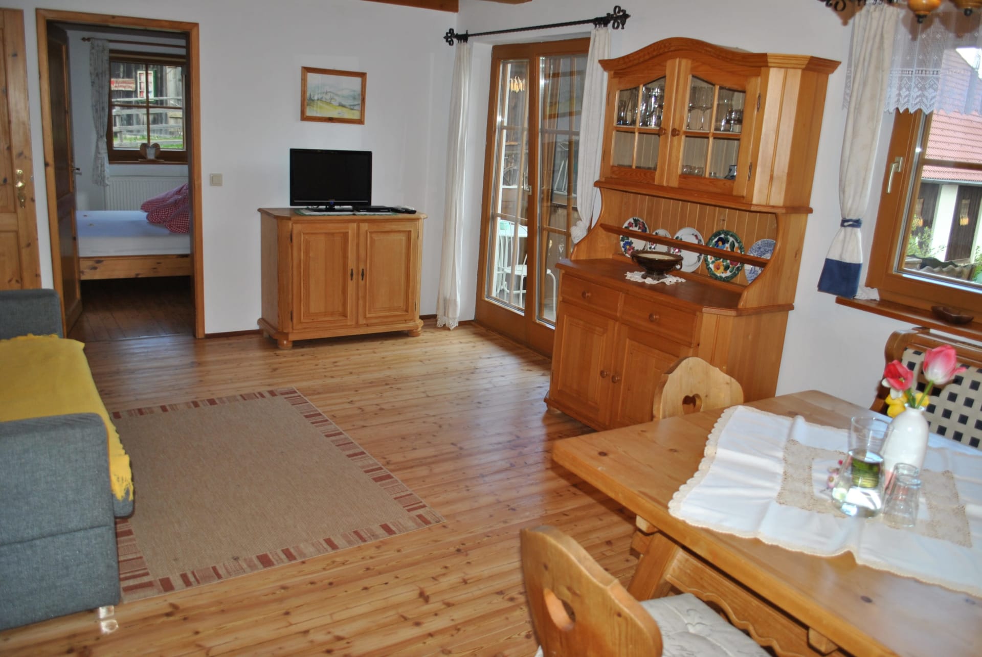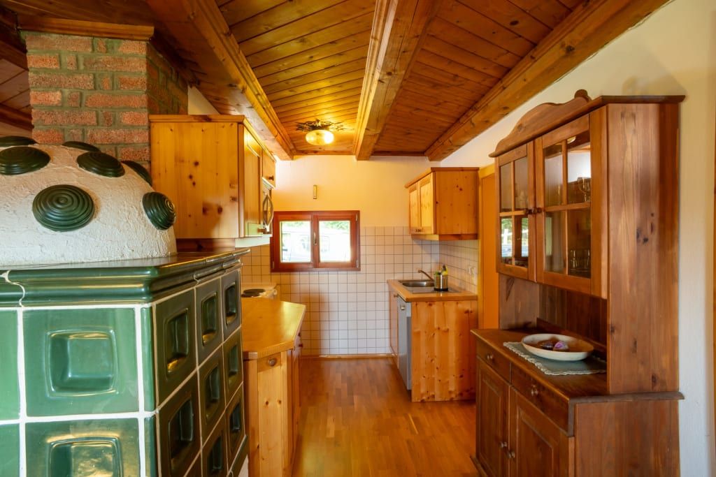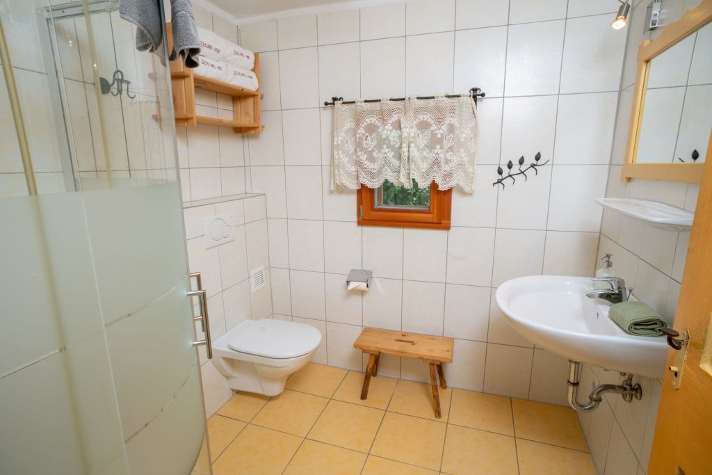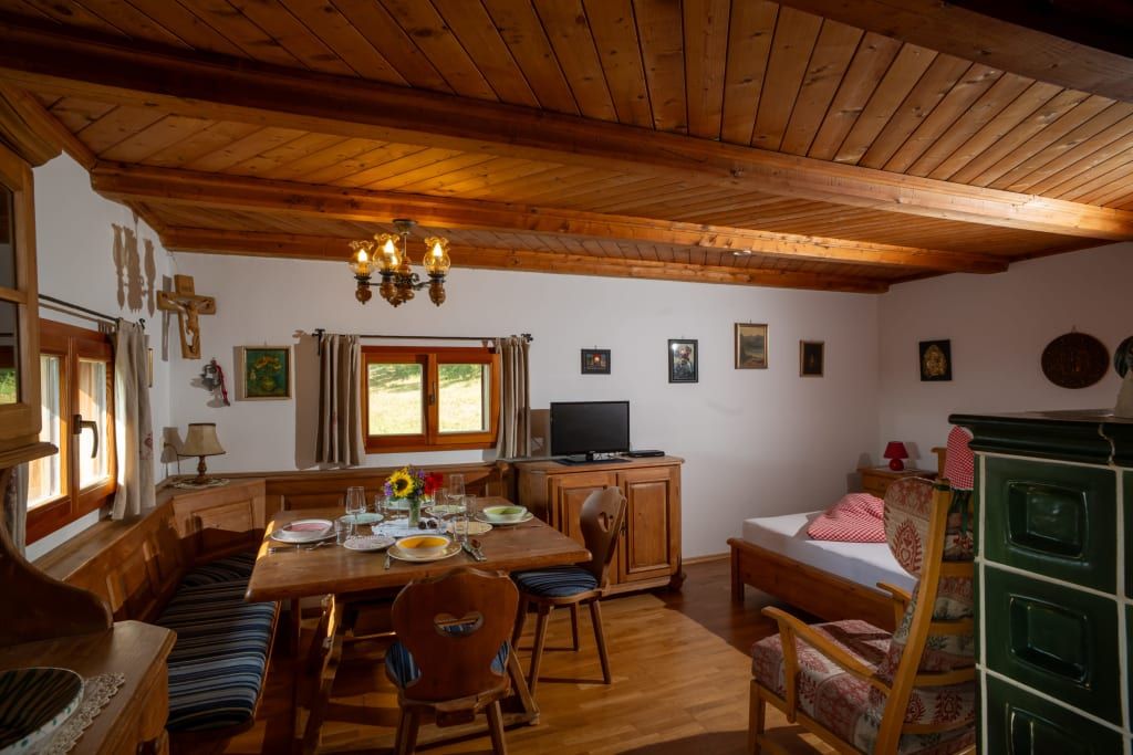Im Erdgeschoss befindet sich ein großer Raum mit einem Kachelofen, Essbereich, voll ausgestatteter Küche, Doppelbett und einem Bad mit WC und Dusche.