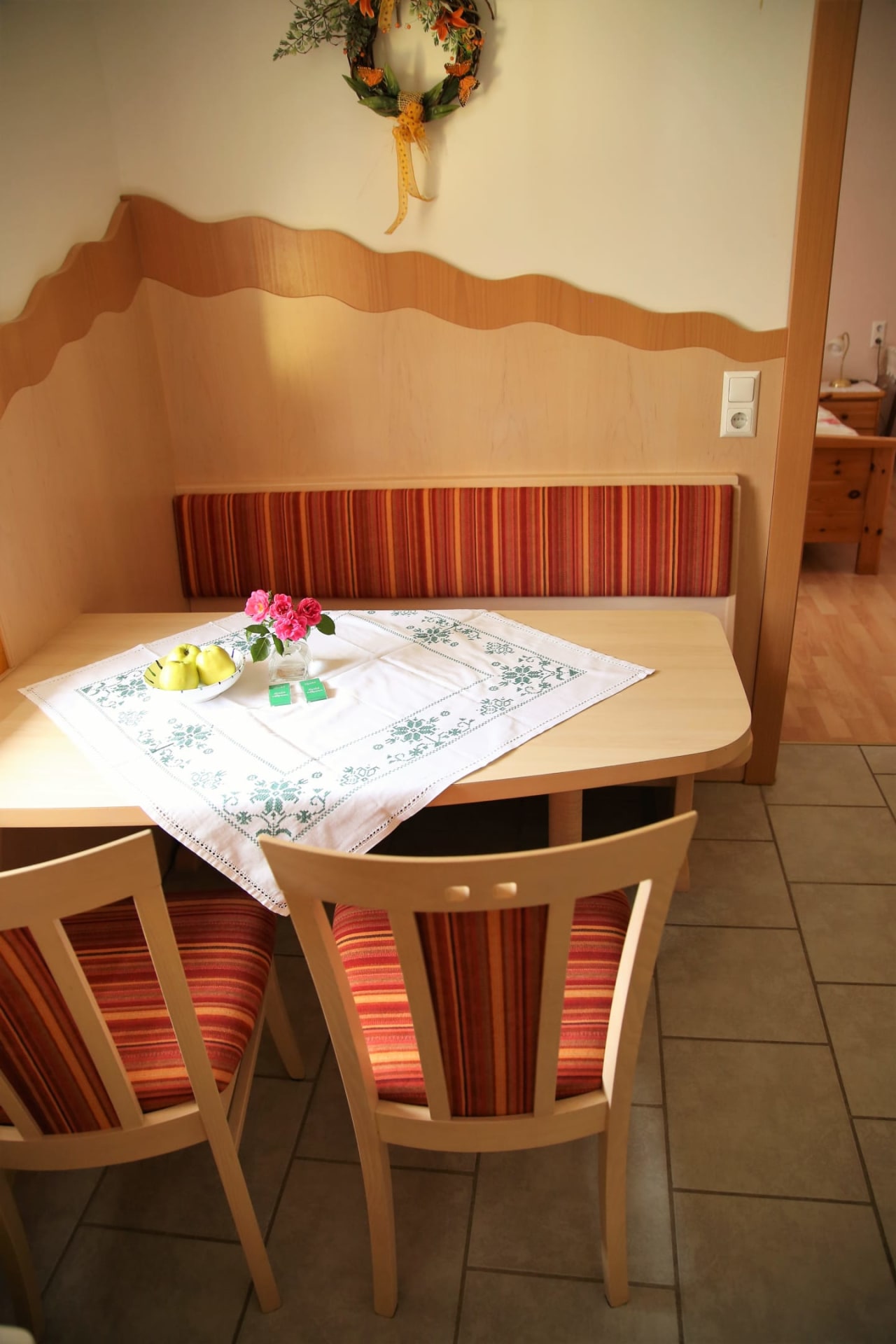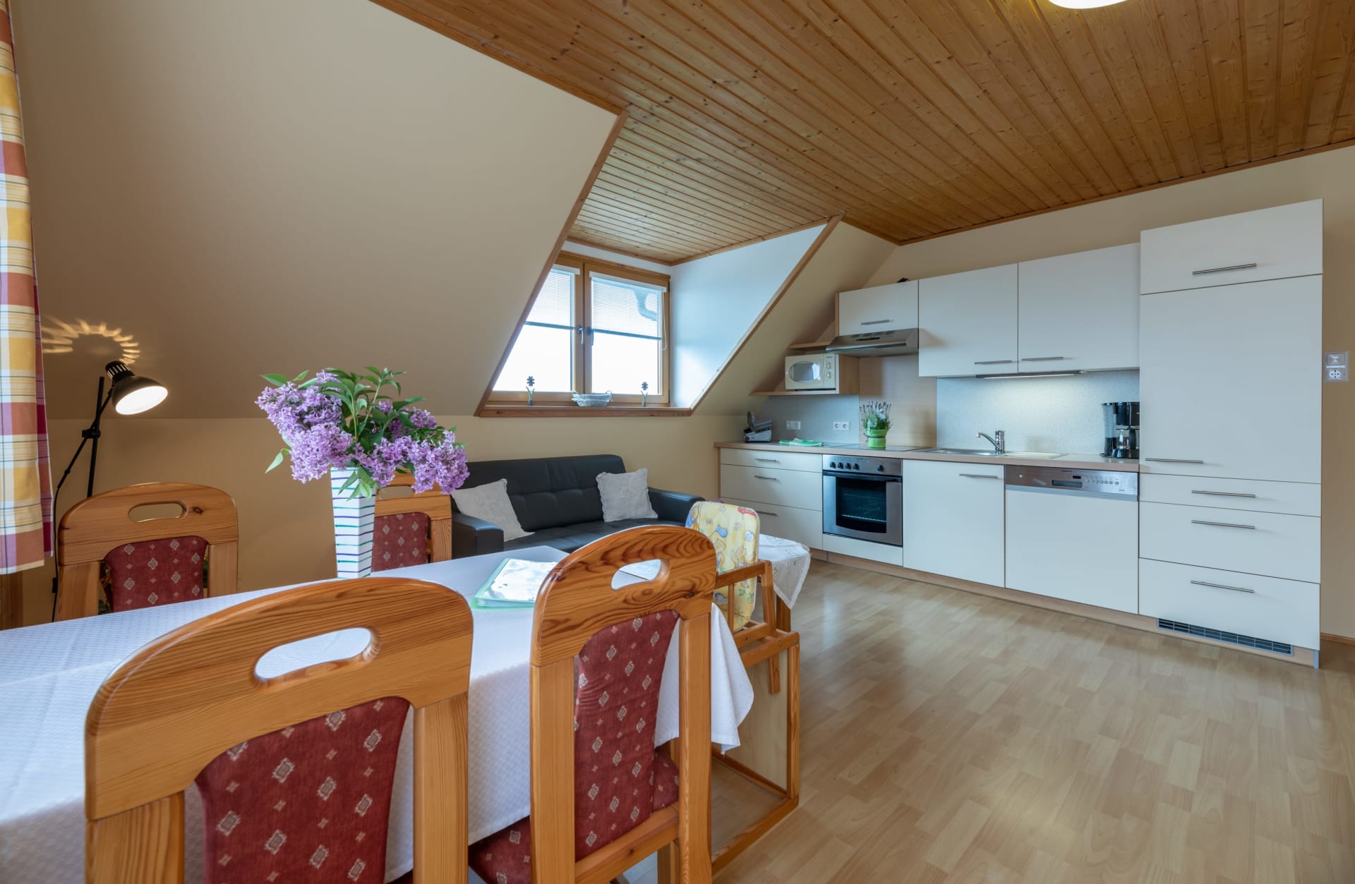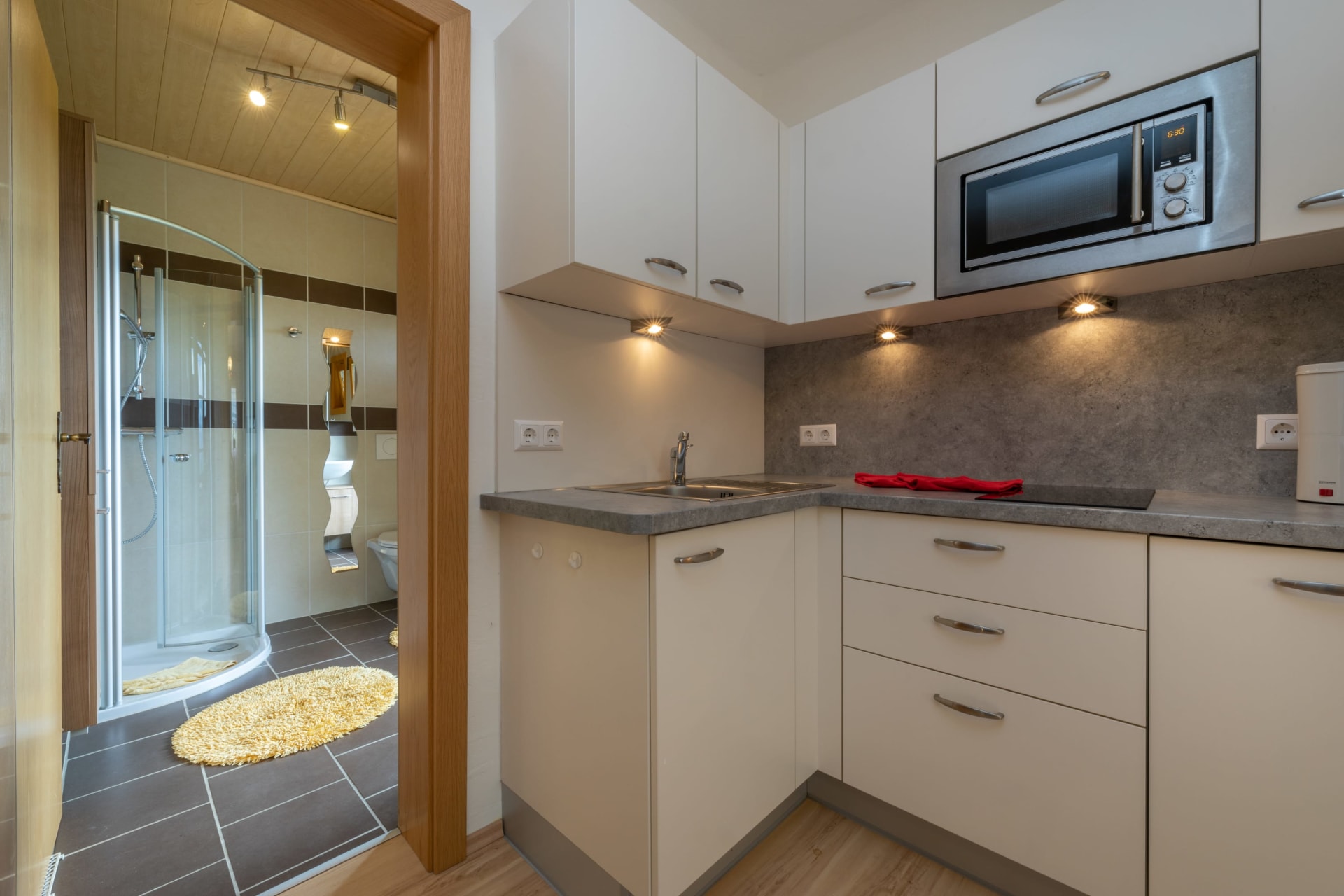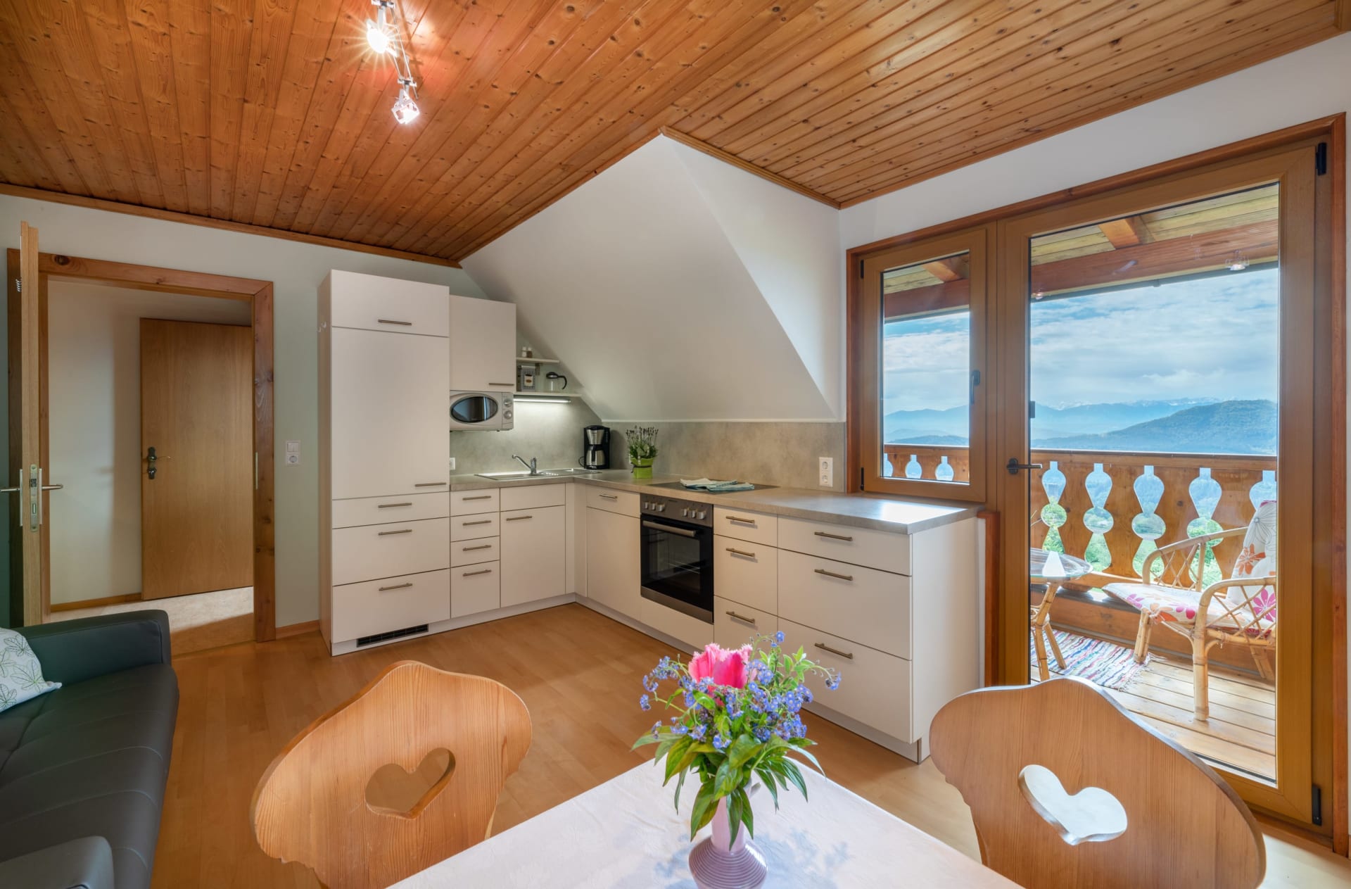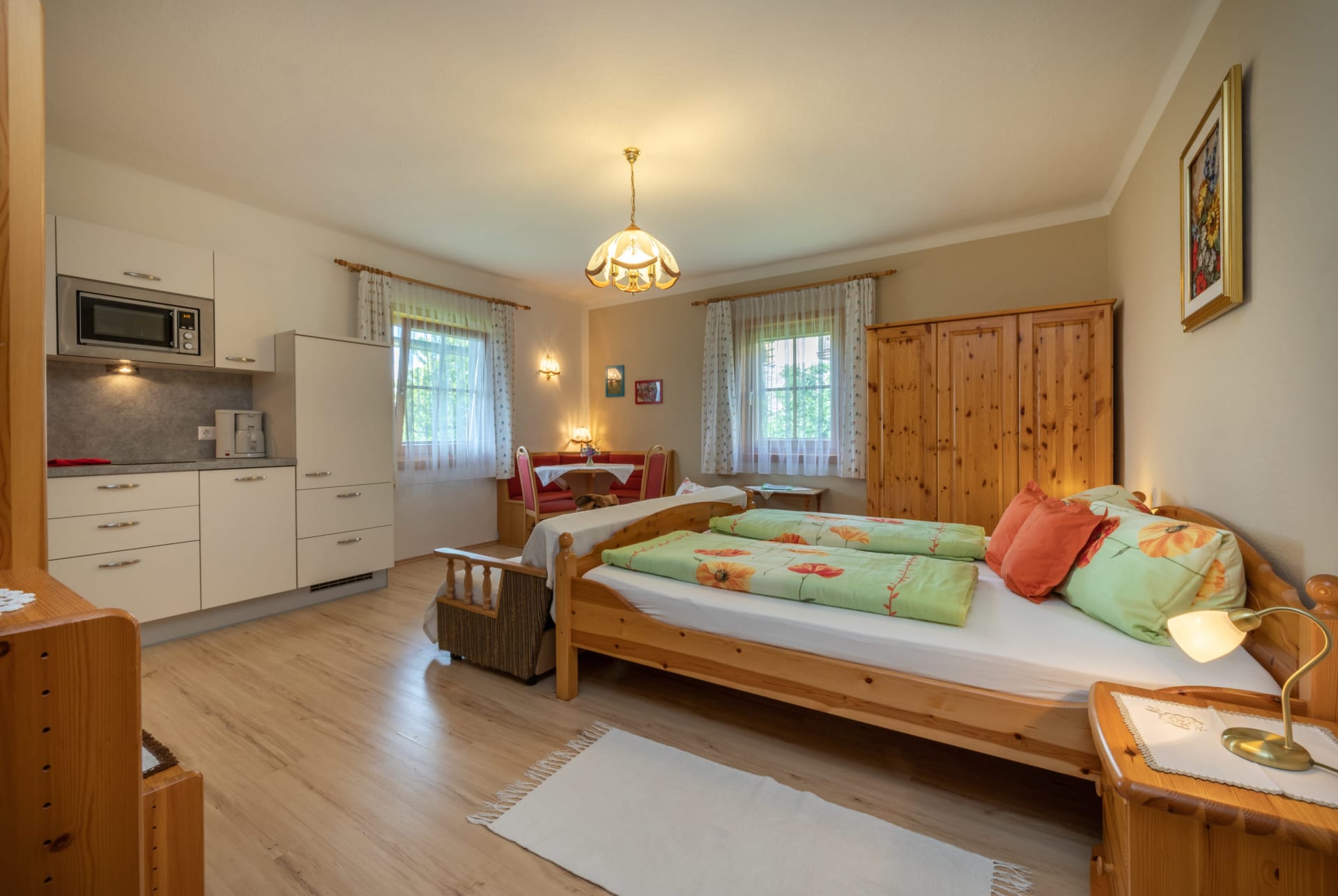 Entdecken Sie unser charmantes 30 m² großes Studio, ideal für zwei Personen, gelegen im Haupthaus. Es erwartet Sie ein komfortables Queensize-Doppelbett und ein gemütlicher Sitzbereich mit Eckbank. Im voll ausgestatteten Küchenbereich finden Sie alles, was Sie für Ihre Selbstversorgung benötigen: einen Kühlschrank, Mikrowelle, Toaster und Wasserkocher. Das moderne Badezimmer ist mit einer Dusche, WC und Haartrockner ausgestattet, frische Handtücher liegen für Sie bereit. Unterhaltung bieten Sat-TV und Radio. Ein besonderes Highlight ist Ihr eigener Südbalkon, von dem aus Sie die atemberaubende Berglandschaft genießen können. Als Nichtraucher-Studio garantieren wir Ihnen eine frische und angenehme Atmosphäre.
