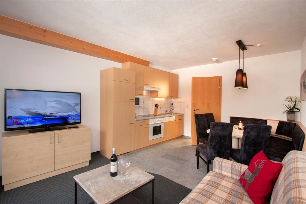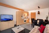 Apartment Alpenheimat mit ca. 60 m²: 2 Schlafzimmer mit Doppelbett und Schlafcouch; voll ausgestattete Wohnküche mit Essecke, Flatscreen-TV, Schlafcouch für 2 Personen, Illy Kaffeemaschine, Geschirrspüler, Cerankochfeld uvm.; 2 Badezimmer mit Badewanne/WC; Balkon.