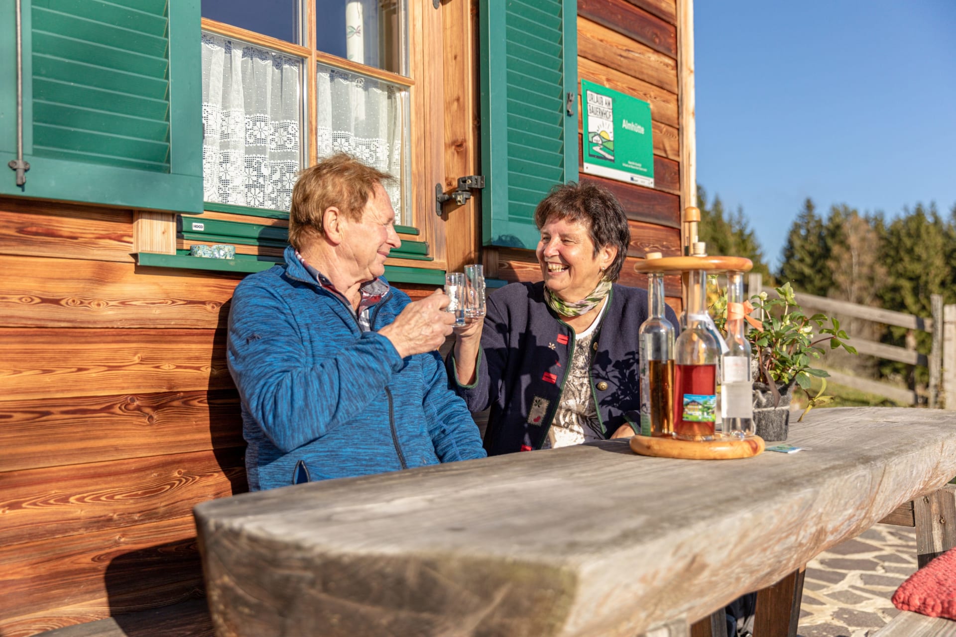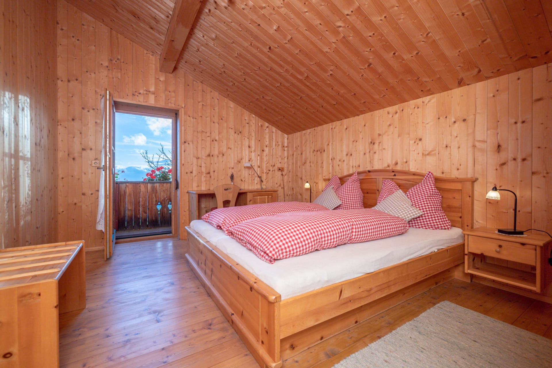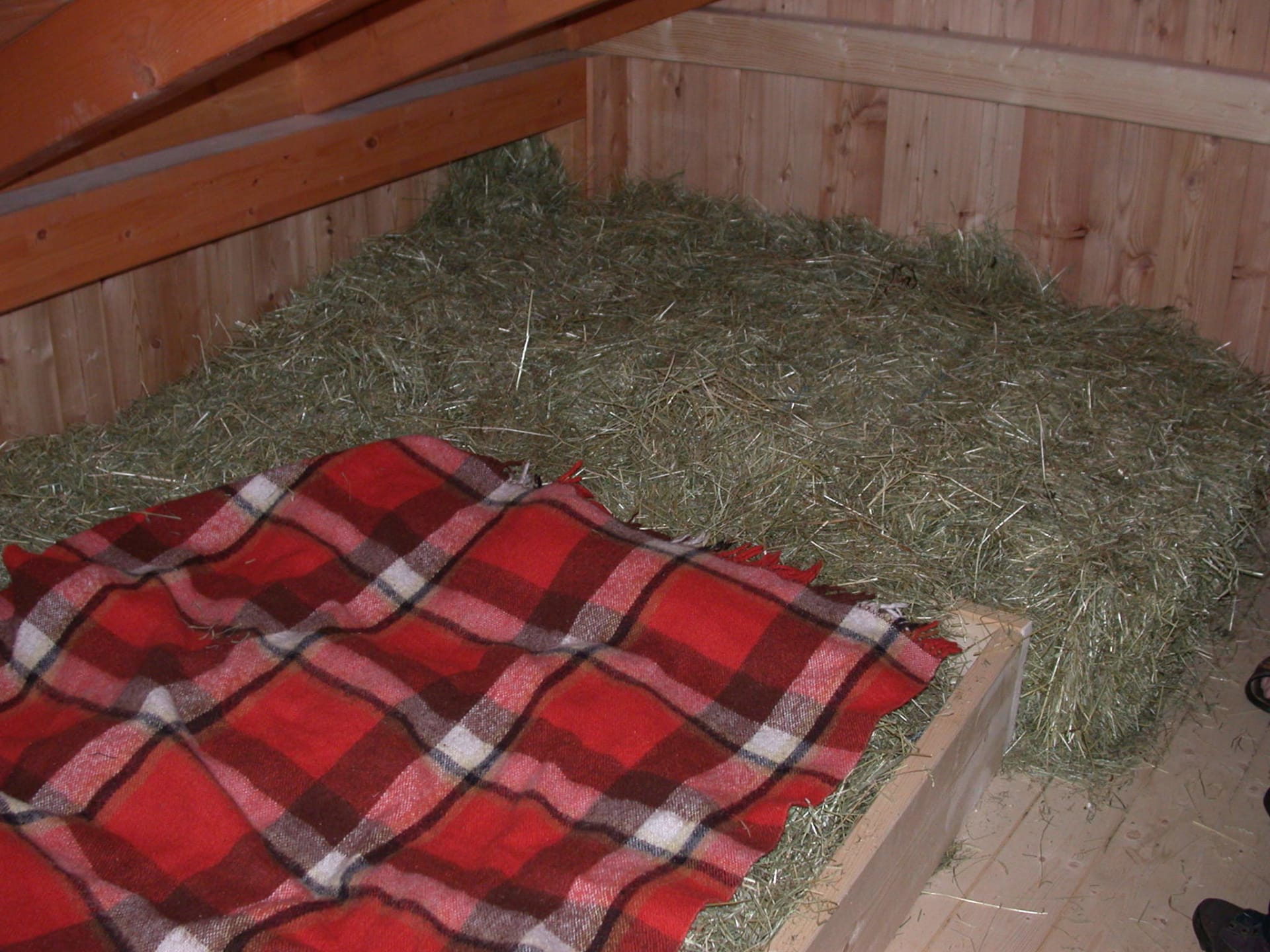 Diese nigelnagelneue Hütte, die für die Gäste mit ganz viel Holz erbaut und ausgestattet wurde, hat eine interessante Besonderheit: den Heuboden! Unter Dach befindet sich eine sehr große Bettfläche, mit duftendem Heu gefüllt! Und daneben noch eine Heubank zum gemütlichen Lümmeln. Das ist ein Kuschelplatz der Sonderklasse und ein Abenteuer für Kinder.
