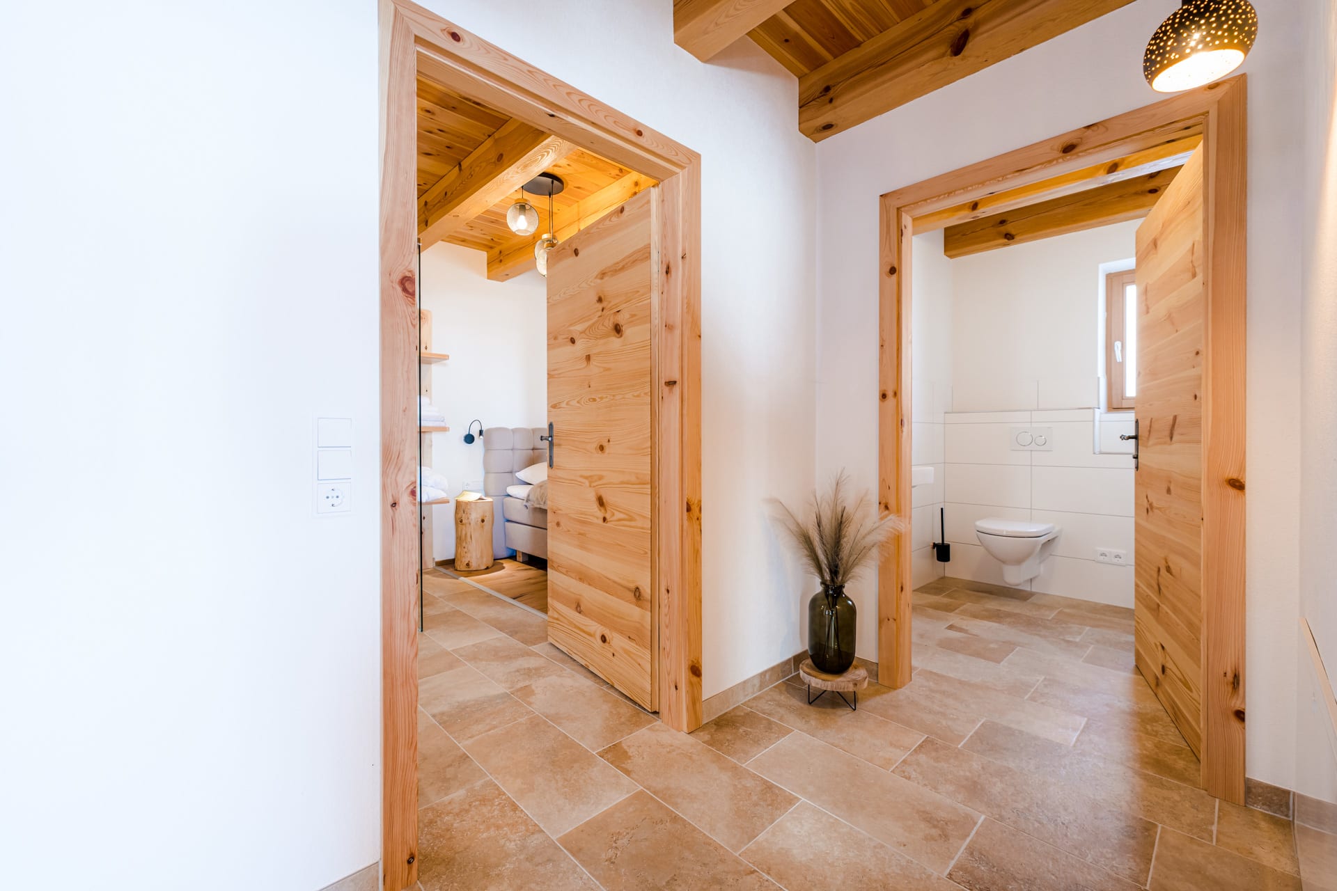 Unsere Chalets sind gemütlich, modern und liebevoll eingerichtet und strahlen durch die sanften Farben und natürlichen Stoffe einen besonderen Charme aus. In drei Schlafzimmer finden 6 bis 8 Personen Platz, das Erdgeschoss ist barrierefrei. Lichtdurchflutete Räume sorgen für Wohlbefinden und Wärme und somit für einen unbeschwerten Urlaub in Zweisamkeit, mit der Familie oder mit Freunden.