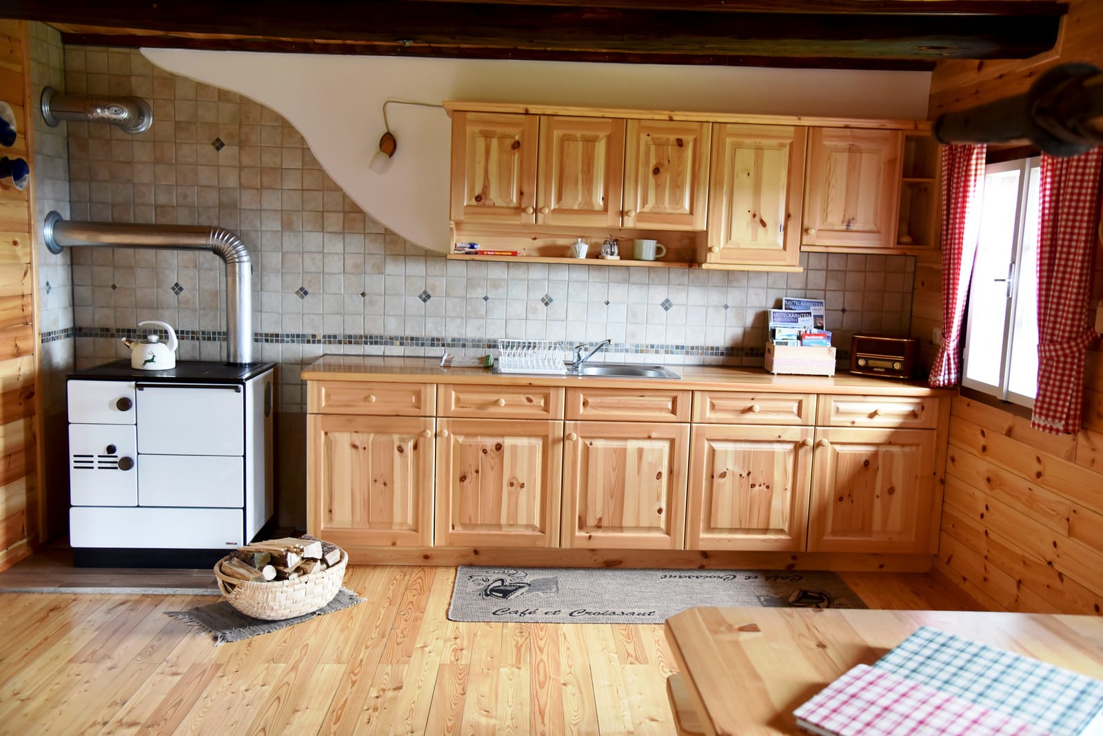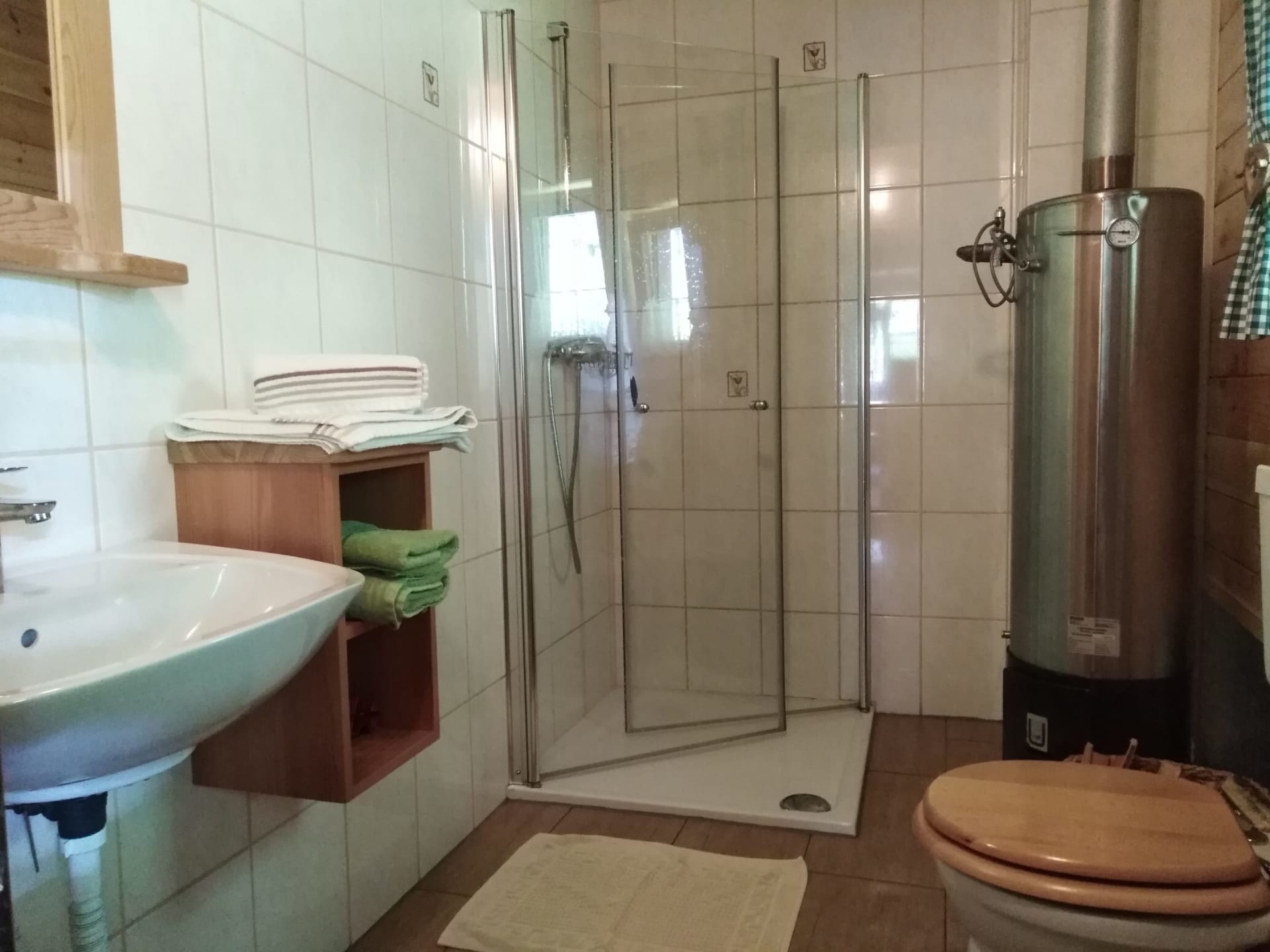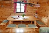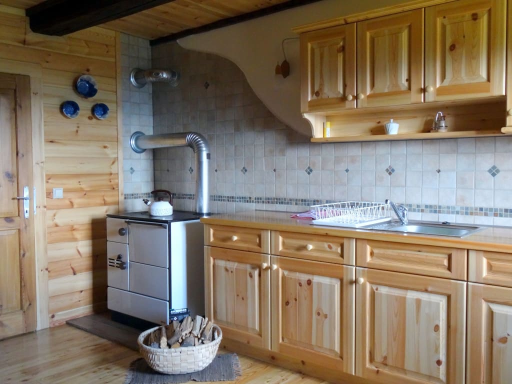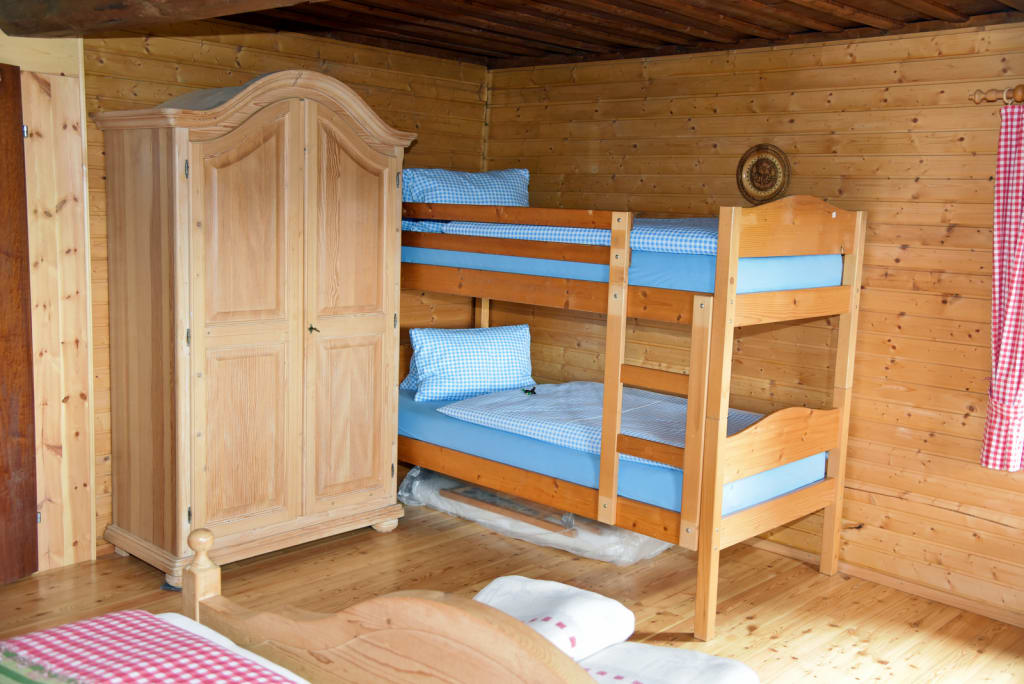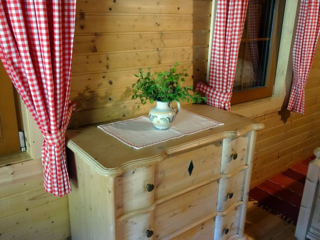 Vorraum mit Garderobe und Abstellmöglichkeit, Wohnstube mit Küchenzeile – komplett ausgestattet – Holzherd, Abwasch, Ess- & Kochgeschirr; Sitzecke; Couch. Bad mit Dusche, Waschbecken und WC und Holzofen zur Warmwasseraufbereitung für Küche und Bad. Ein großes, helles mit Holz gemütlich eingerichtetes Schlafzimmer mit einem Doppelbett und ein Stockbett. Gitterbett (inkl. Bettwäsche) u. Hochstuhl kann auf Wunsch zur Verfügung gestellt werden