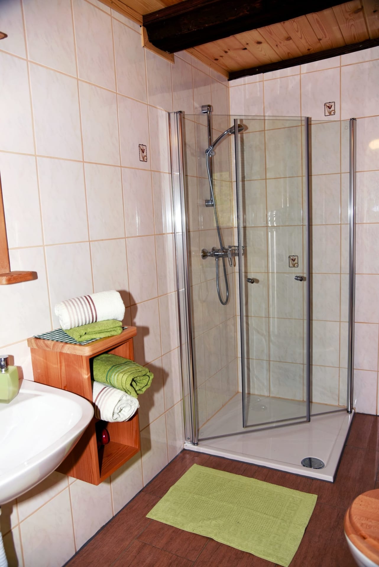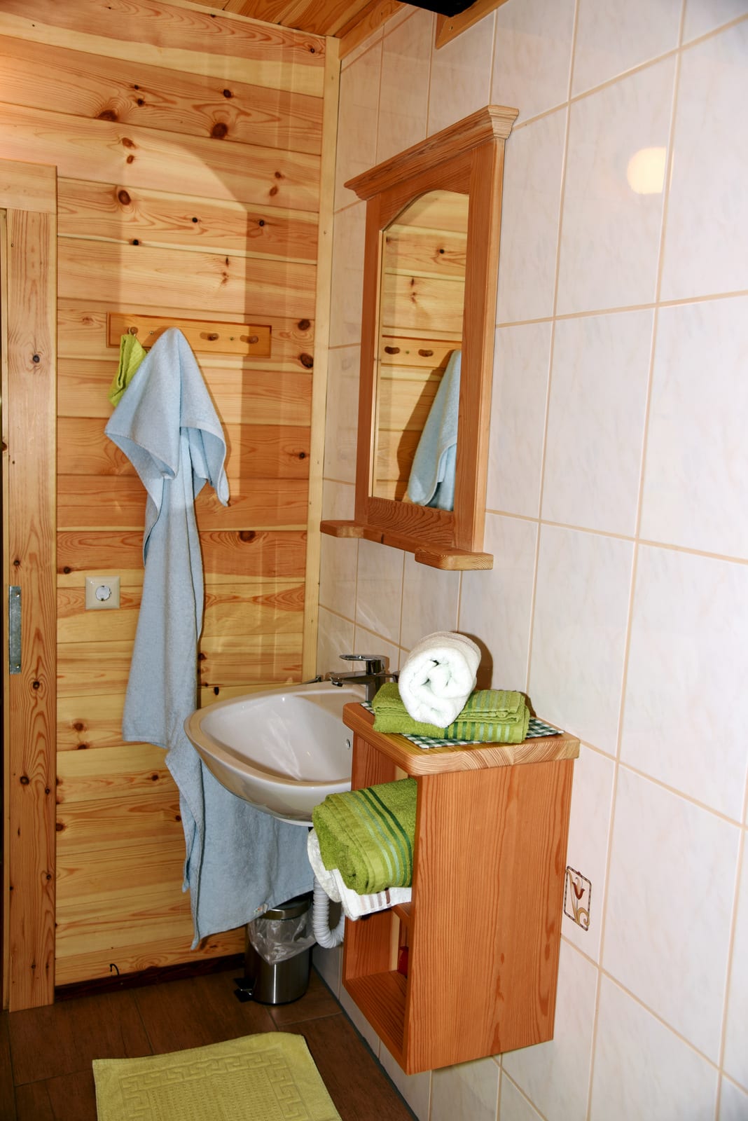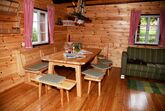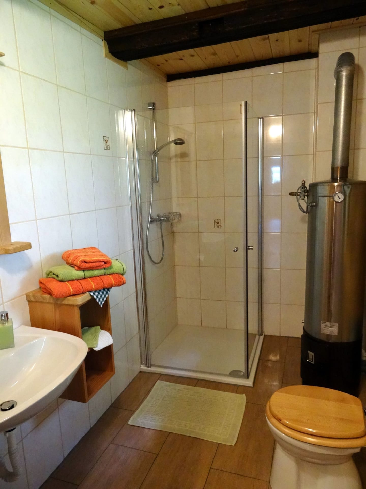 Vorraum mit Garderobe und Abstellmöglichkeit, Wohnstube mit Küchenzeile – komplett ausgestattet – Holzherd, Abwasch, Ess- & Kochgeschirr; Sitzecke; Couch. Bad mit Dusche, Waschbecken und WC und Holzofen zur Warmwasseraufbereitung für Küche und Bad. Ein großes, helles mit Holz gemütlich eingerichtetes Schlafzimmer mit einem Doppelbett und ein Stockbett. Gitterbett (inkl. Bettwäsche) u. Hochstuhl kann auf Wunsch zur Verfügung gestellt werden