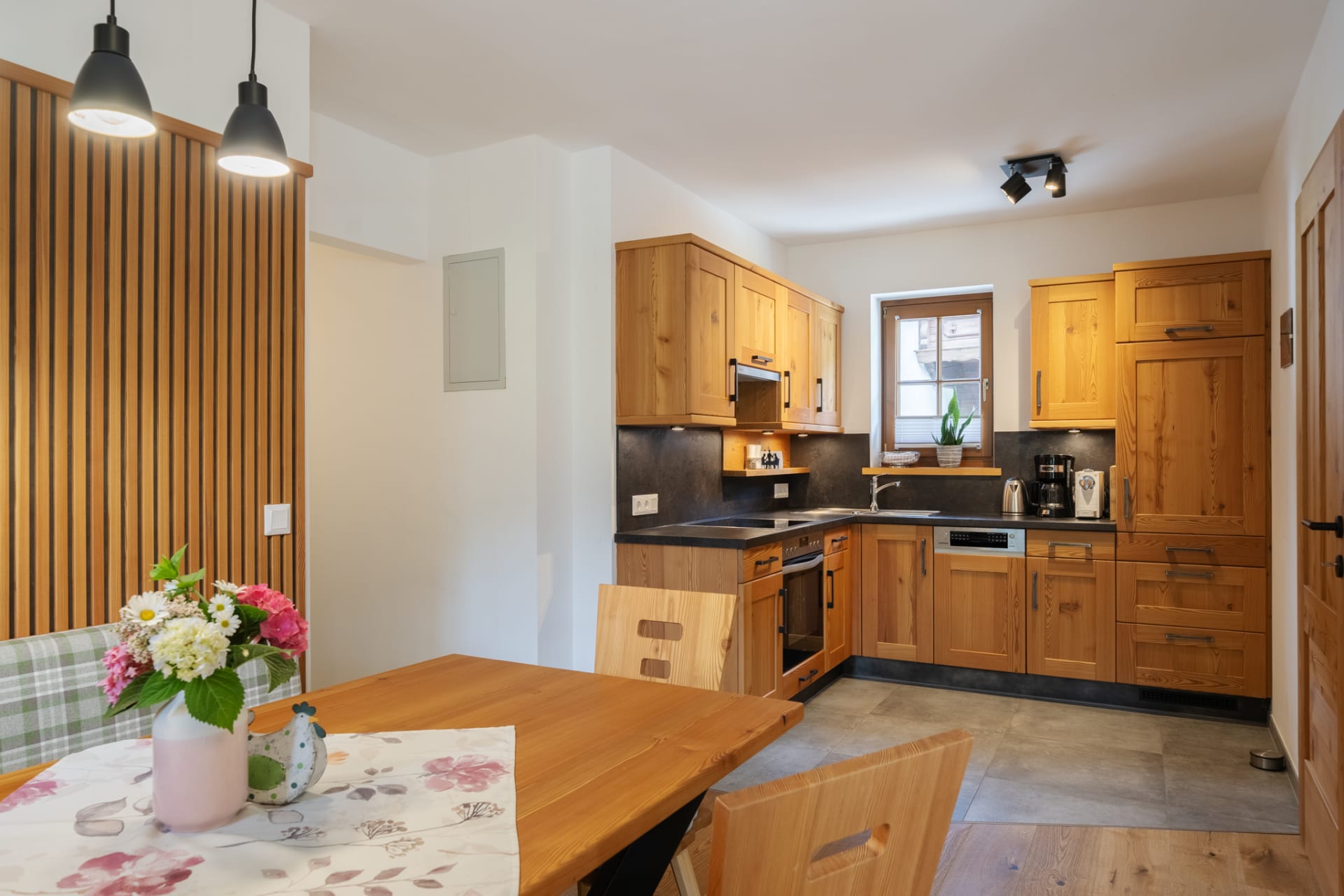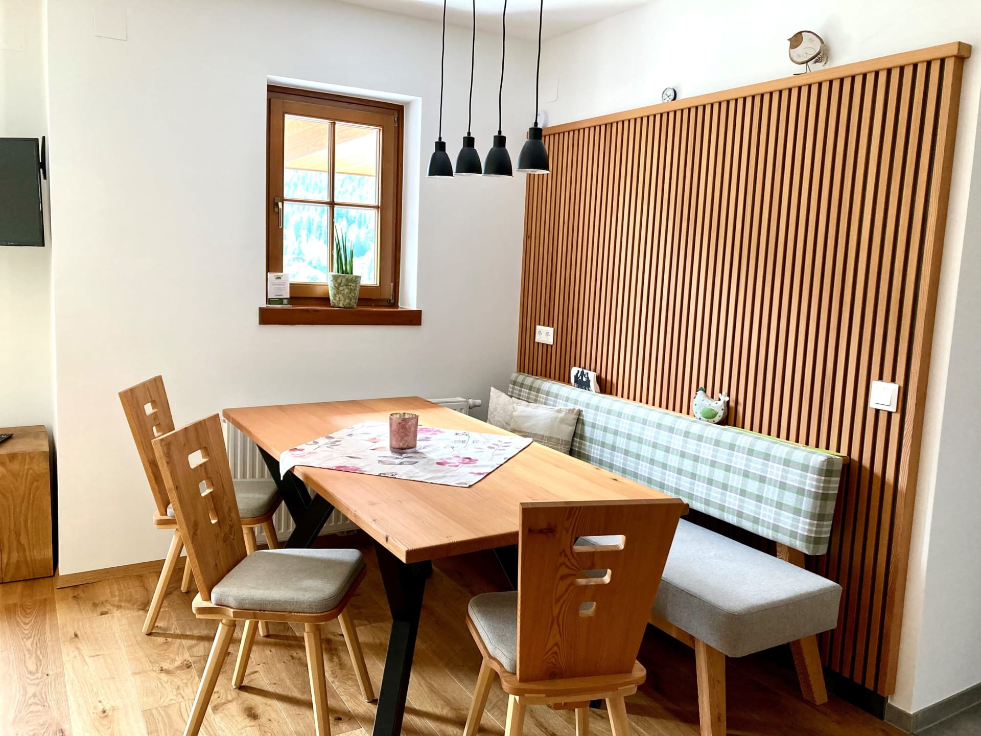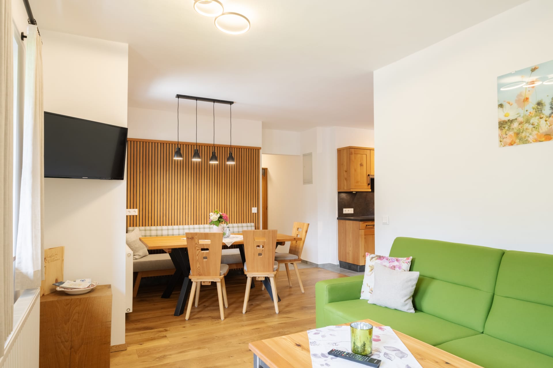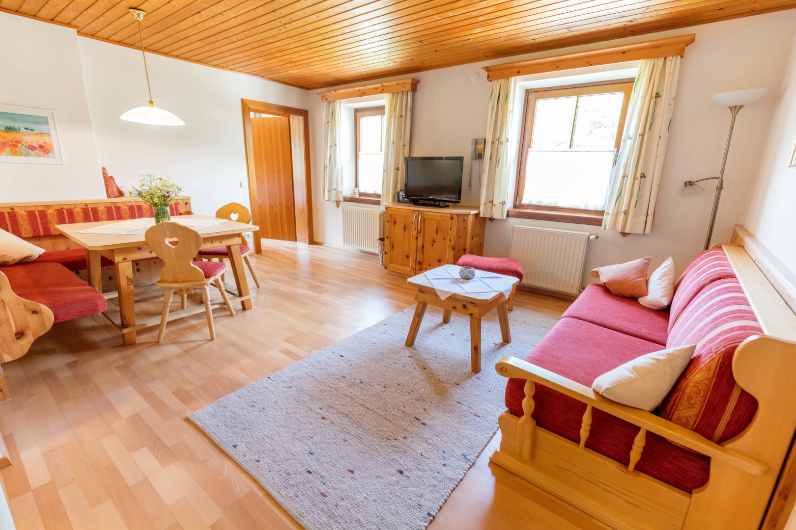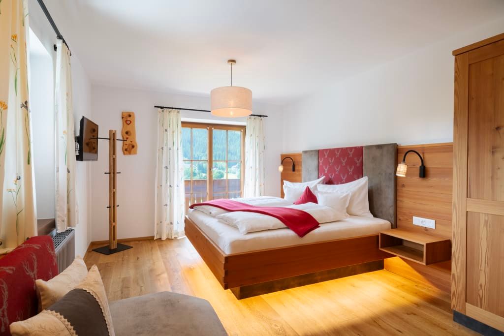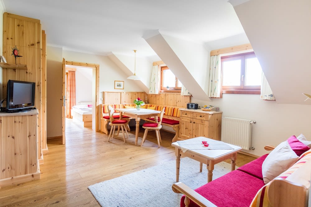 Unser Appartement aus heimischen Lärchenholz ist ausgestattet mit einer voll eingerichteten Küche, zwei Schlafzimmer, Wohnraum, Bad, WC, Radio, Sat-TV, WLAN und einer großen Terrasse mit Blick auf das Kirchheimertal.