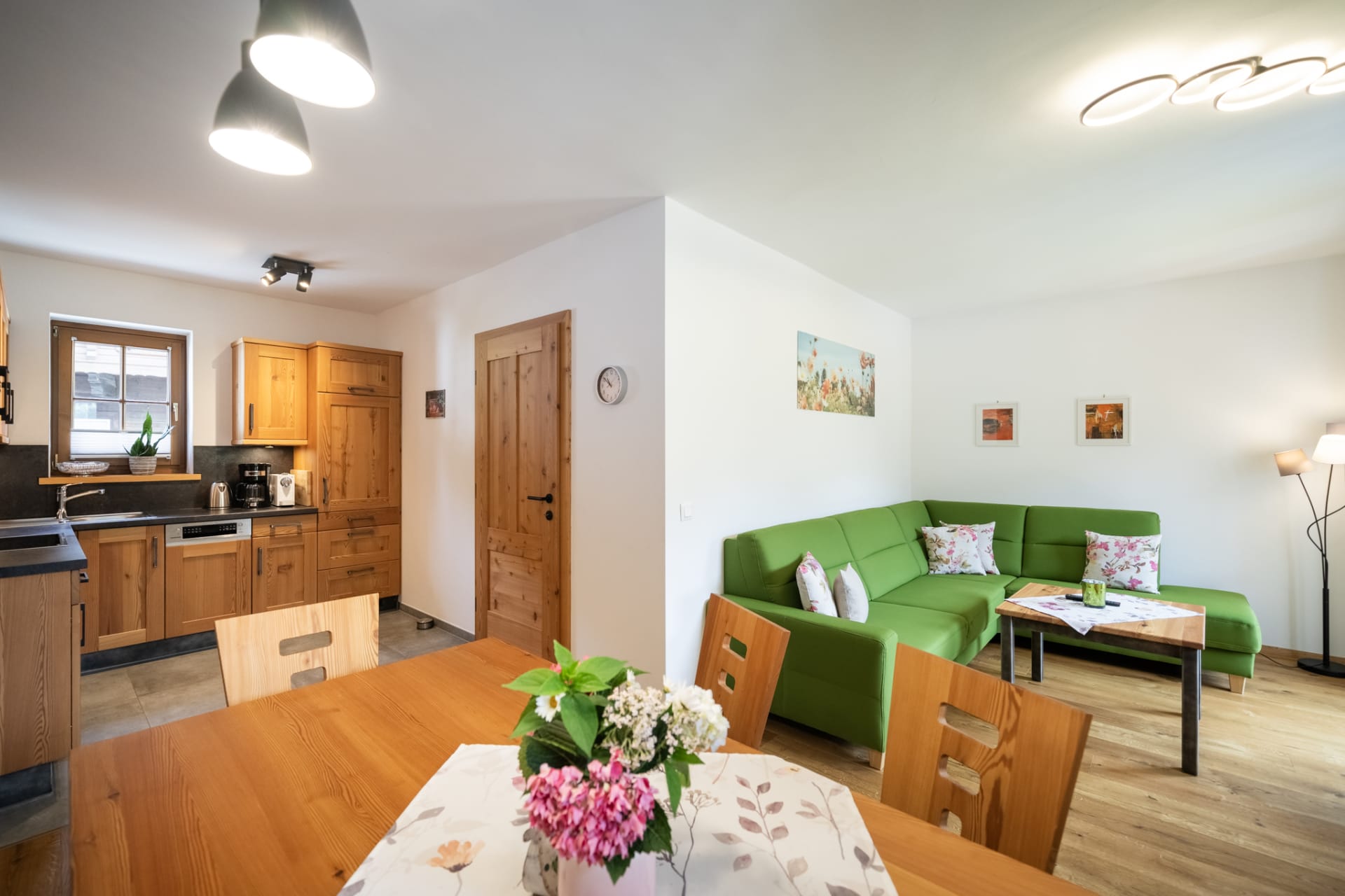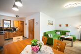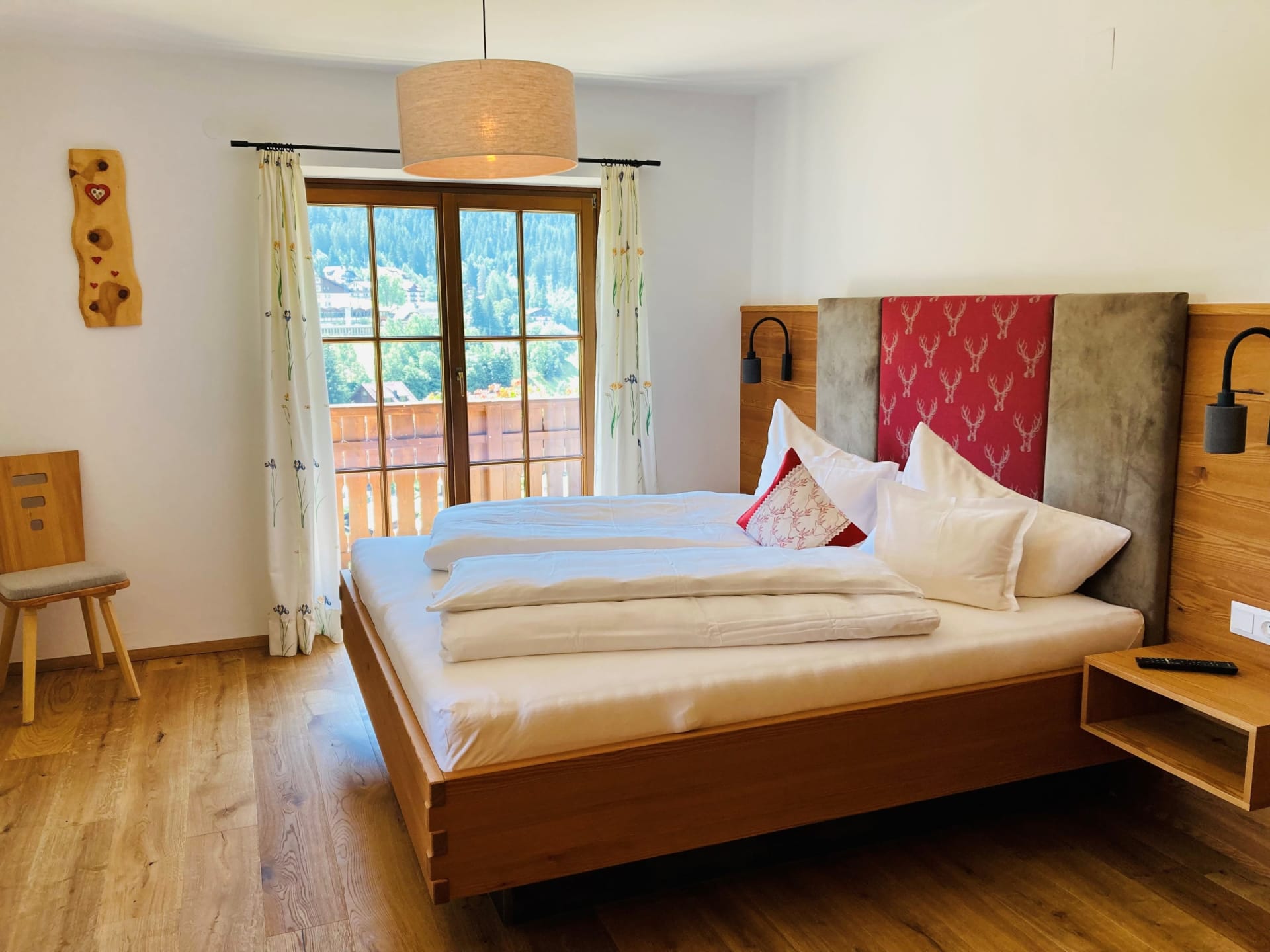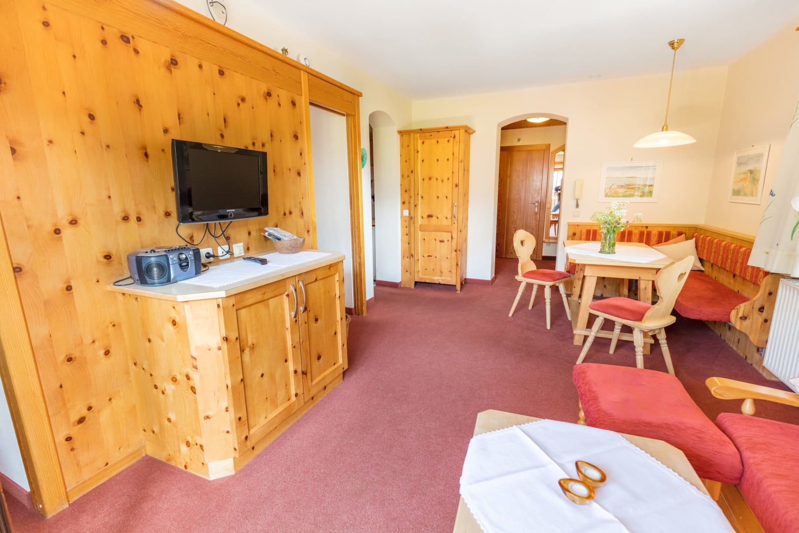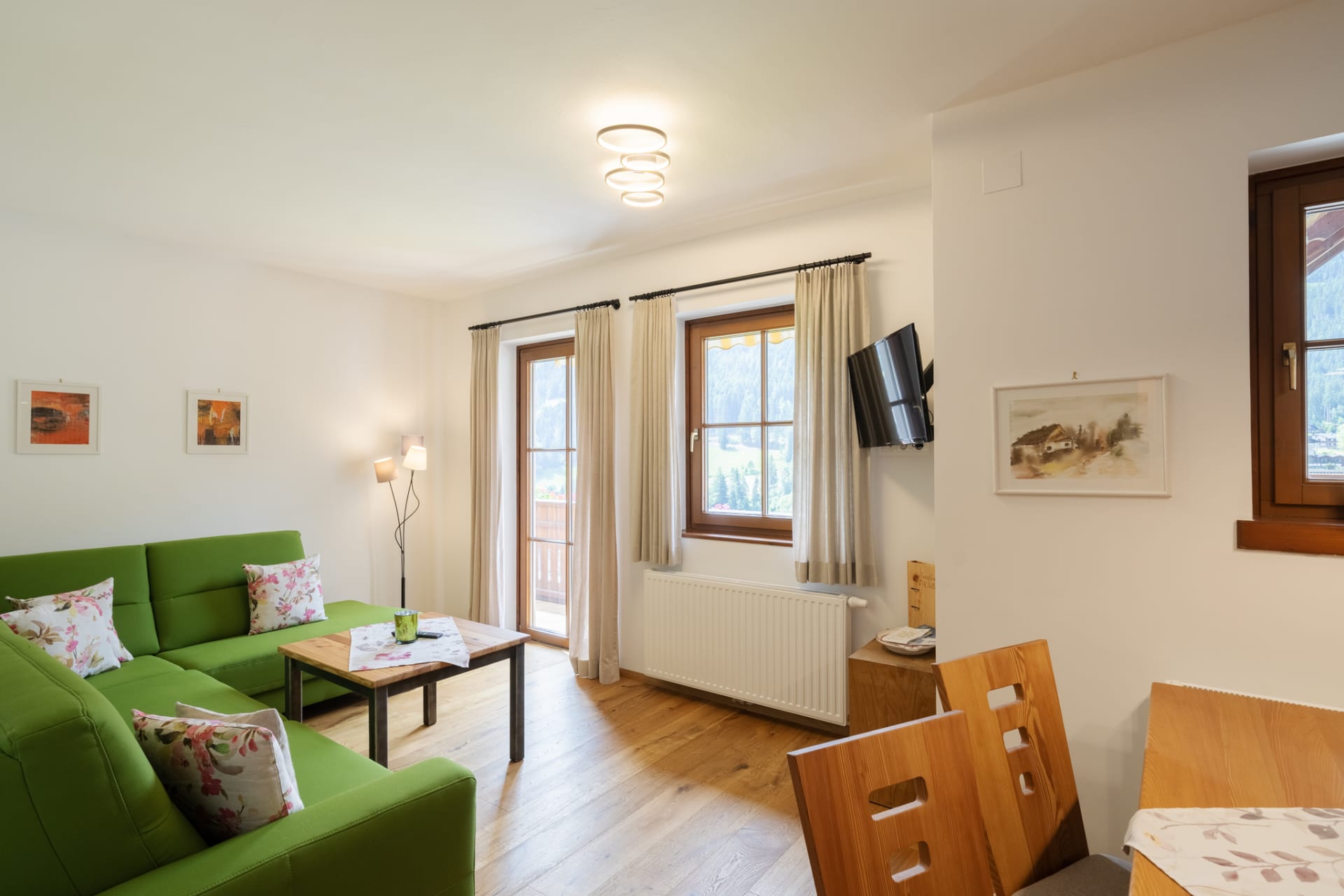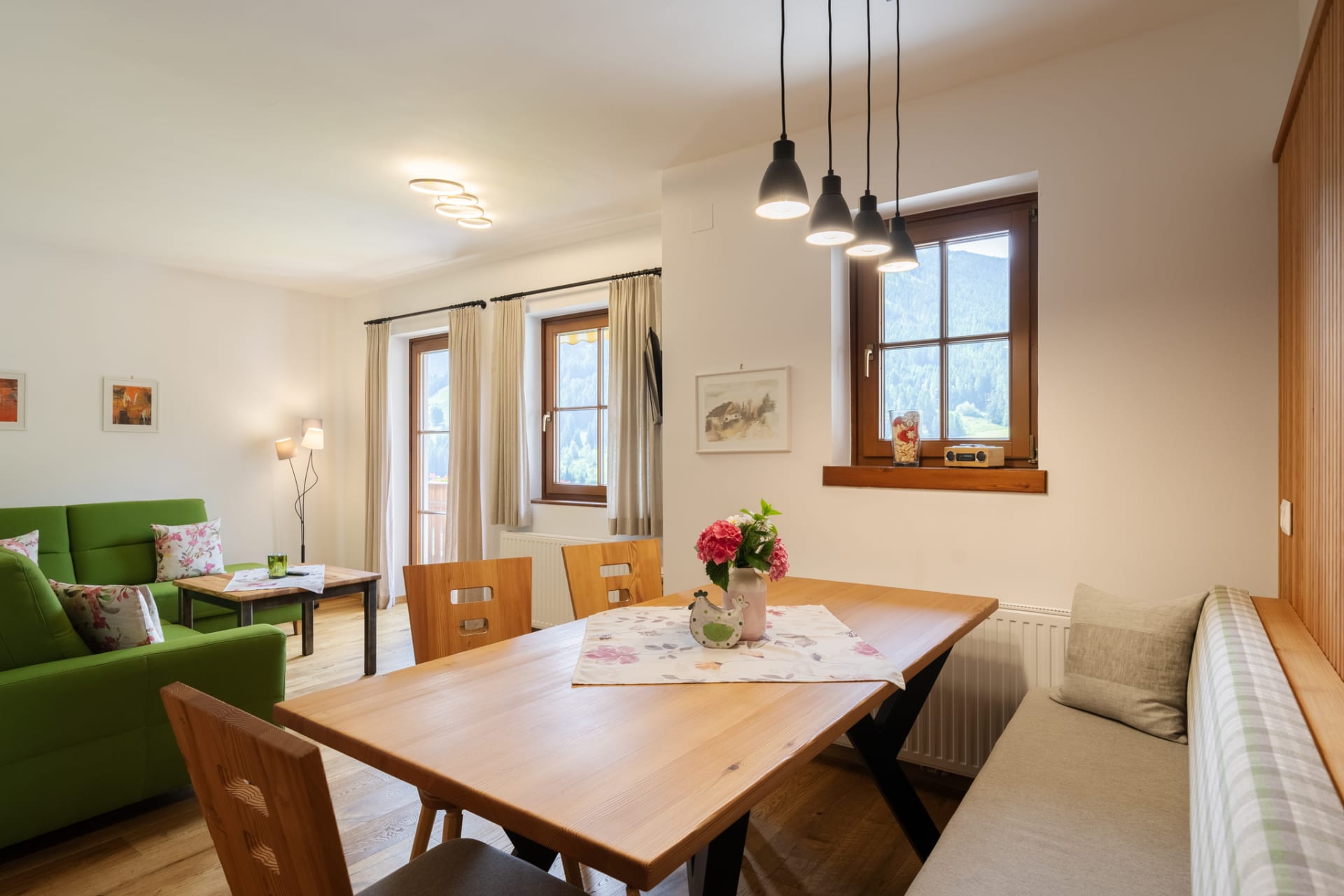 Unser Appartement aus heimischen Lärchenholz ist ausgestattet mit einer voll eingerichteten Küche, zwei Schlafzimmer, Wohnraum, Bad, WC, Radio, Sat-TV, WLAN und einer großen Terrasse mit Blick auf das Kirchheimertal.