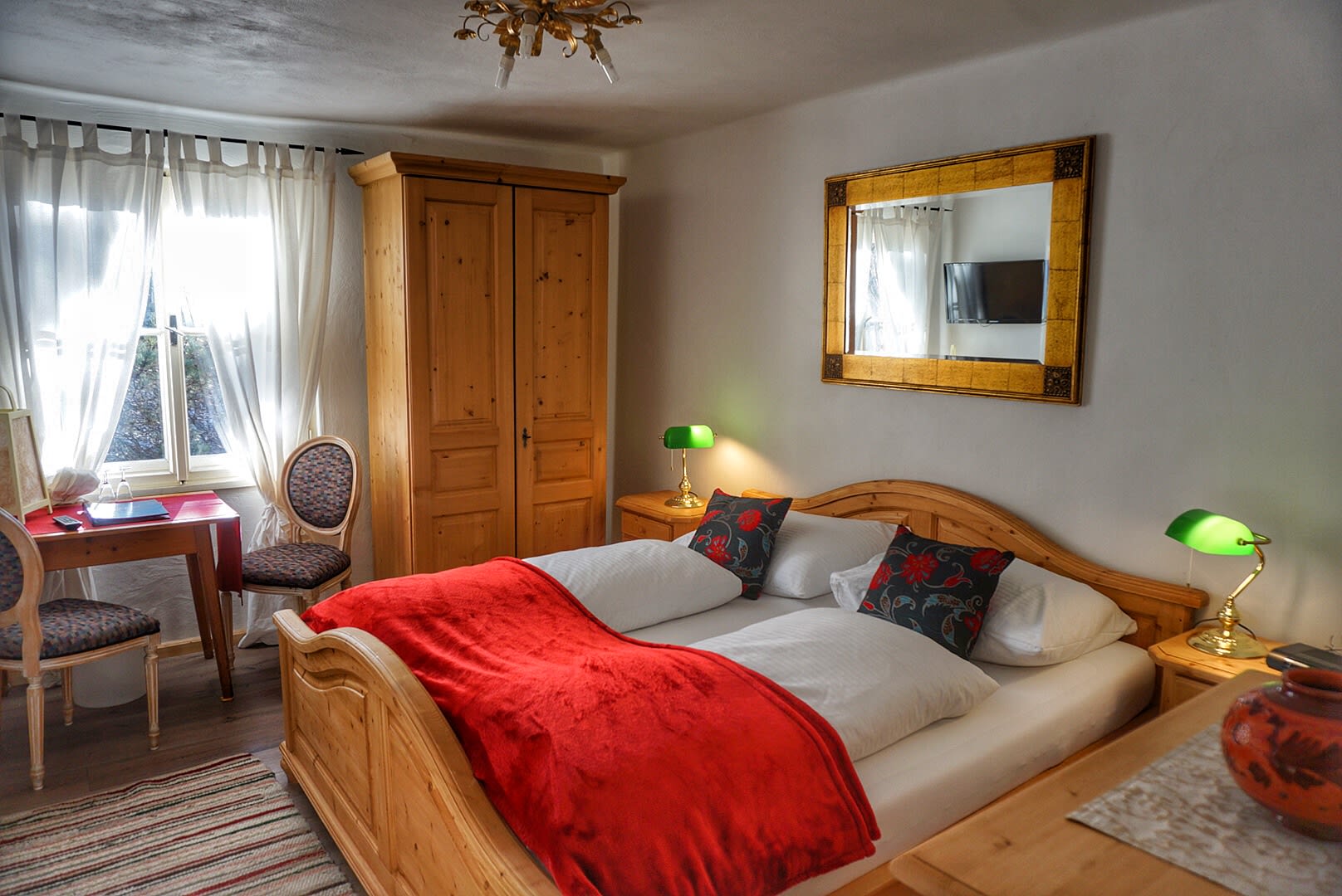 Zimmer mit Doppelbett, Schrank, Tisch, Stühlen, Flachbild TV. Bad mit Dusche oder Badewanne/ WC, ohne Balkon.
