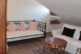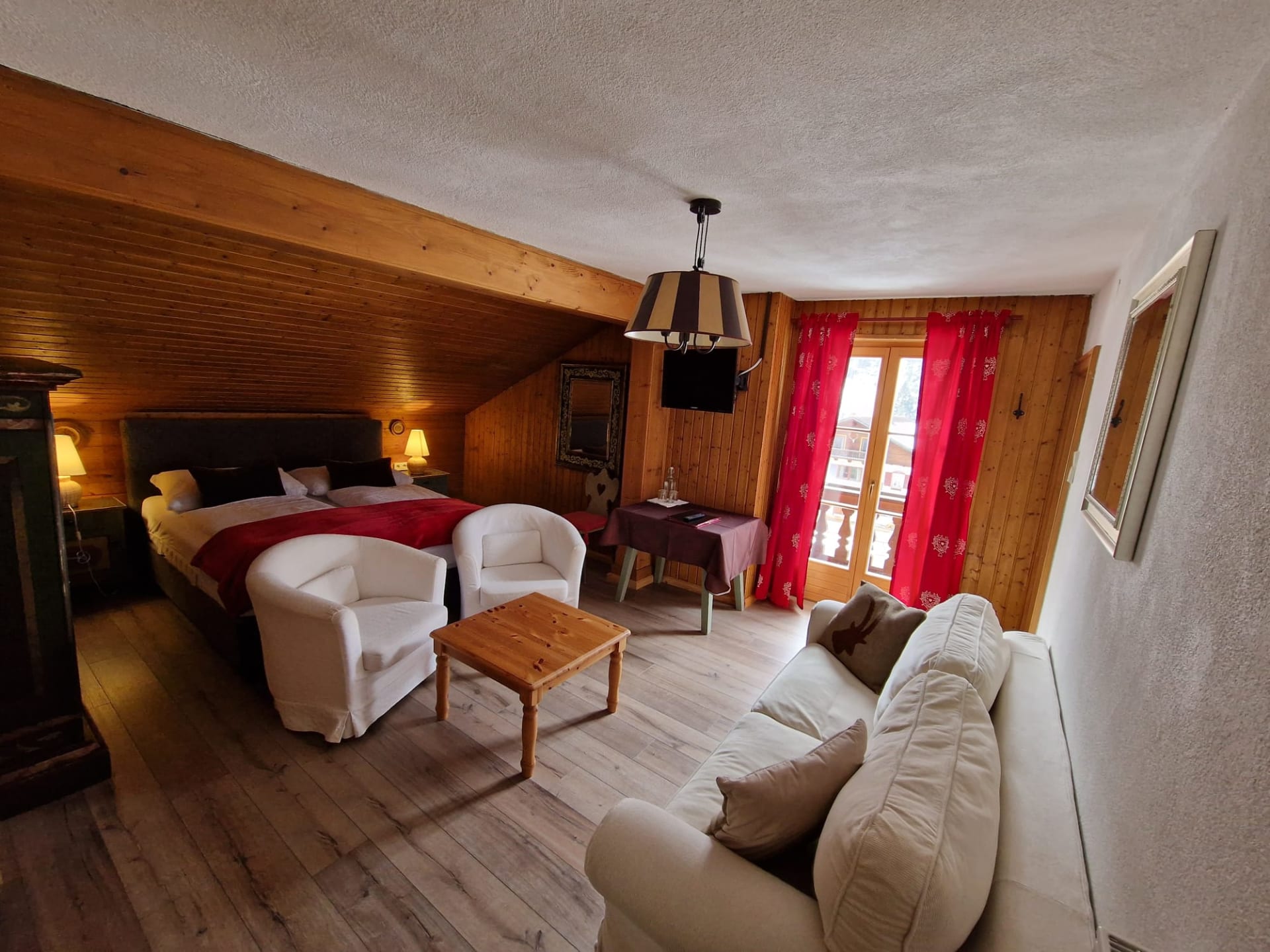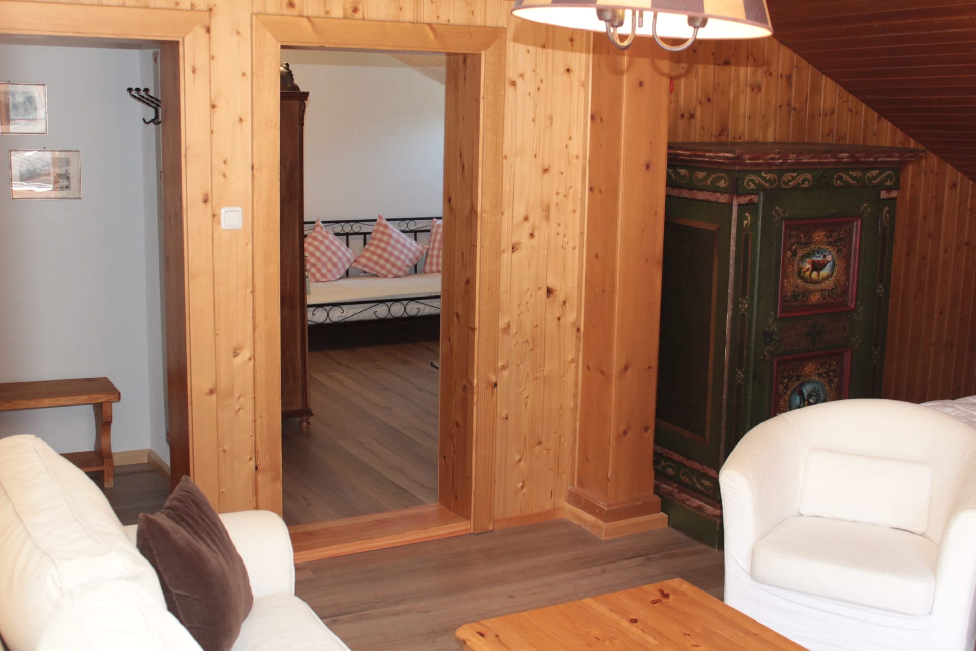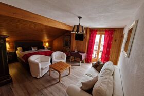 zwei separate Zimmer mit Verbindungstür im Dachschräge, ein Zimmer mit Doppelbett, Schlafsofa, Balkon, Flachbild TV, Bad mit Doppelwaschbecken, Dusche/ WC, und ein Zimmer mit Einzelbett und Schlafsofa, Flachbild TV, Bad mit Dusche/ WC, Waschbecken.