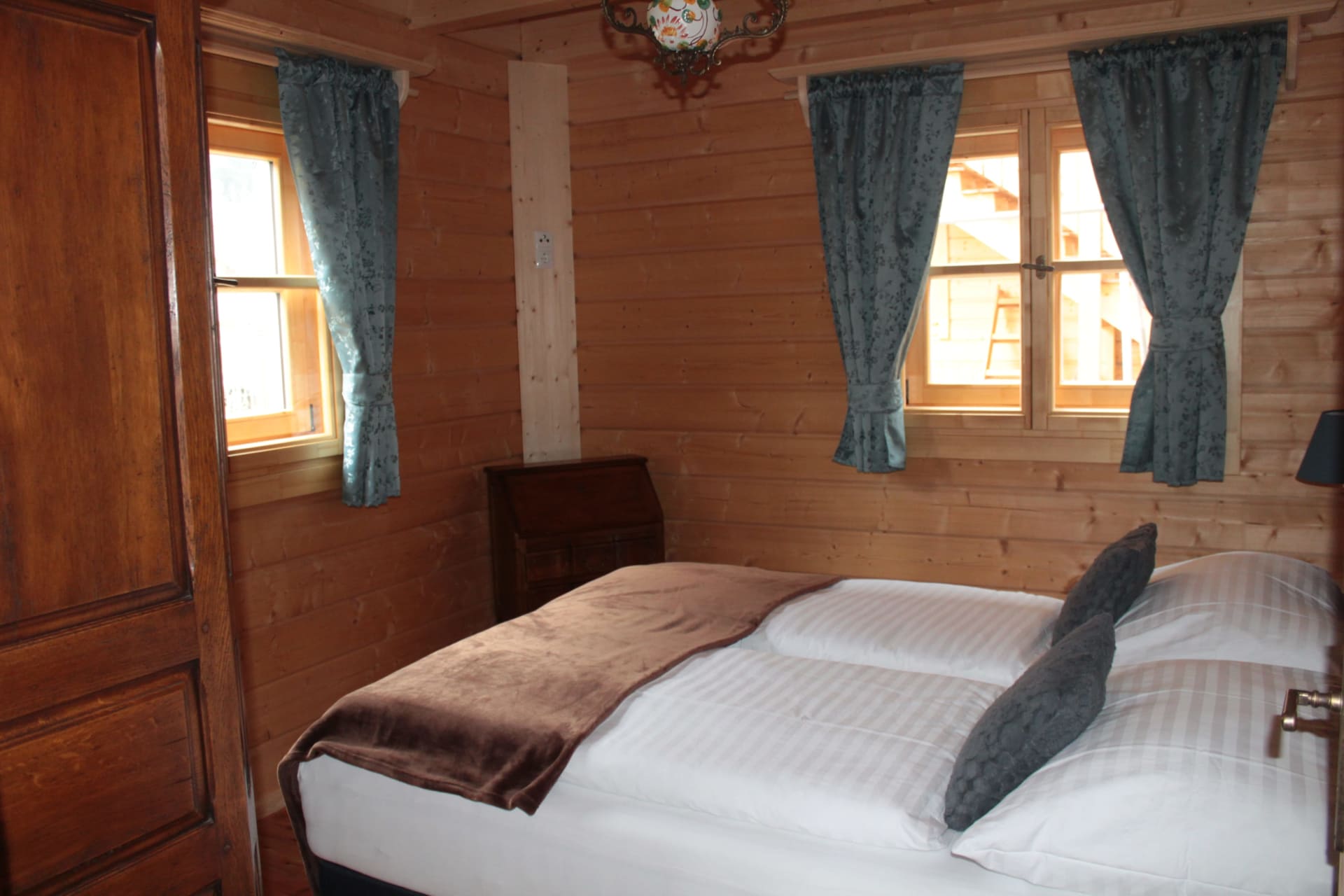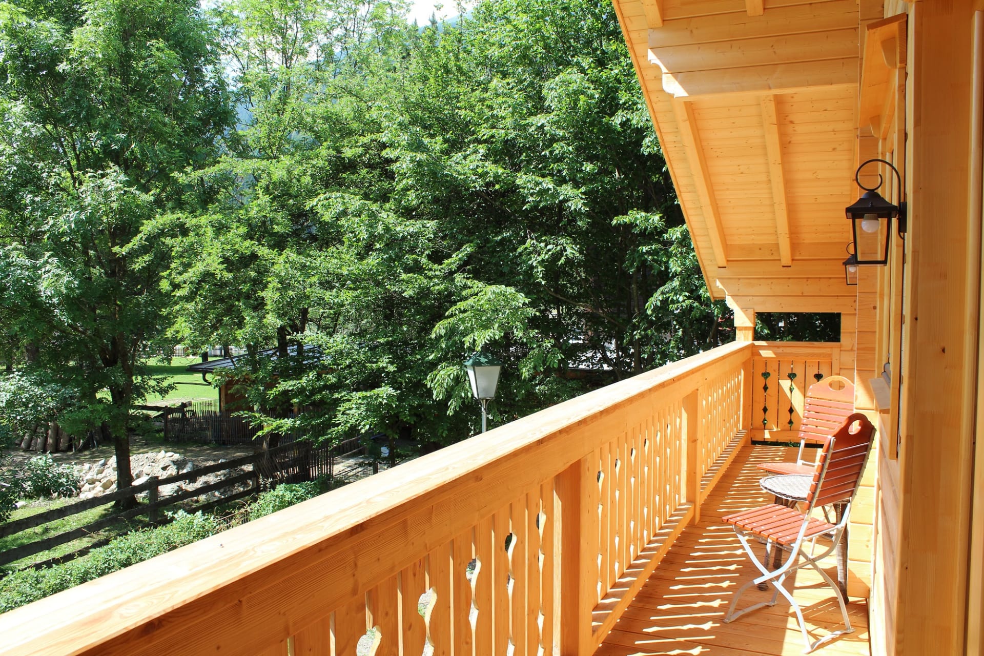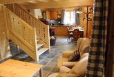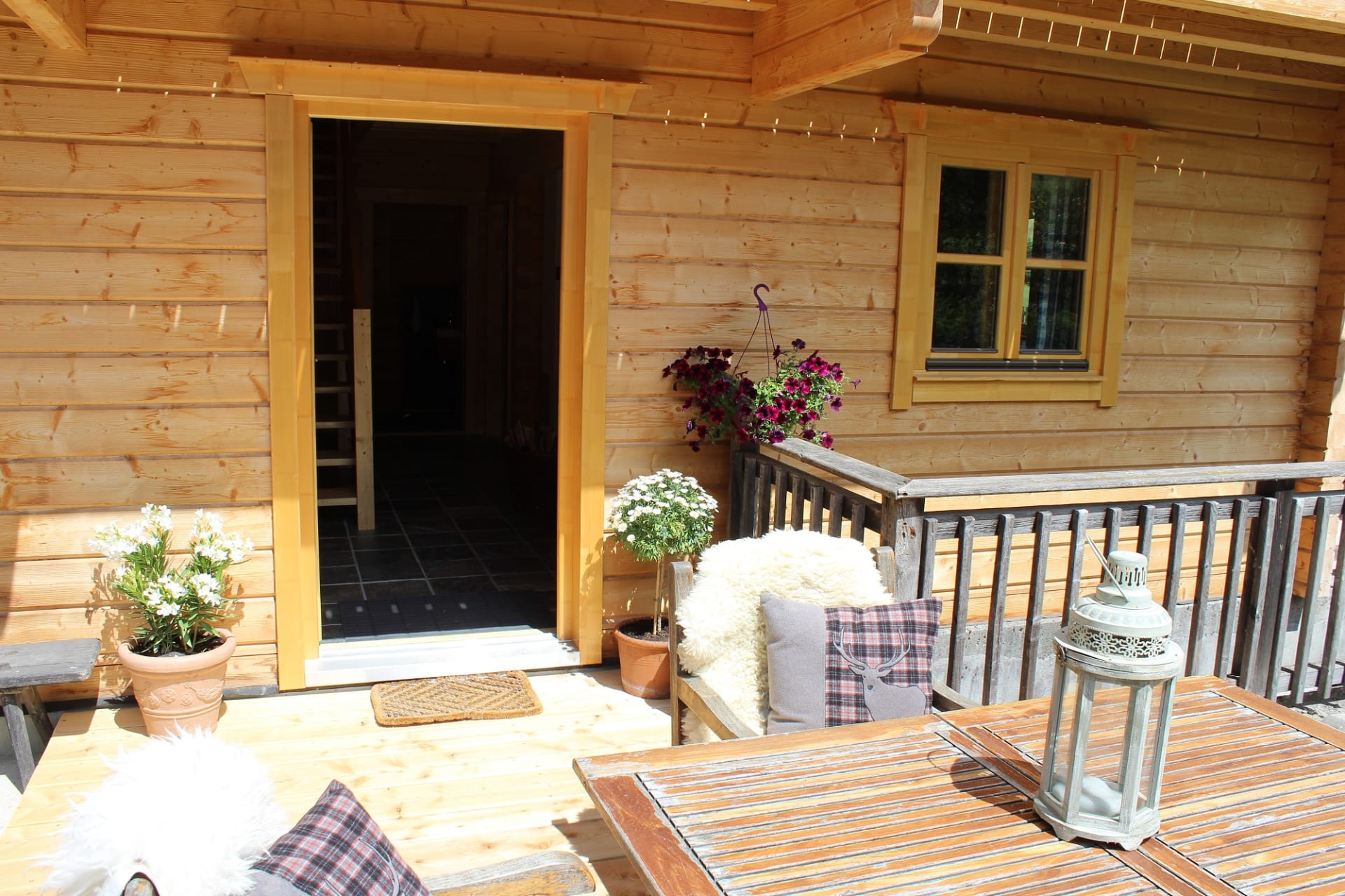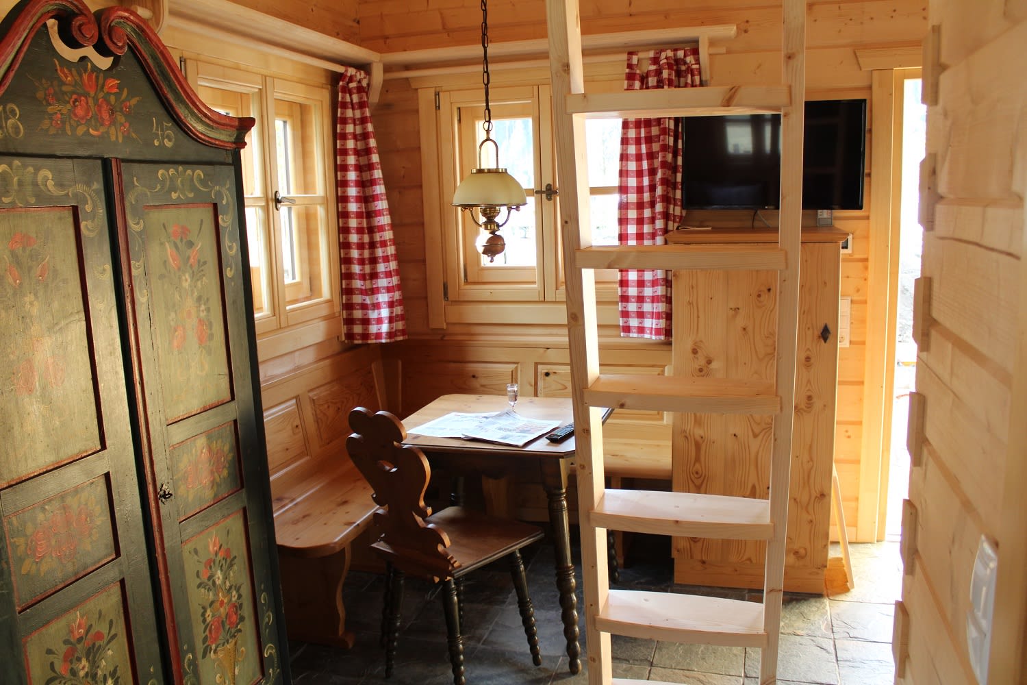 In unterem Stockwerk befindet sich eine offene Wohnküche mit komplett ausgestattete Holz Einbauküche, einer Essecke, Kachelofen, Wohnzimmer, ein Schlafzimmer mit Box Spring Doppelbett, ein Badezimmer mit Infrarotkabine, einer Dusche und Waschbecken. Separat befindet sich im unterem Stockwerk noch ein WC. Das obere Stockwerk verfügt über zwei große Schlafzimmer. Beide Schlafzimmer ausgestattet mit jeweils einem Box Spring Doppelbett, in einem Schlafzimmer befindet sich noch ein ausziehbares Schlafsofa. Beide Schlafzimmer führen auf einen großzügigen Balkon mit Blick auf die Tiere und Berge. Weiterhin befindet sich hier ein zweites Badezimmer mit Waschbecken, Dusche und WC.