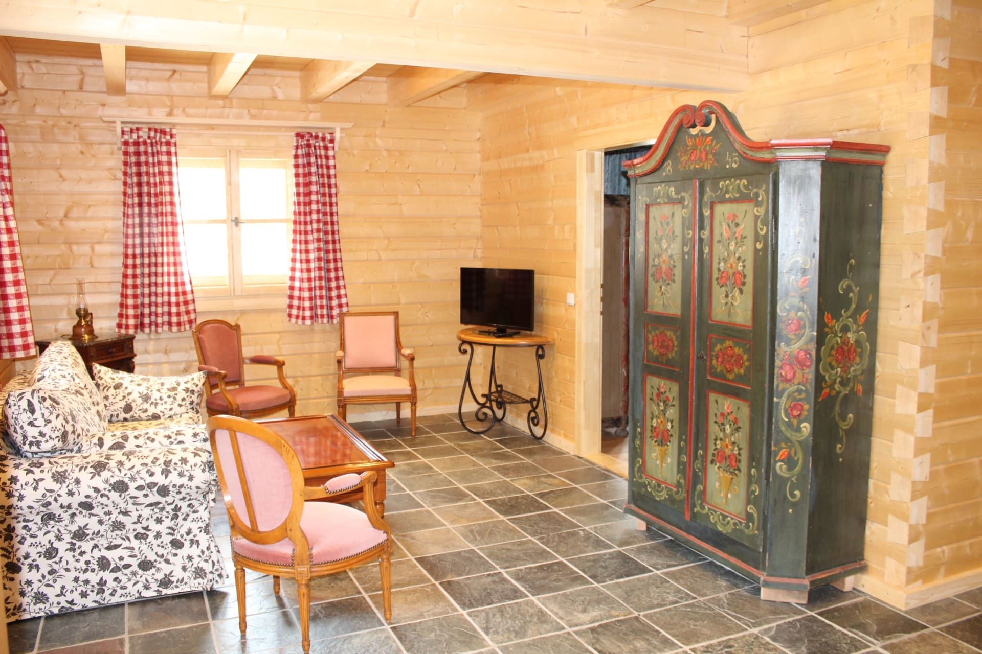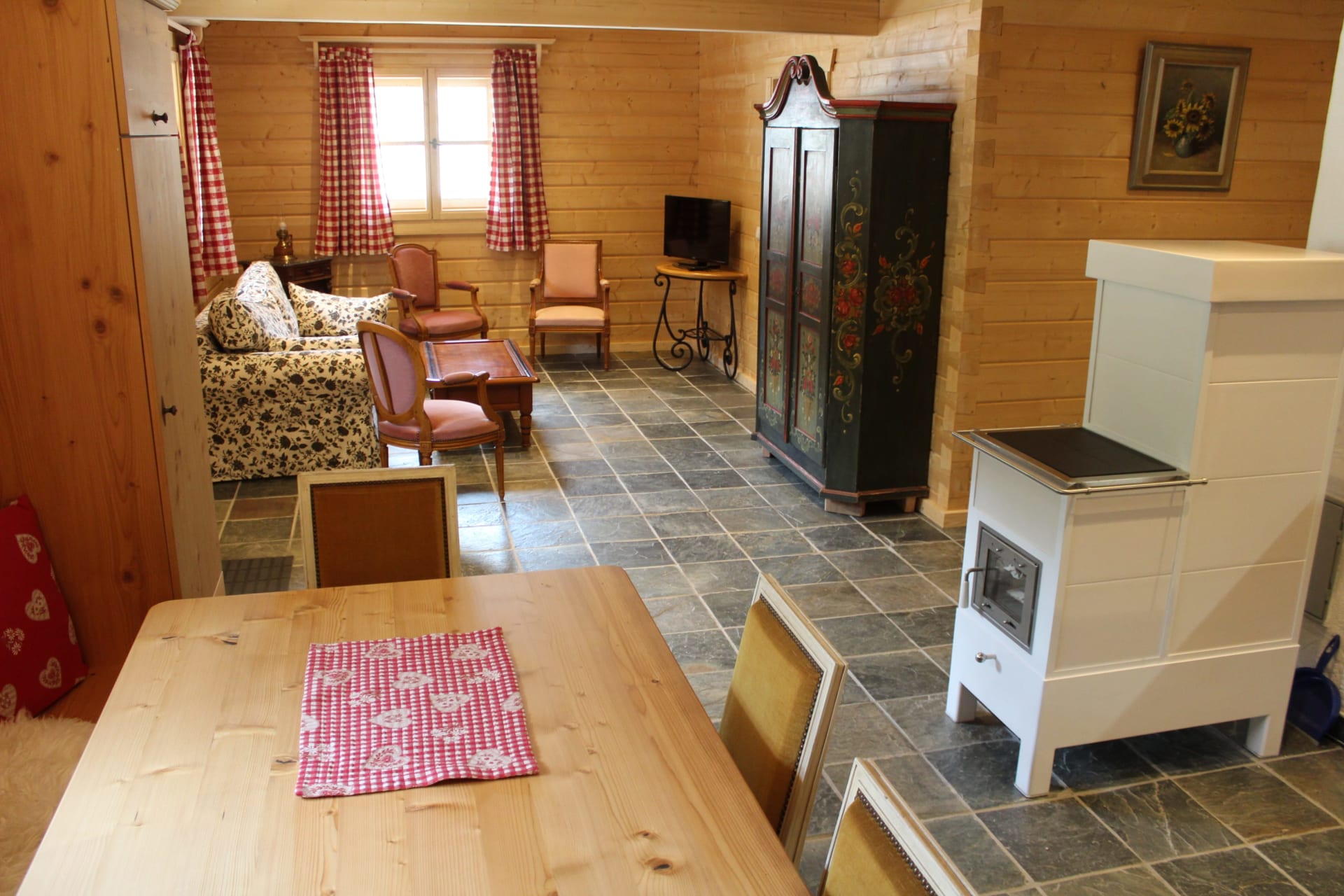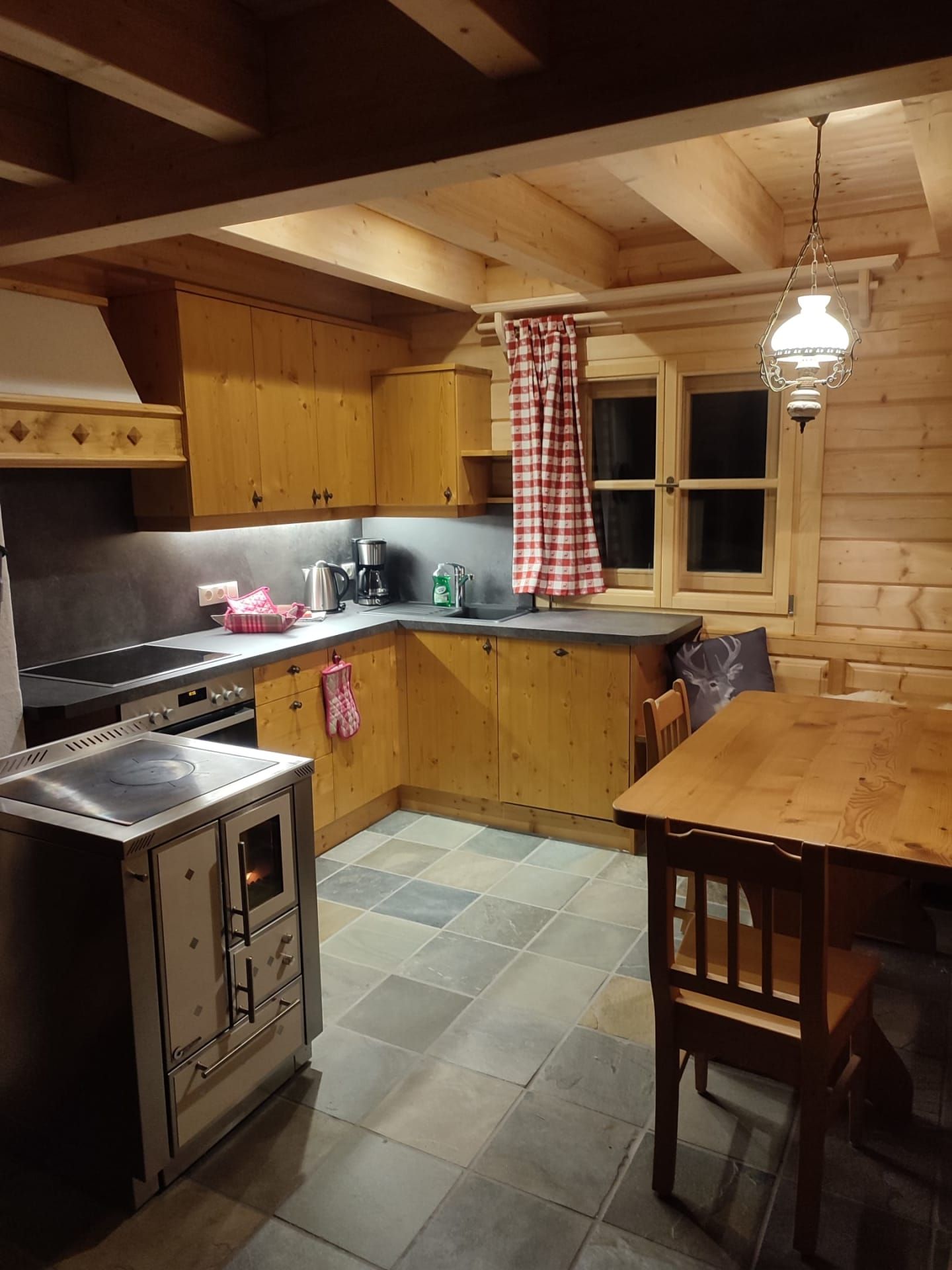 Als Ausstattung bieten wir eine komplett ausgestattete Massivholzwohnküche, eine Essecke mit Eckbank. Weiters ein Wohnzimmer mit ausziehbarer Couch, SAT Flachbild TV, ein Schlafzimmer mit Box Spring Doppelbett, Stockbett, ein Bad mit Infrarotkabine, Dusche und Waschbecken. Das WC ist separat. Die Böden sind aus Natursteinen, im Schlafzimmer ein heimischer Lärchen Boden. Beheizt wird das Chalet über einer Fußbodenheizung. Sie lieben es urig, dann sind Sie genau richtig und heizen das Chalet zusätzlich mit einem Kachelofen mit kleiner Herdplatte.