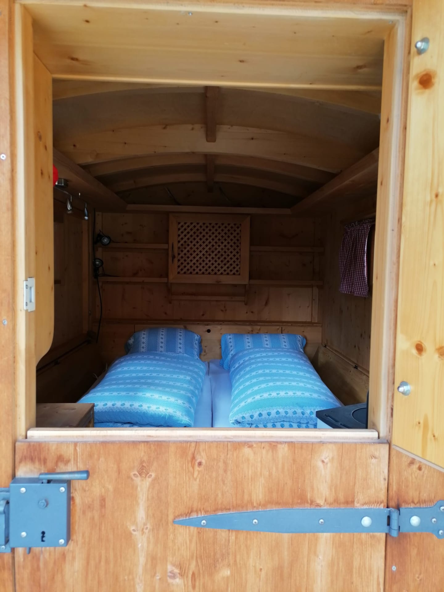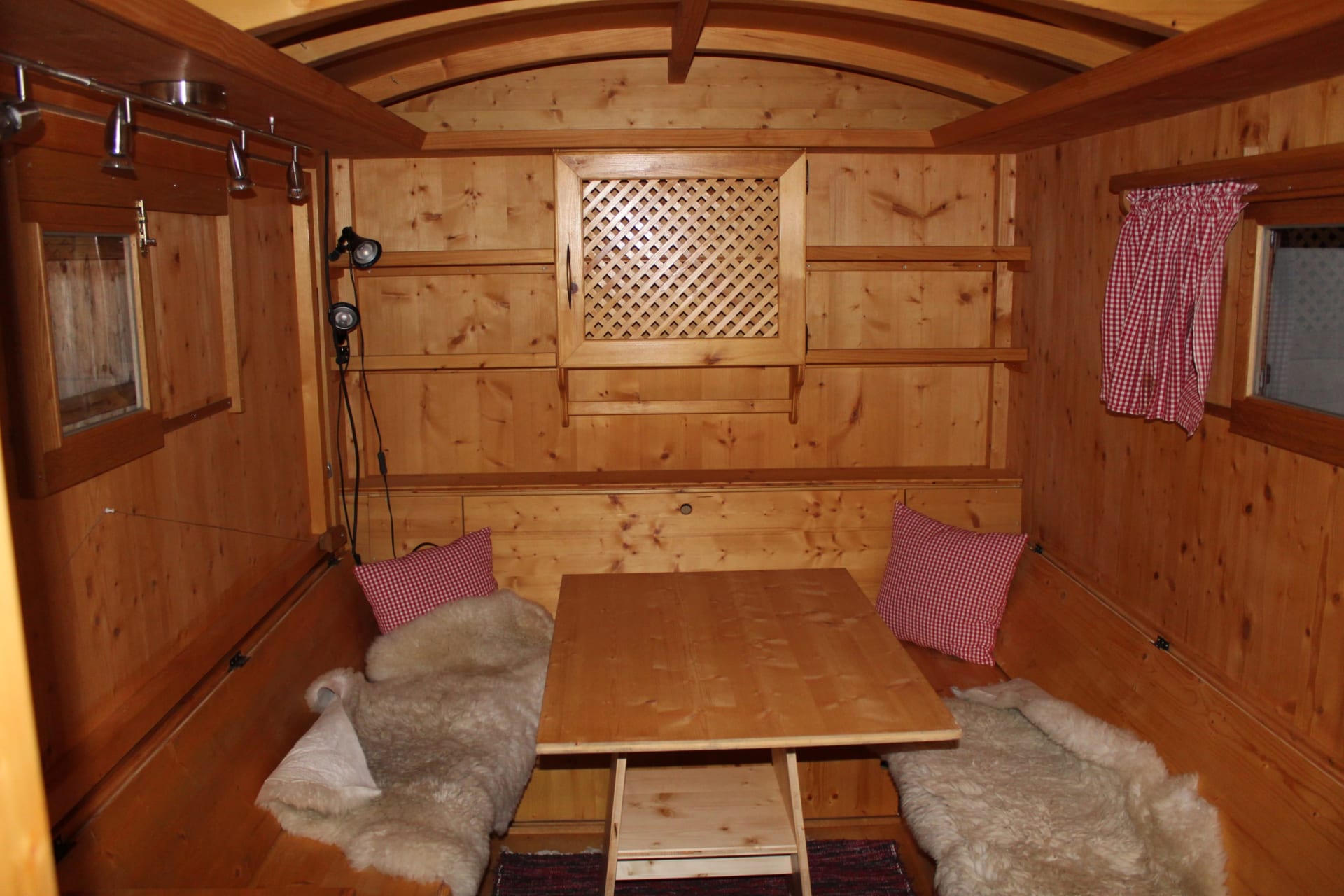 Auf unserem Areal Hotel & Chalets Schlosswirt haben Sie die Möglichkeit, unser Schäferwagen für ein paar unvergessliche Tage und Nächte zu buchen, und so zu übernachten, wie es die Schäfer heute noch gelegentlich machen. Ausgestattet ist der Schäferwagen mit einem aufbaubaren Bett mit Matratze für entweder 1-2 Erwachsene oder zwei Kinder mit Bettwäsche, Handtücher, Tisch, Eckbank, Holzofen, Innenbeleuchtung, Steckdose 230V, Stauraum, (Picknick-Korb mit Teller, Tassen, Besteck und Gläser auf Anfrage). Zu Verfügung steht Ihnen ebenfalls ein Outdoorbereich mit Tisch und Stühle. Ein Wasseranschluss befindet sich in der Nähe. Dieser Schäferwagen ist auch in Verbindung mit einem Hotelzimmer, Apartment oder Chalet buchbar. Unser Wohnmobil Sanitär Bereich - Dusche, WC und Waschbecken steht Ihnen kostenlos zu Verfügung. Auf Anfrage bieten wir passend zu unseren Schäferwagenaufenthalten unsere Eselwanderung an.