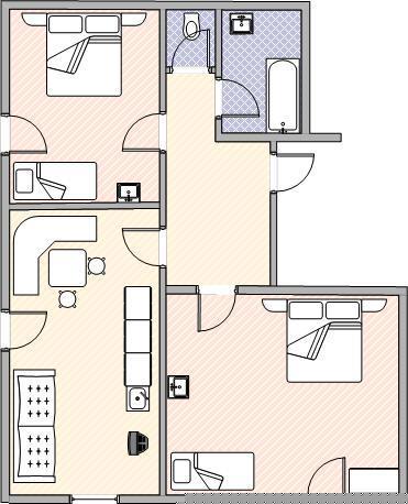 Modernes Appartement ca. 58 m² groß mit Wohnküche mit Essecke, Sitzcouch, Flat-TV, Balkon, WLAN, Radio und Küchenblock mit 4-Plattenherd, Backrohr, Kühlschrank inkl. Gefrierfach, Microwelle, Toaster, Kaffeemaschine, Geschirrspüler, Wasserkocher. 1 Doppelzimmer mit Sofa , 1 Dreibettzimmer mit Flat-TV, Dusche/Waschbecken, separates WC, ein Badezimmer mit Dusche.