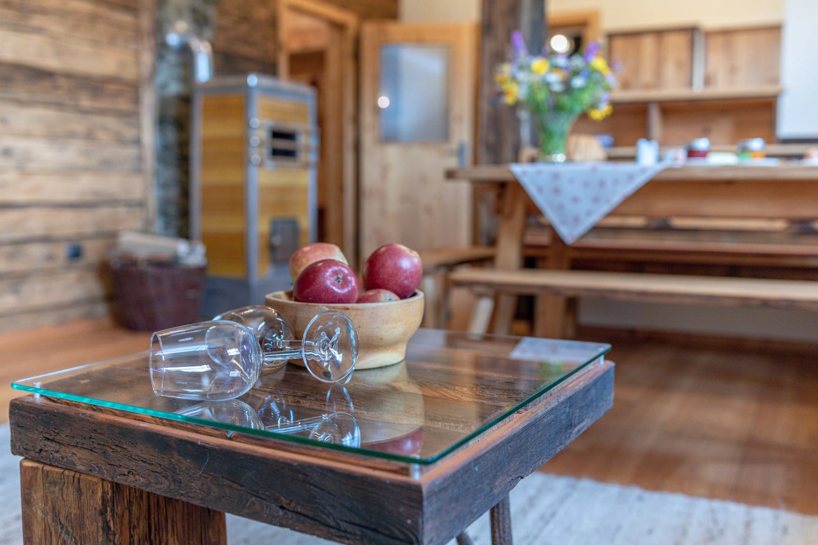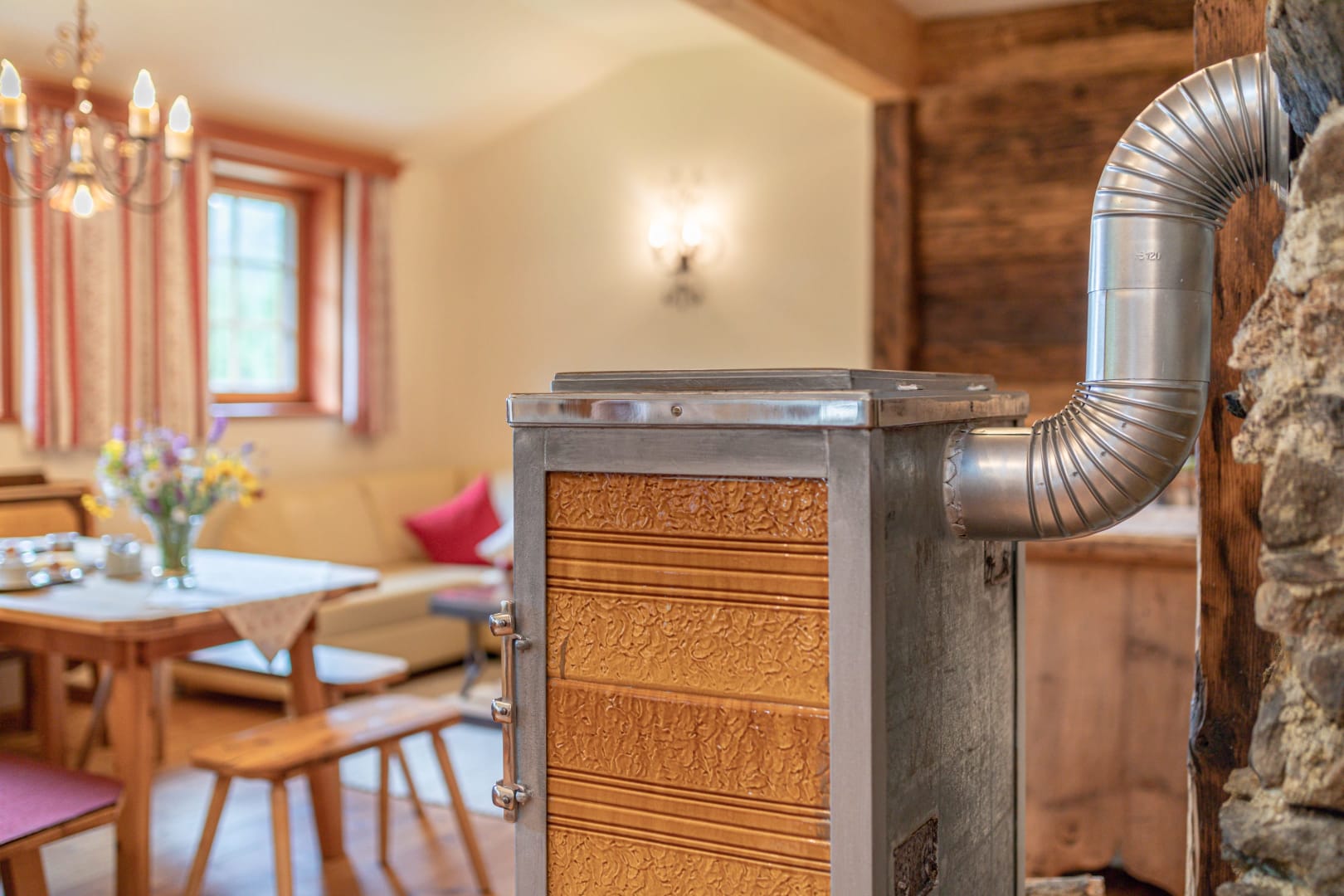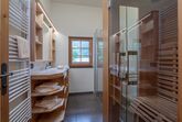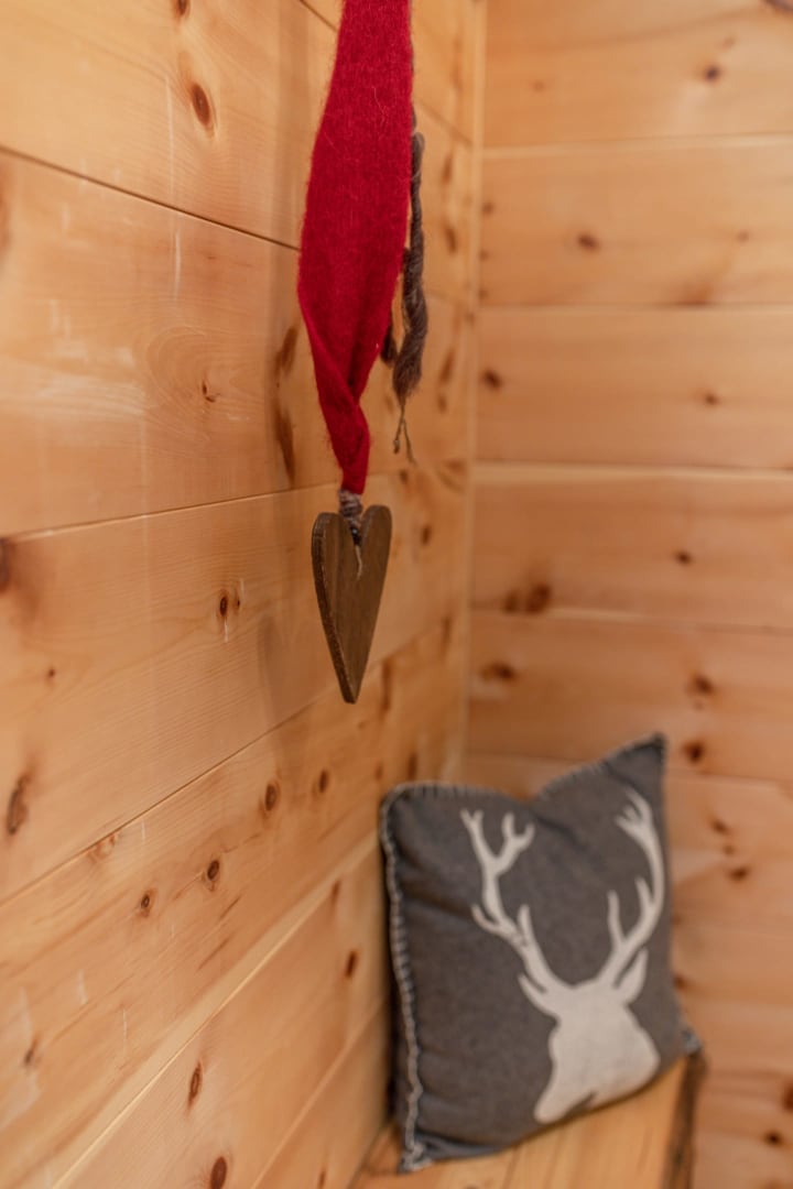 Vorraum mit Garderobe, Dusche mit Infrarotkabine, WC extra, Wohnküche (mit Raumteiler) voll ausgestattet mit Koch- und Essgeschirr, Kühlschrank mit Gefrierfach, Geschirrspüler, Cerankochfeld, Backrohr, Sitzecke, hochwertige Ledercouch, Holzofen. 2 Doppelbett-Zimmer. Gitterbett auf Wunsch vorhanden.