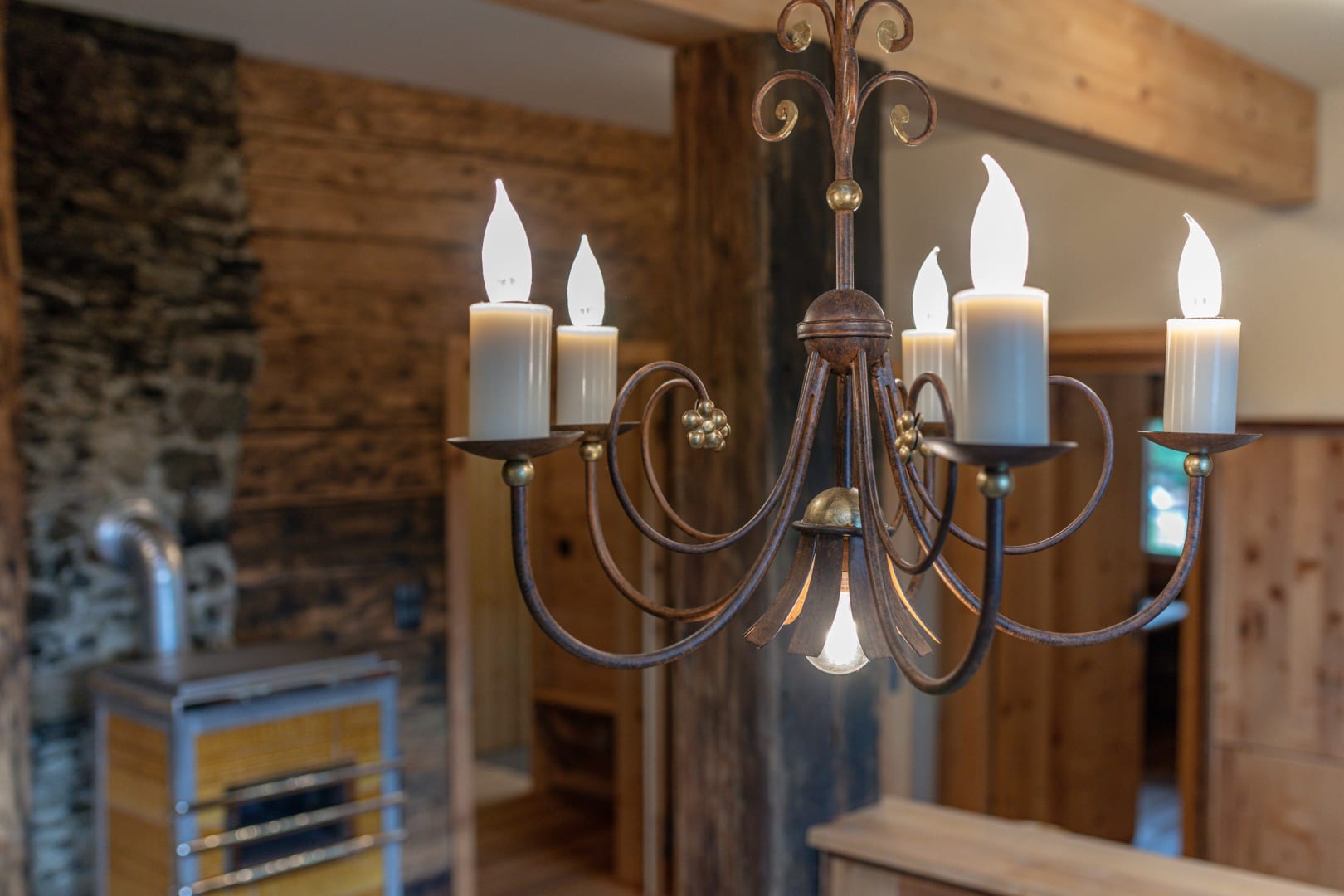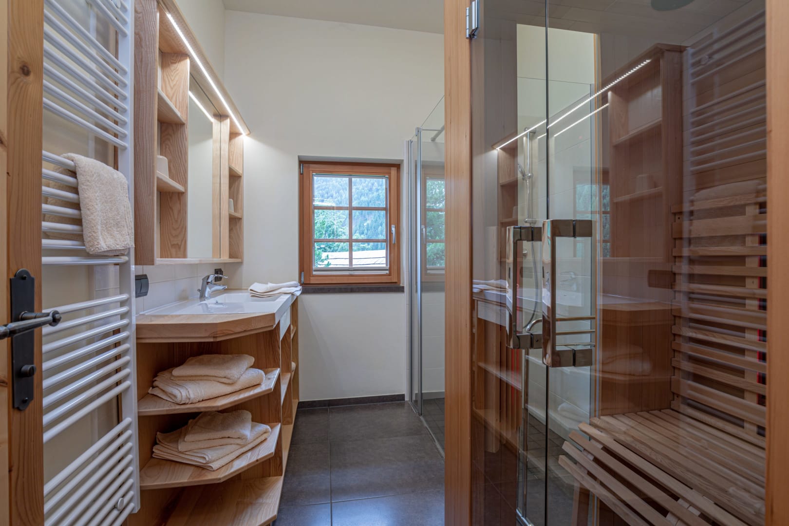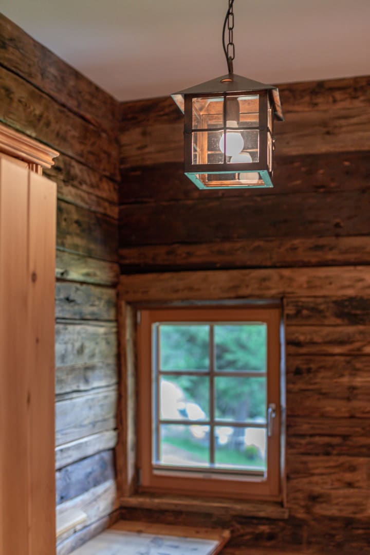 Vorraum mit Garderobe, Dusche mit Infrarotkabine, WC extra, Wohnküche (mit Raumteiler) voll ausgestattet mit Koch- und Essgeschirr, Kühlschrank mit Gefrierfach, Geschirrspüler, Cerankochfeld, Backrohr, Sitzecke, hochwertige Ledercouch, Holzofen. 2 Doppelbett-Zimmer. Gitterbett auf Wunsch vorhanden.