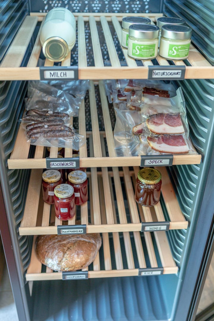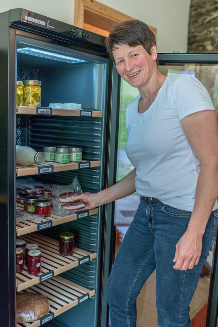 Wenn der Magen knurrt, deckt sich Ihr Tisch fast von selbst. Aus dem kleinen Selbstbedienungs-Kühlschrank entnehmen Sie ganz unkompliziert selbstgebackene Weckerln, hausgemachten Speck, Milchprodukte und Vieles mehr.