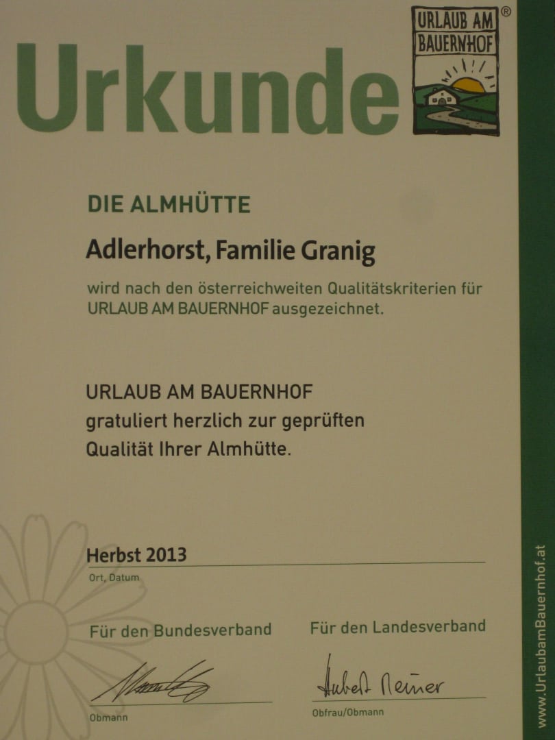 Die Almhütte Adlerhorst wurde vor einigen Jahren neu erbaut und verfügt über zwei Balkone, eine Wohnküche mit gemütlicher Sitzecke, einem Holzherd und einer voll ausgestatteten Küchenzeile. Im Parterre befinden sich die Küche, das Bad und ein Doppelbettzimmer. Über eine Treppe gelangt man in den ersten Stock, wo sich zwei Familienzimmer befinden. Die Almhütte verfügt über Netzstromanschluss (inkl. elektrischen Licht, E-Herd, Kühlschrank und E-Boiler). Sie zeichnet sich durch ein biologisches Raumklima aufgrund der Lärchenholzbauweise und der Vollholz-Innenausstattung aus. Eine große eingezäunte Hüttenwiese (inkl. Sitzgarnitur und Griller) stehen ebenfalls zur Verfügung.