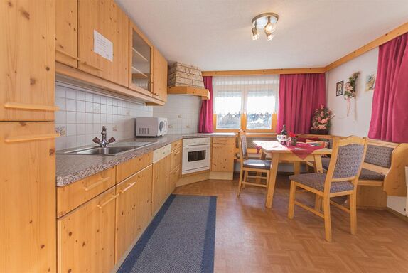 Appartement (ca. 58m²) mit 2 Schlafzimmern (1x Dreibettzimmer, 1 Doppelzimmer inkl. Kabel-TV), Bad mit Waschbecken u. Badewanne, separates WC, kleiner Vorraum, Wohnküche mit Flat-TV und Essecke, Küchenblock (4 Plattenherd, Mikrowelle, Toaster, Geschirrspüler, Backrohr, Kaffeemaschine, Wasserkocher), Waschmaschine zur freien Benutzung, großzügige Terrasse, W-Lan kostenlos.