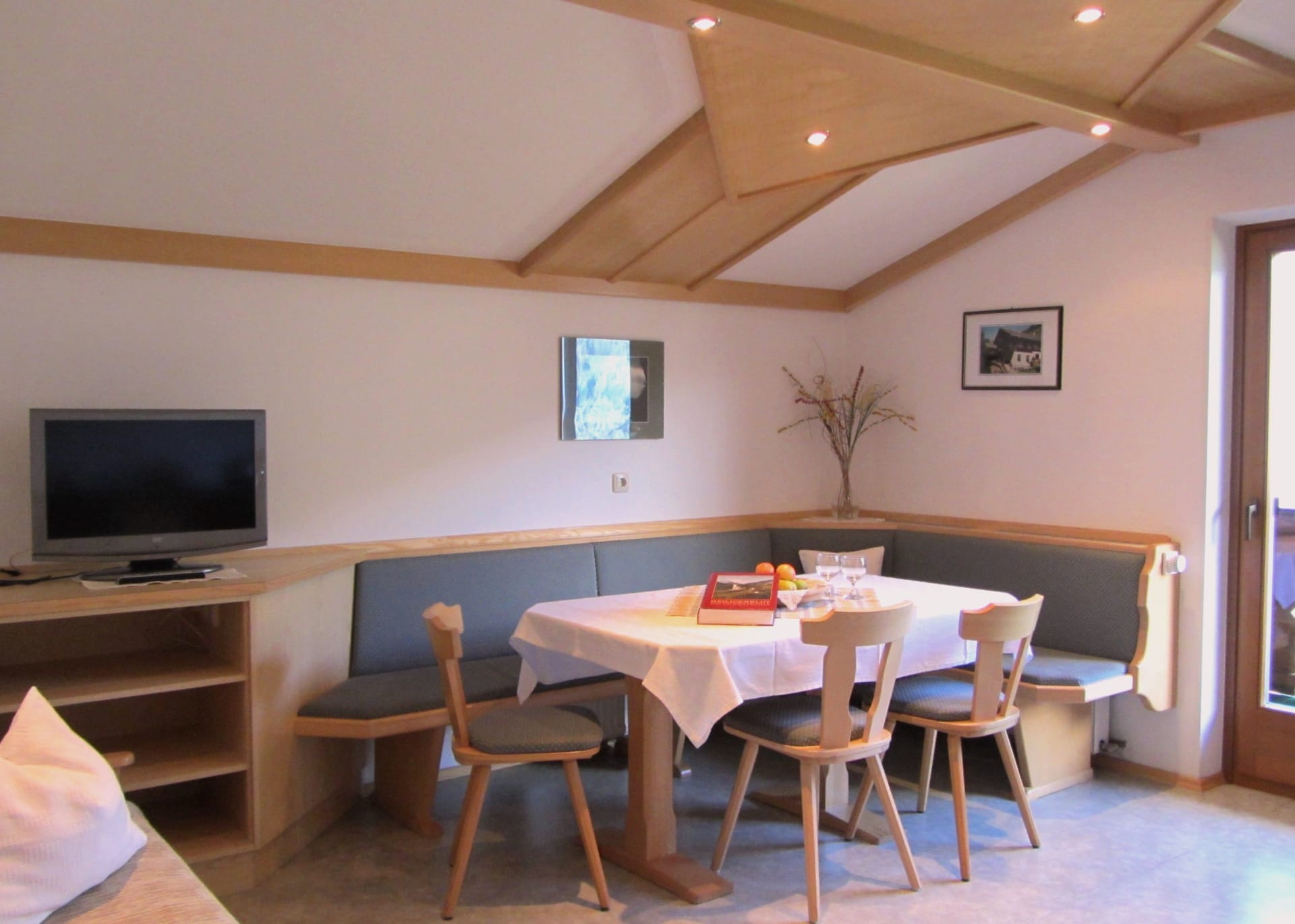 • Küche - voll ausgestattet: Geschirrspüler, Cerankochfeld, Backrohr, Kühlschrank mit Gefrierfach, Filterkaffeemaschine, Wasserkocher, Ess- und Kochgeschirr, Gläser, Besteck; große Sitzecke mit Ausziehtisch;