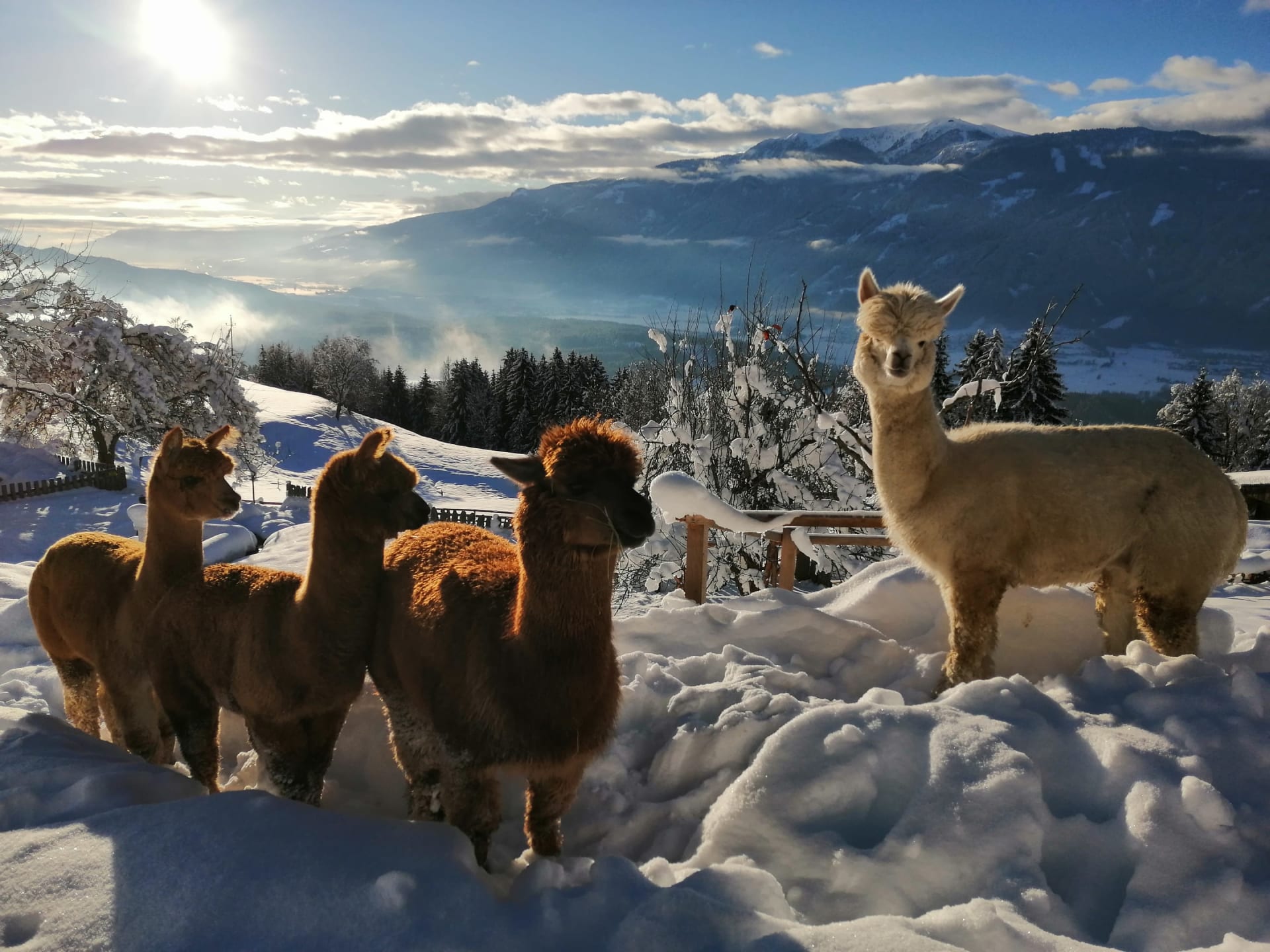 Morgens ist es auf fast 1000 Metern Seehöhe auch im Winter ein Traum. Das ist die richtige Zeit um mit den Alpakas auf Wanderschaft zu gehen. Es werden die Halfter angelegt und dann geht’s schon los. Die Alpakas werden an der Leine geführt, reiten kann man auf ihnen nicht.