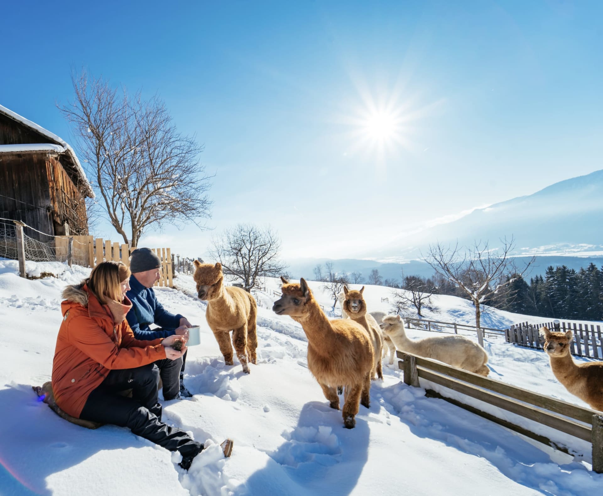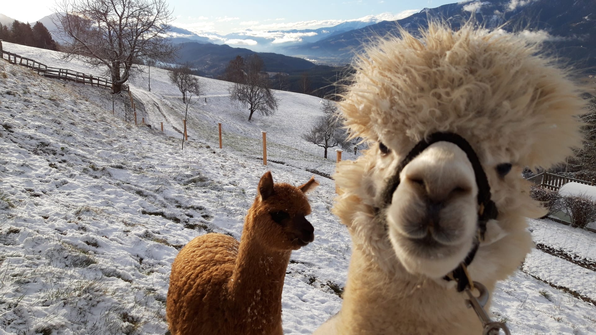 Morgens ist es auf fast 1000 Metern Seehöhe auch im Winter ein Traum. Das ist die richtige Zeit um mit den Alpakas auf Wanderschaft zu gehen. Es werden die Halfter angelegt und dann geht’s schon los. Die Alpakas werden an der Leine geführt, reiten kann man auf ihnen nicht.
