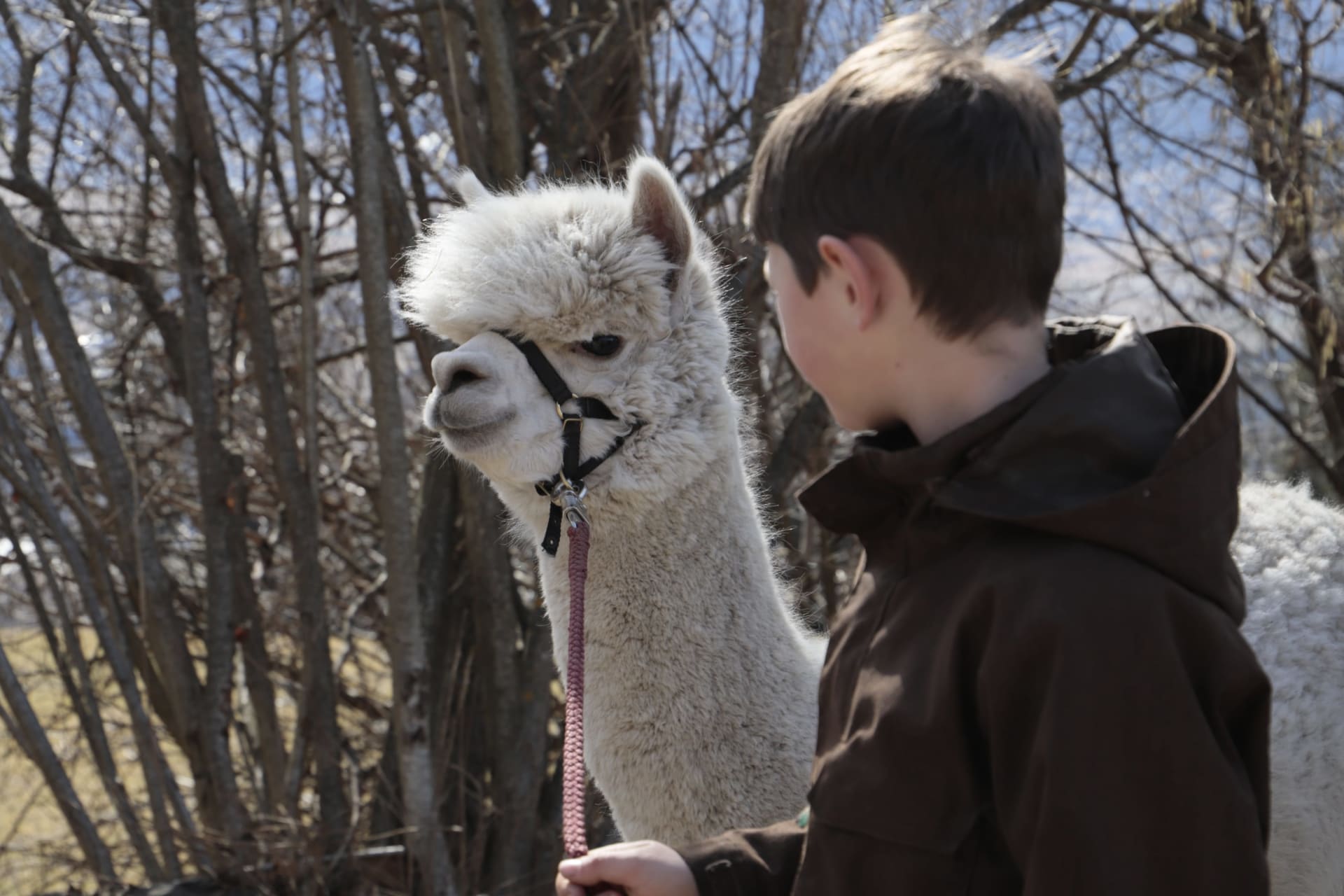 Morgens ist es auf fast 1000 Metern Seehöhe auch im Winter ein Traum. Das ist die richtige Zeit um mit den Alpakas auf Wanderschaft zu gehen. Es werden die Halfter angelegt und dann geht’s schon los. Die Alpakas werden an der Leine geführt, reiten kann man auf ihnen nicht.
