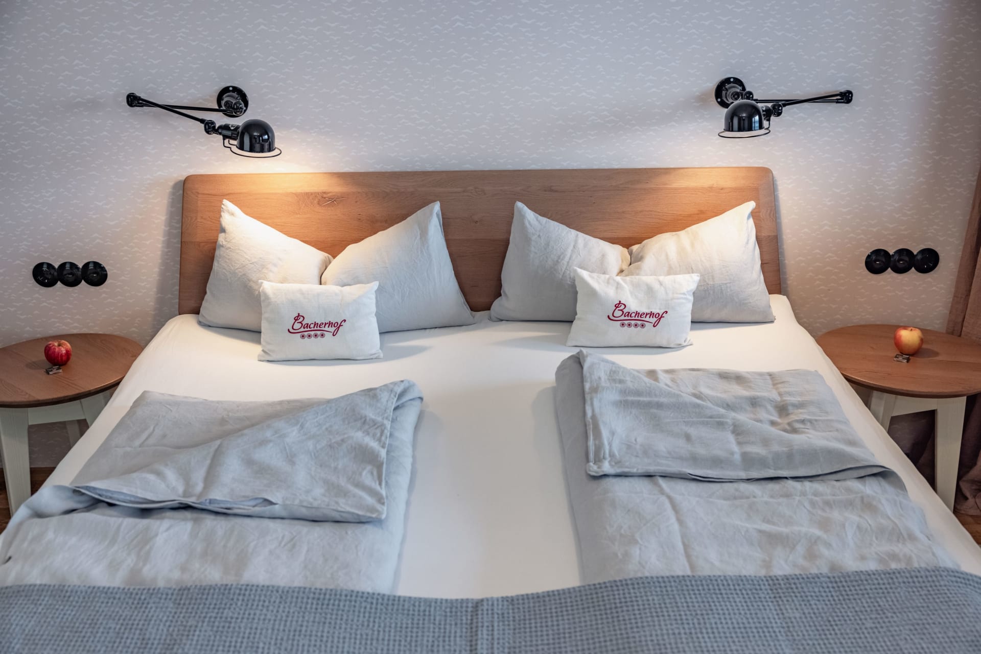 Zimmer zum Träumen... Licht, Ruhe, Panoramablick auf den See und die umliegende Bergwelt und eine Großpackung Gemütlichkeit. Das sind die wichtigsten Zutaten für dein Wohnerlebnis am Bacherhof.
