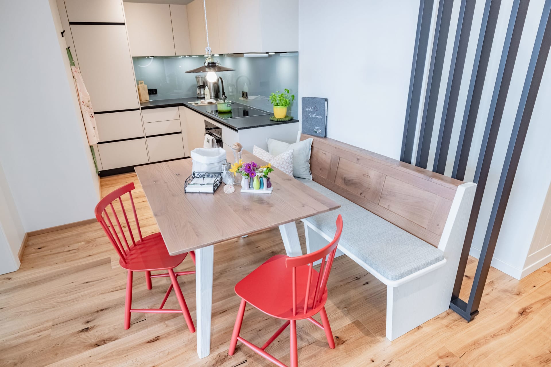 Freut euch auf euer Wohnerlebnis in unserer neuen Weitblick-Suite! Dieses stilvolle Zweiraumappartement im ersten Stock bietet auf 43m² eine hochwertige Ausstattung mit edlen Vollholzmöbeln und Echtholzböden. Das separate Schlafzimmer mit feiner Leinenbettwäsche und eigenem westseitigen Balkon sowie eine helle Wohnküche mit zusätzlicher Schlafcouch sorgen für ein großzügiges Raumkonzept. Genießt den atemberaubenden Panoramablick auf den See und die Berge von eurem ganz privaten 10m² großen überdachten, südseitigen Balkon. Zur Ausstattung gehören Sat-TV, ein modernes Badezimmer mit geräumiger Dusche und WLAN. Der Preis beinhaltet die Millstätter-Inclusive-Card, die euch den kostenlosen Zugang zu Strandbädern, Mautstraßen und weiteren Angeboten der Region ermöglicht.