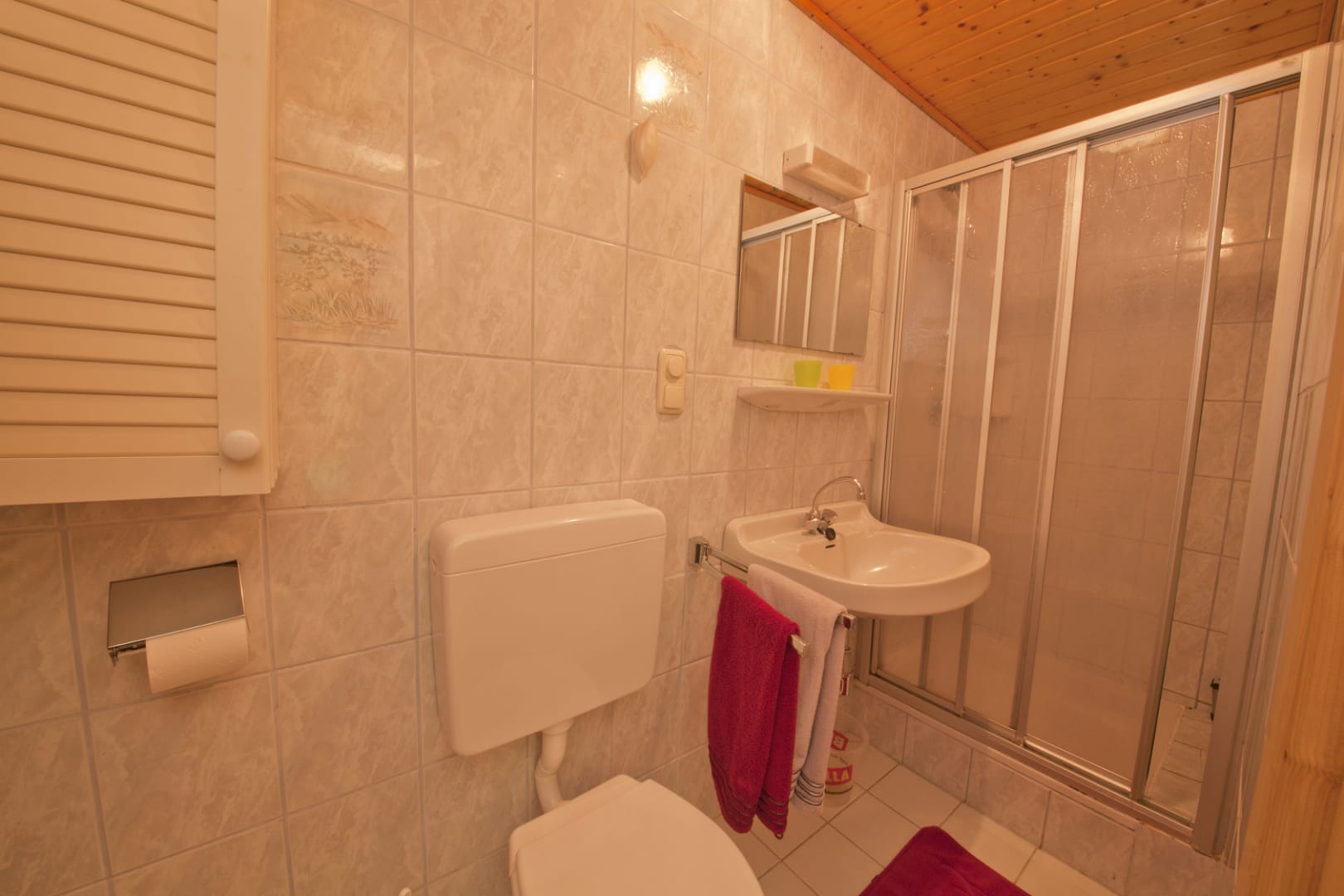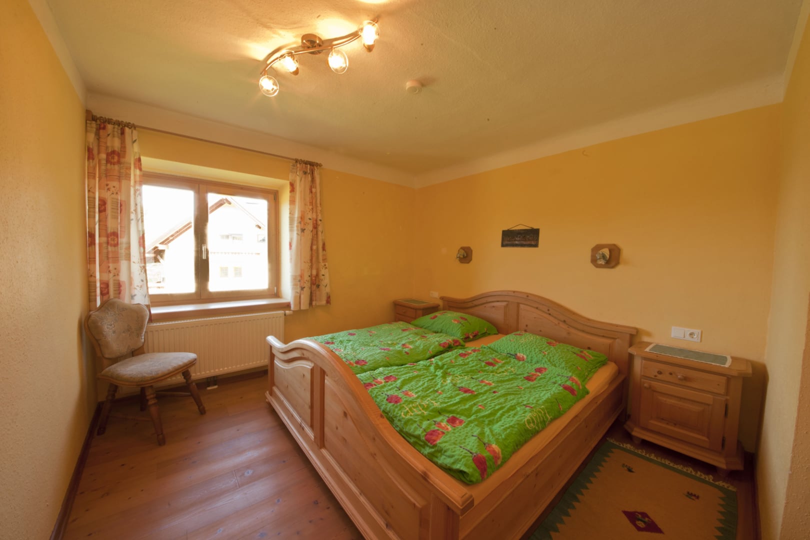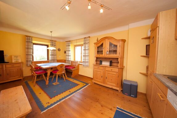Wohnung mit Balkon im 1. Stock des Bauernhauses, 2 Schlafzimmer, Kinderzimmer mit Stockbett und Einzelbett, 2 Bäder mit Dusche/WC, geräumiges Wohn-Esszimmer mit Sat-TV, Essecke, Doppelschlafcouch, offene Küche mit Geschirrspüler, E-Herd mit Backofen, Kaffeemaschine, Wasserkocher, Kühlschrank mit Eisfach, Geschirr/Besteck/Töpfe etc. sind vorhanden.