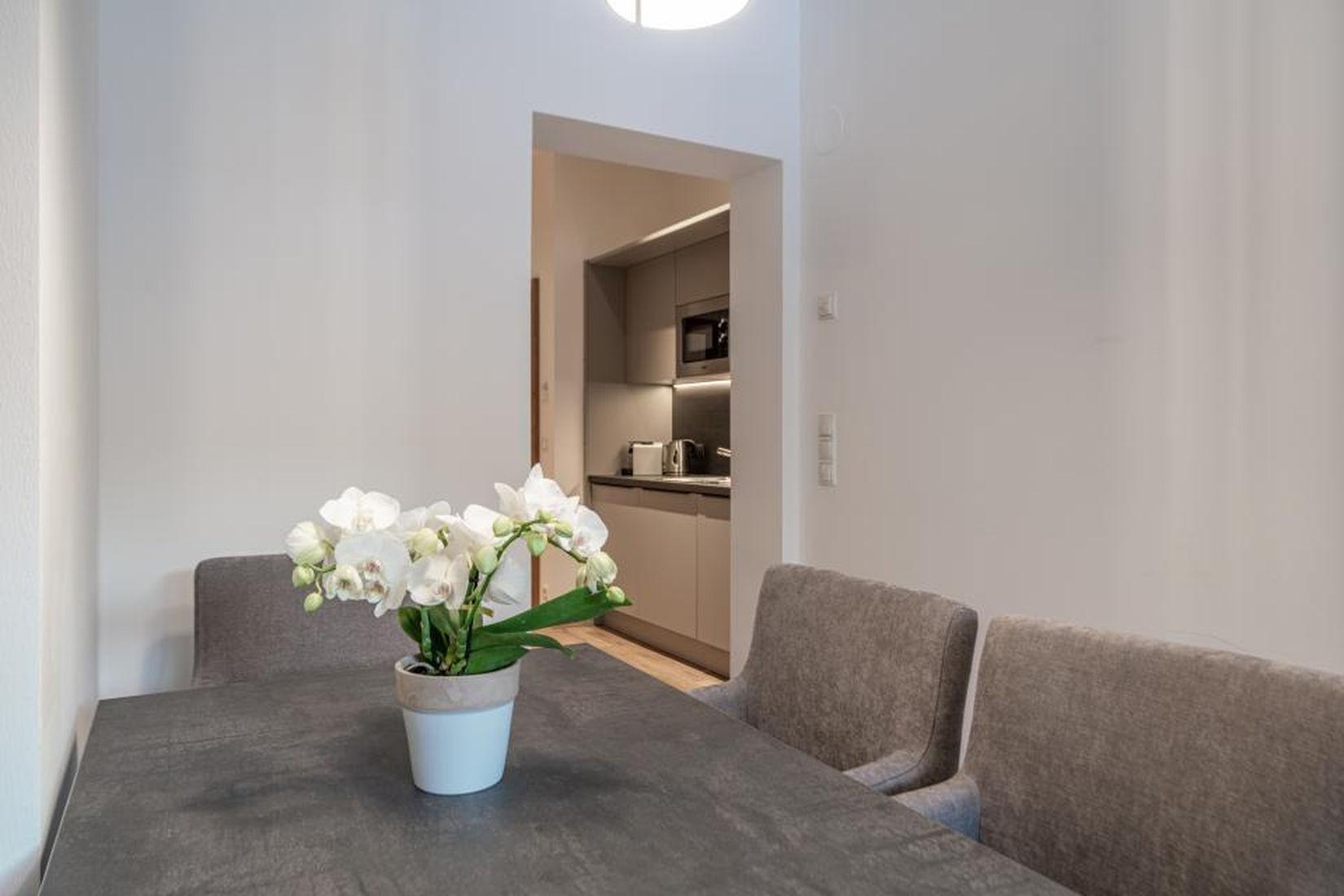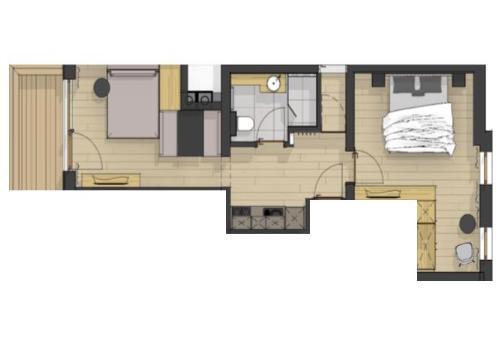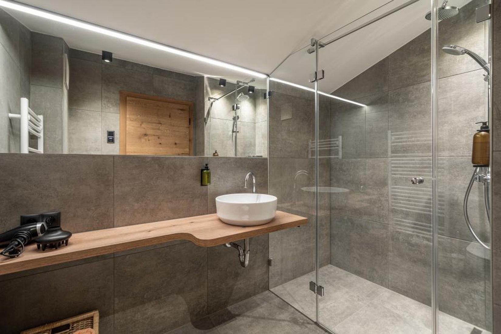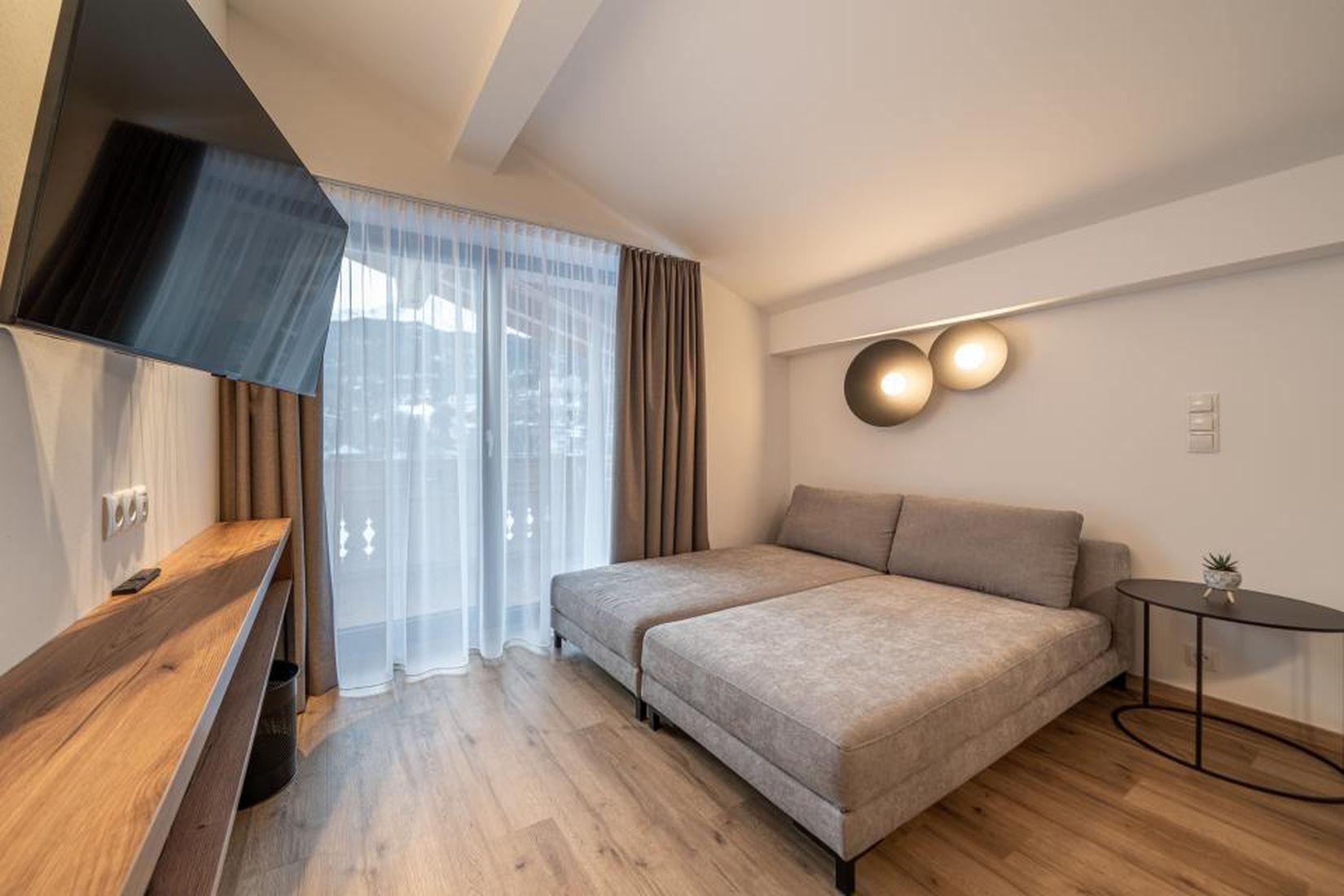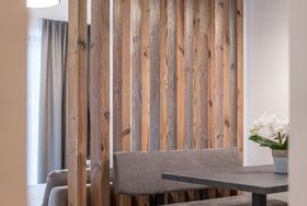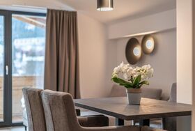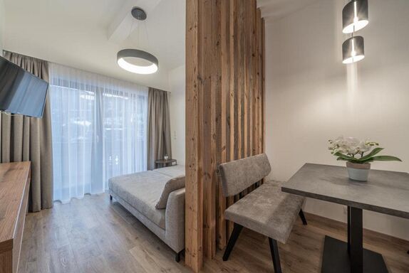 Gemütliches Appartement Enzian im modernen, alpinen Stil. 1 Doppelzimmer mit Boxspringbett. Wohnküche mit Essbereich, großzügigem Sofa (Schlafmöglichkeit für 2 weitere Personen), Smart-TV, Safe, voll ausgestattete Küchenzeile mit Kühlschrank mit Gefrierfach, Ceran-Kochfeld, Mikrowelle, Kapsel-Kaffeemaschine und Wasserkocher. Badezimmer mit Regendusche, WC, Handtuchtrockner und Fön. Balkon mit Bergblick. Größe ca. 42 m²