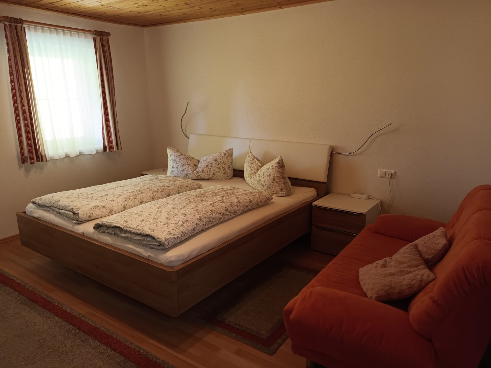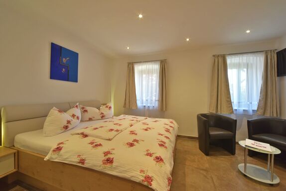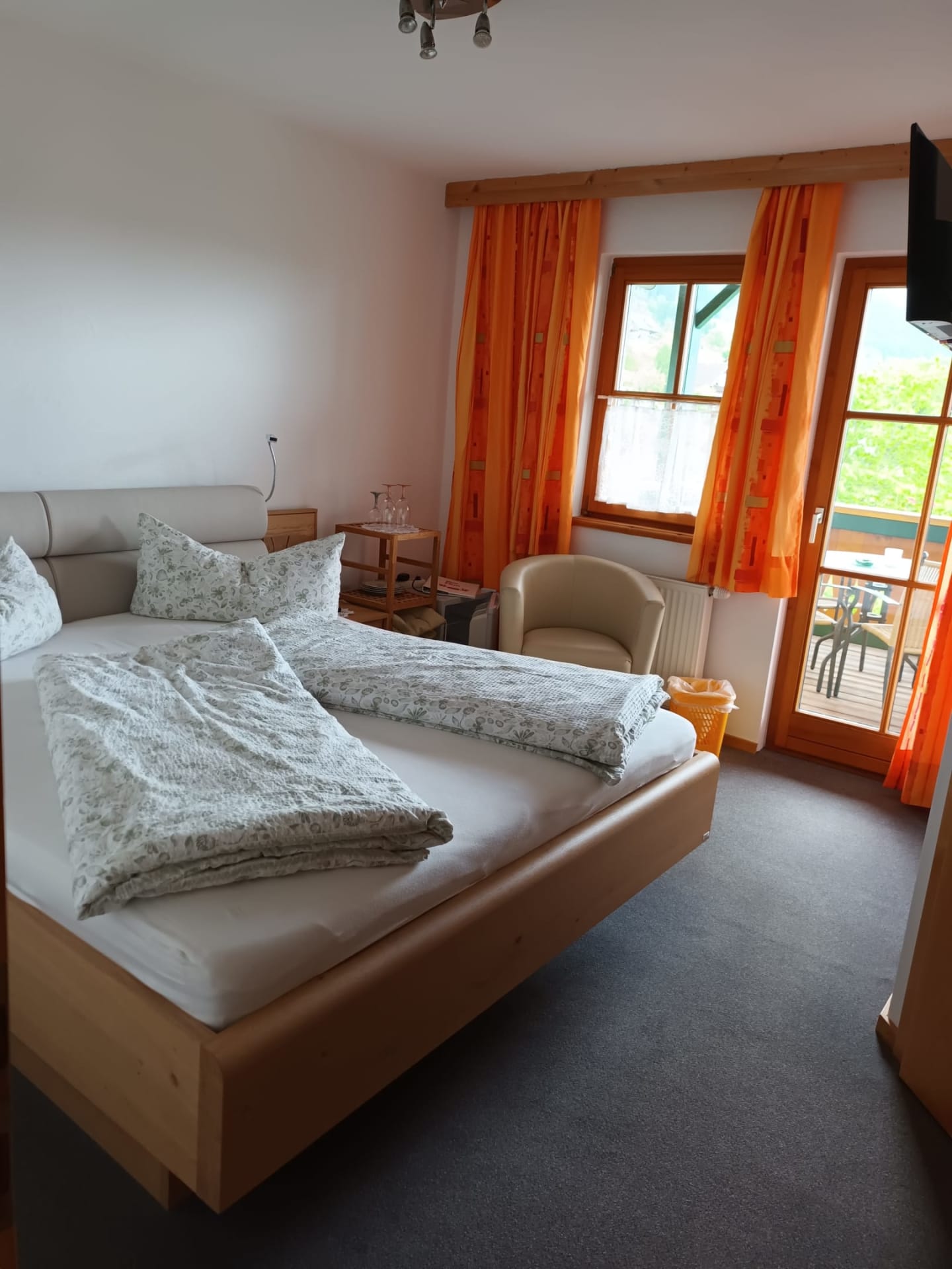 Das 2021 neu renovierte Doppelzimmer befindet sich im Erdgeschoss unseres Bauernhauses und verfügt über ein geräumiges Badezimmer mit Dusche sowie einem Doppelbett und zwei gemütlichen Sessel. Unsere Gäste schätzen vor allem die Nähe zum Garten mit gemütlicher Sitzecke.