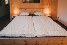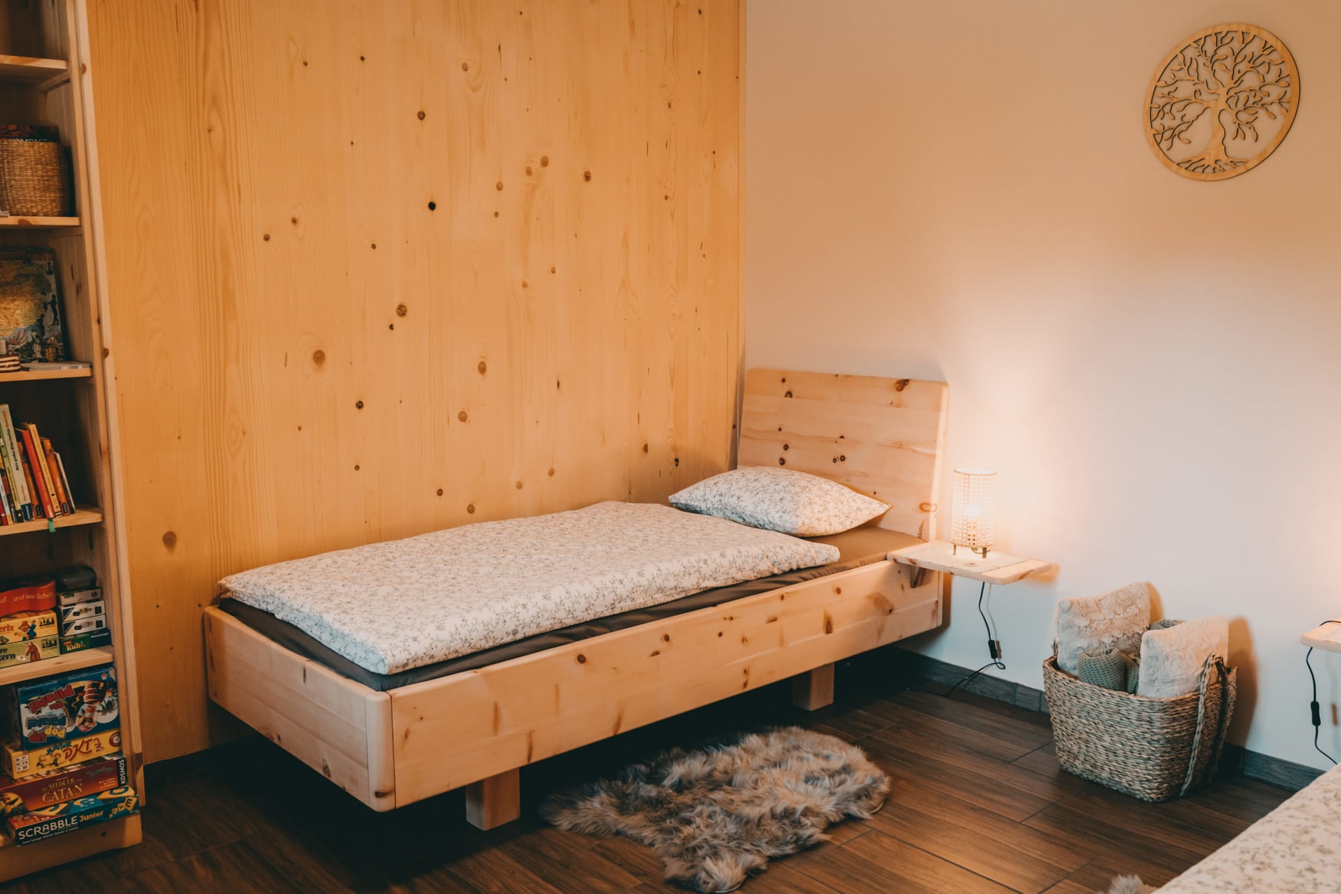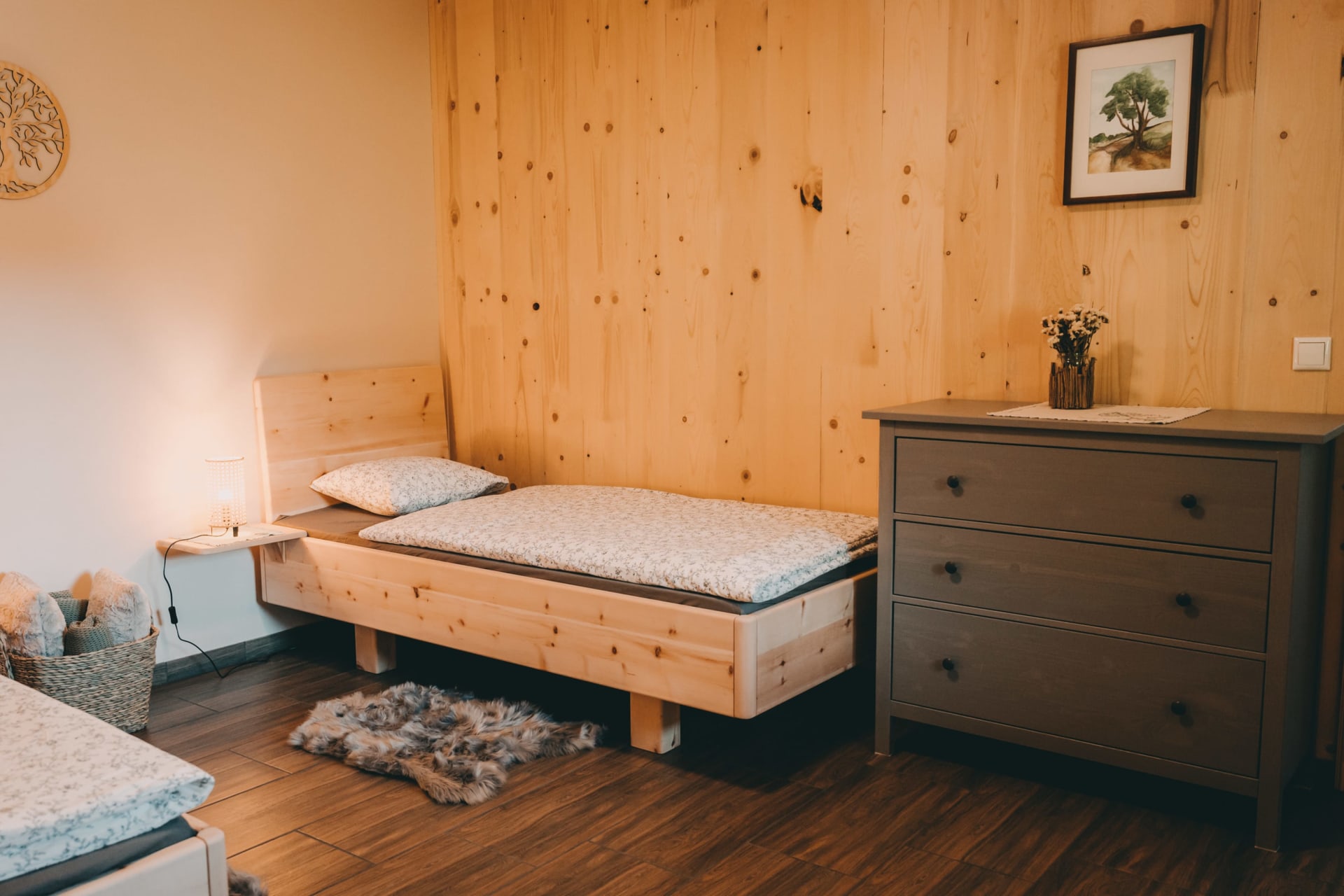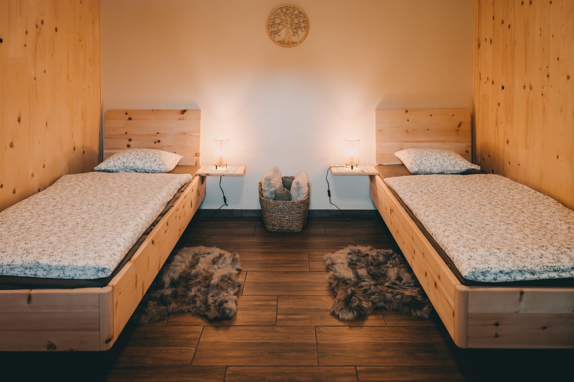 • Schlafzimmer mit zwei Einzelbetten aus Zirbenholz (können bei Bedarf zusammengeschoben werden als Doppelbett)