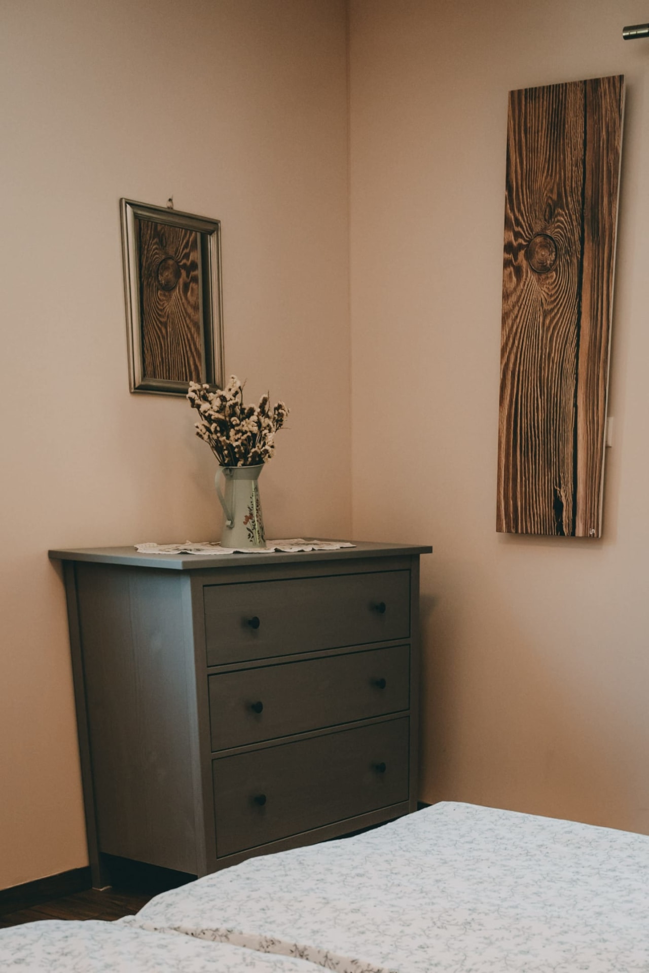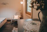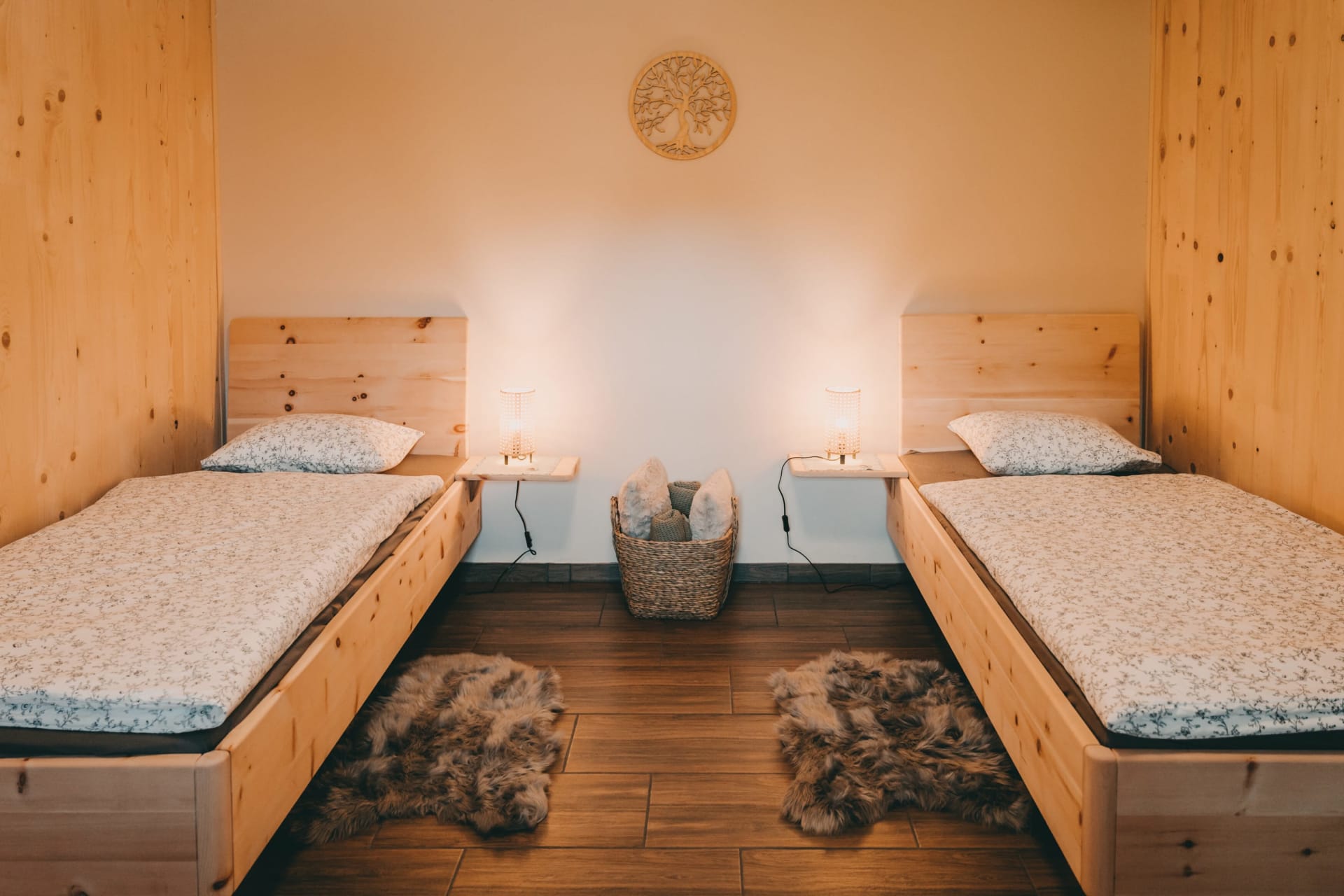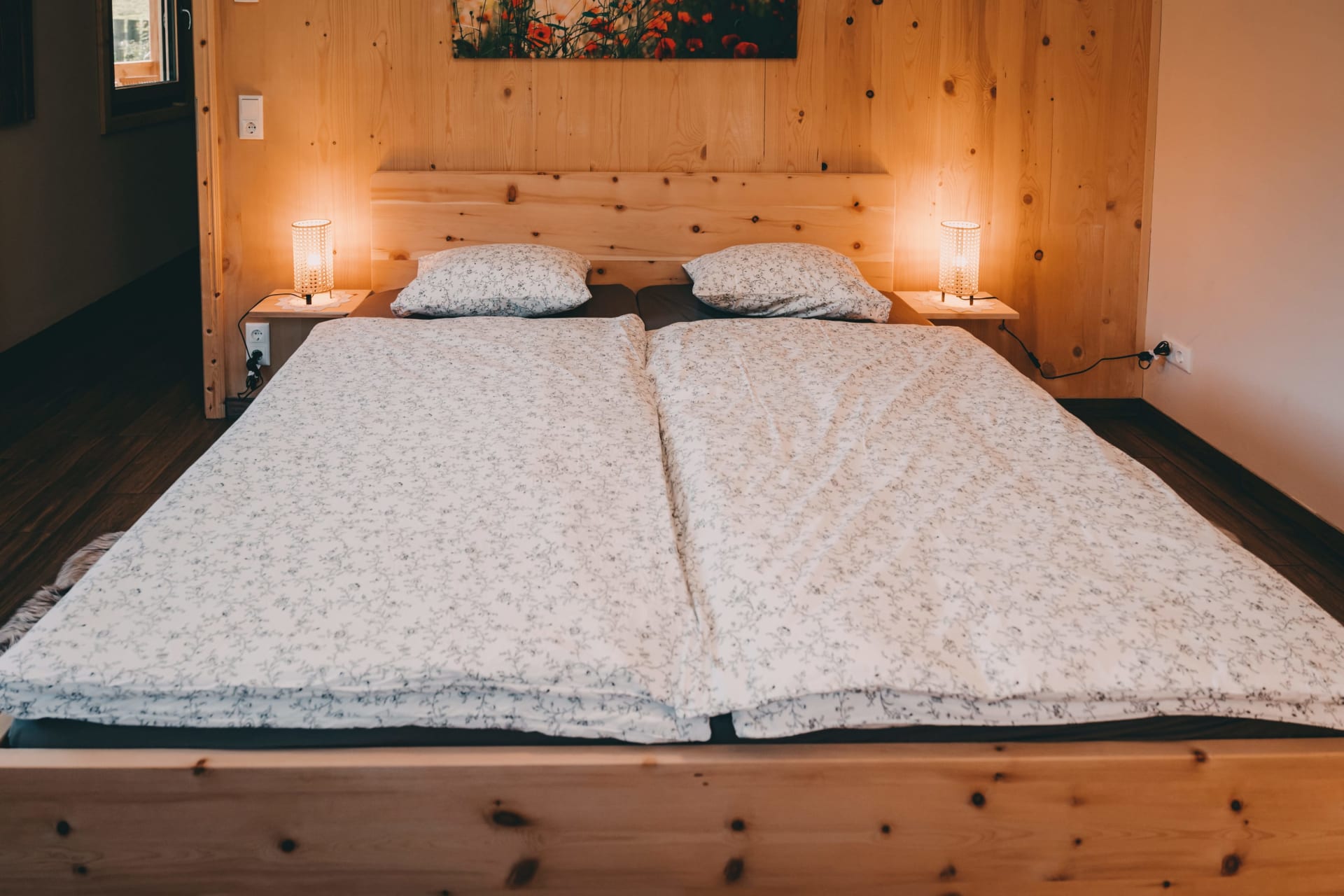 • Schlafzimmer mit zwei Einzelbetten aus Zirbenholz (können bei Bedarf zusammengeschoben werden als Doppelbett)
